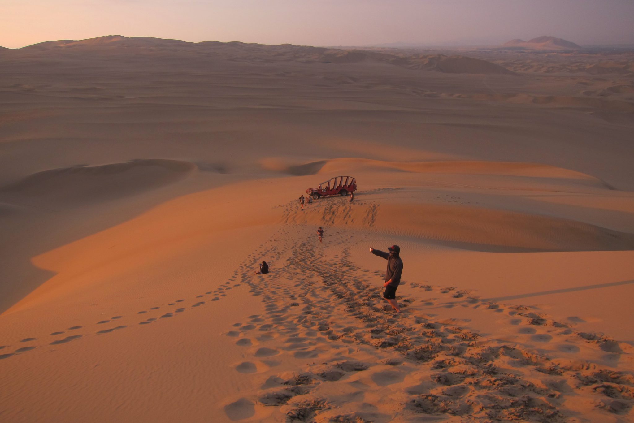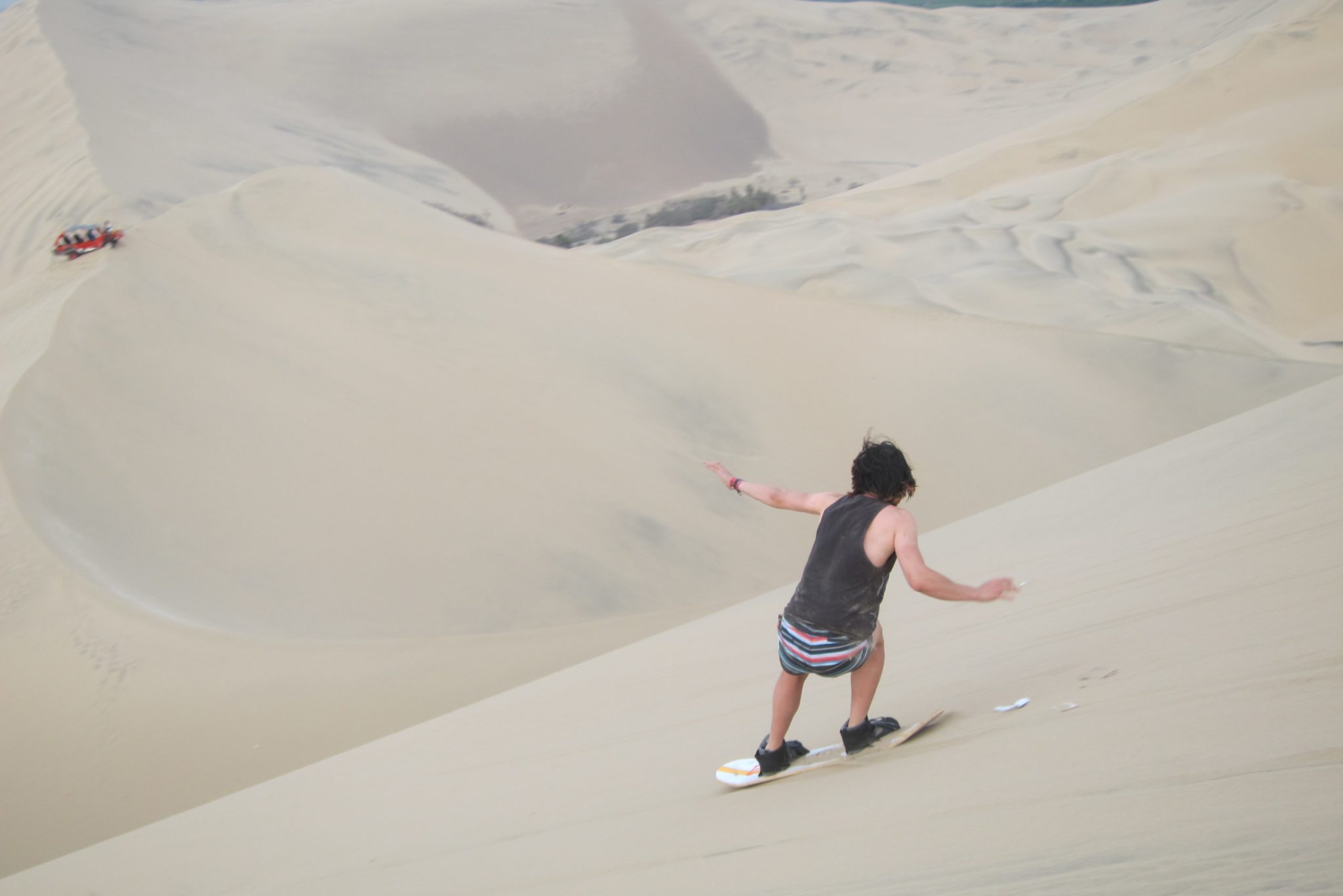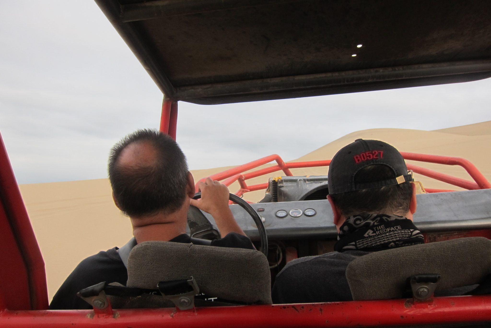 Kad atgriežamies, Ali jau ir priekšā – lidojums esot bijis lielisks. Lai arī mums smiltis birst no visām vietām, dušā iet nav jēgas – pēc stundas dodamies izbraukumā ar bagiju pa kāpām un sandbordingu. Mazliet atpūšamies un tad jau arī laiks šodienas piedzīvojumam. Šoferis uz braucienu ierodas ar četrām lielām baltām svecēm. “Kam tās ir domātas?”, mēs prasām. “Esmu katolis un šis ir bīstams brauciens”, nosaka šoferis. Piesprādzējamies un laižam tuksnesī. Šodien Džouvī uznākušas vides saudzēšanas rūpes un viņš drusku “pavaimanā” par tēmu. Es piekrītu, ka gluži nevainīgs šis pasākums nav, bet jautrs gan, to grūti noliegt.