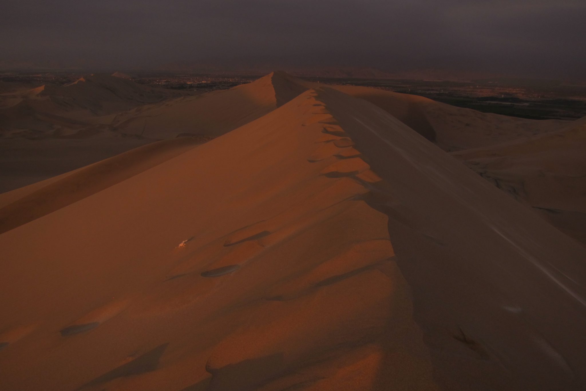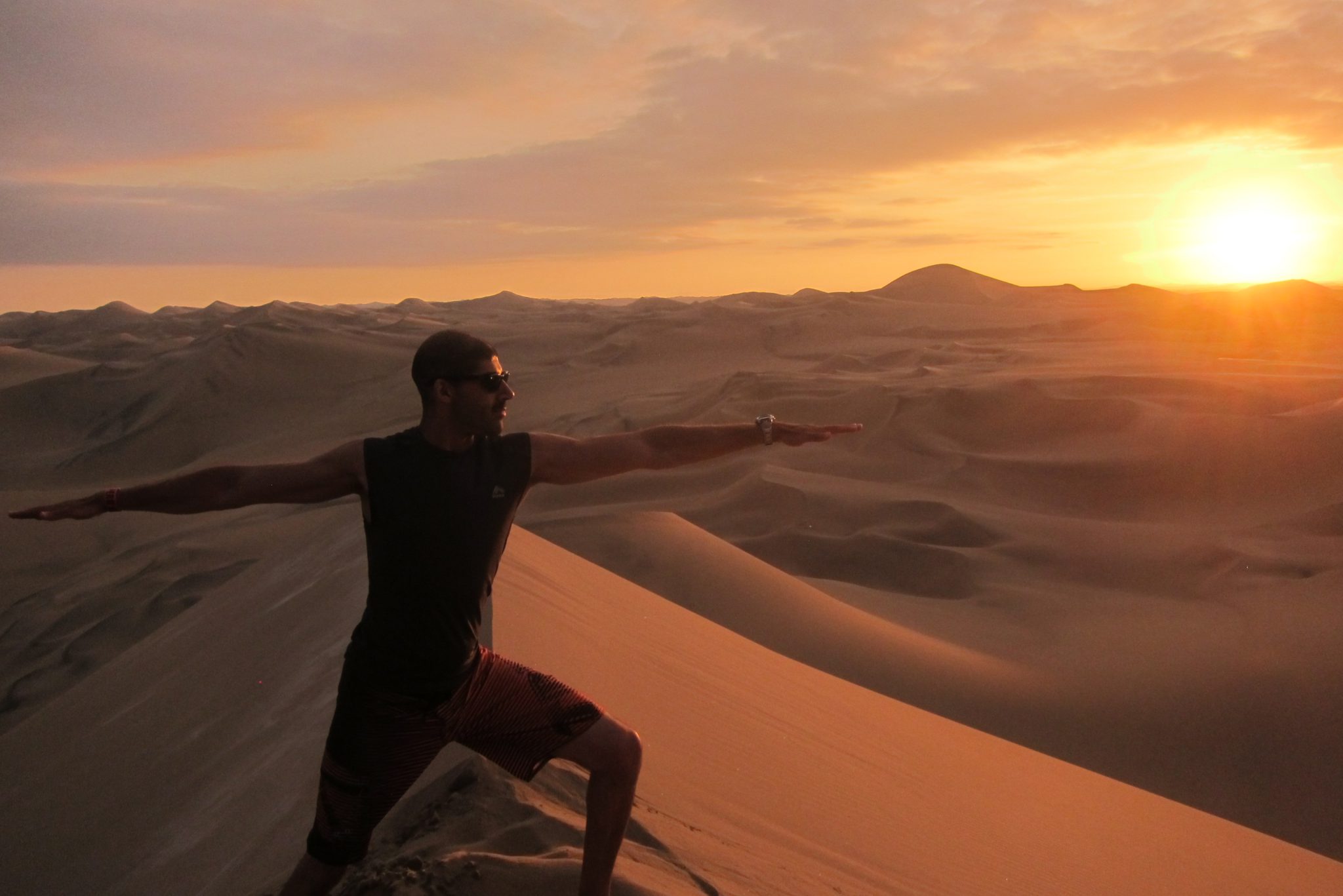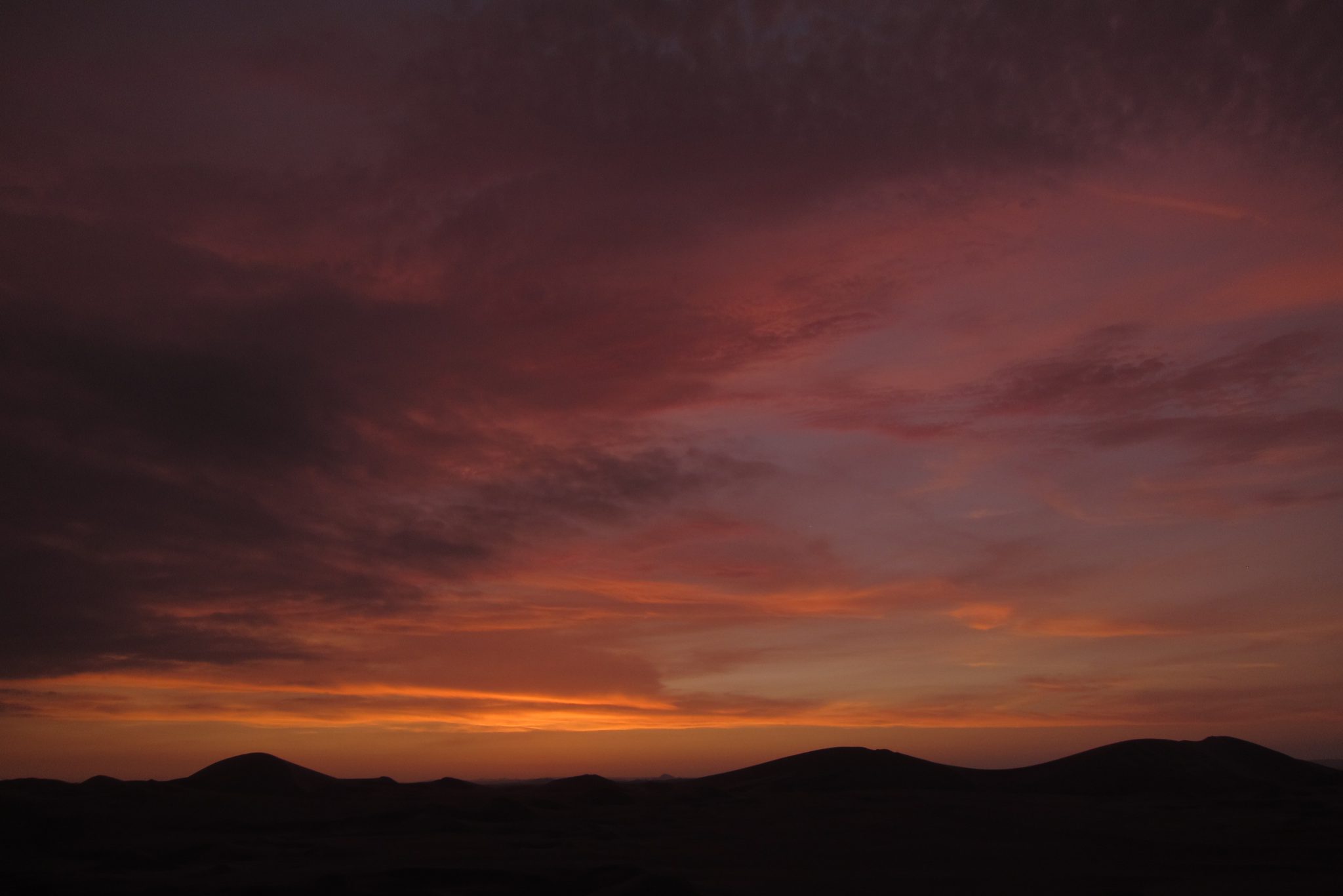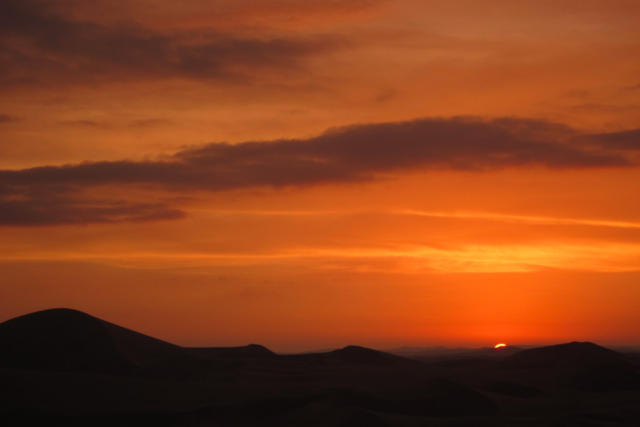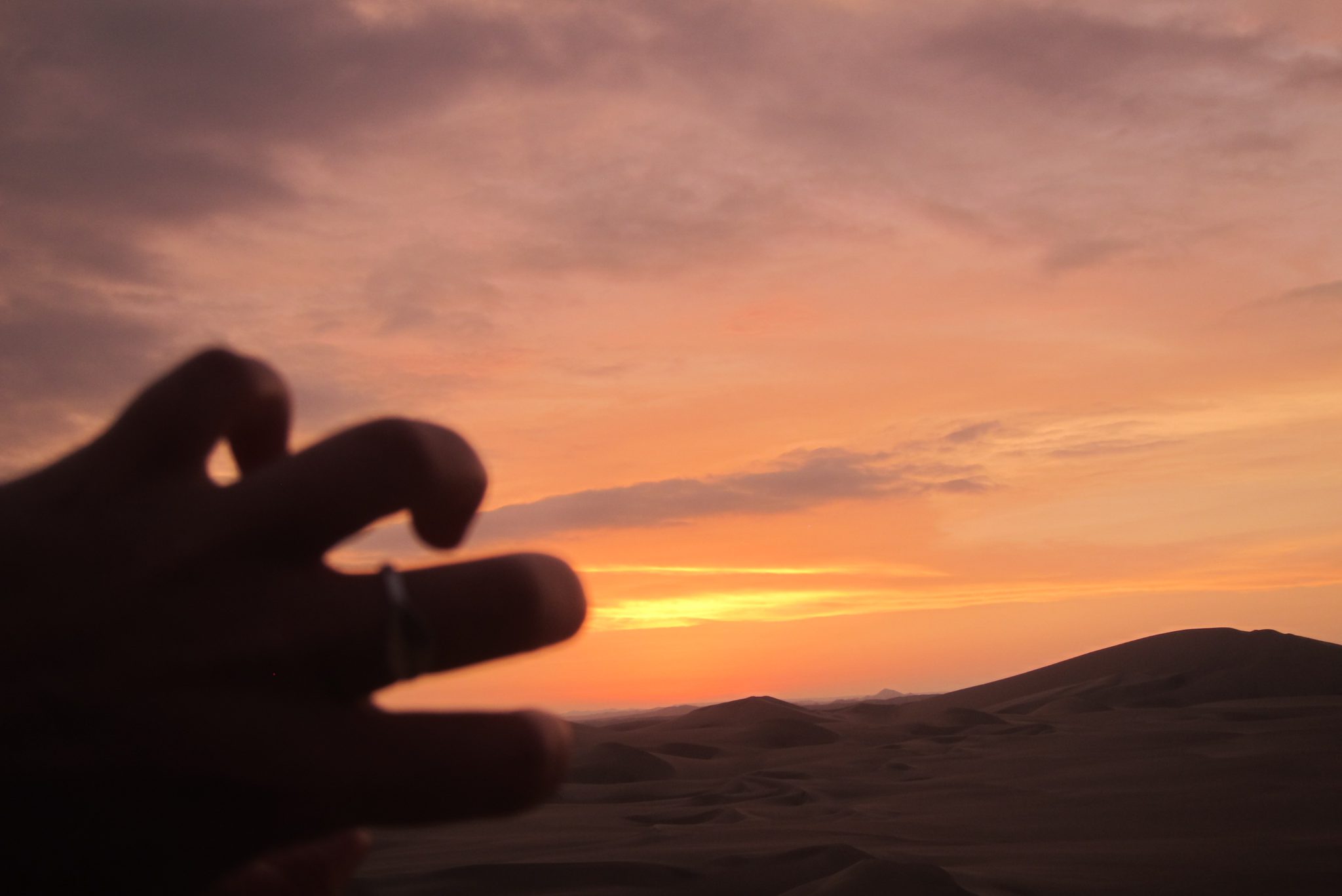 Smilšu sērfošana ir noslēgusies un mēs sakāpjam atpakaļ bagijā, mums priekšā pēdējā izbrauciena sadaļa – saulriets. Saule jau tuvojas horizontam, pārvēršot smilšu kalnus zeltā. Mēs uzkāpjam augstākajā kāpā – sākumā fotografējamies uz nebēdu, bet pēc tam apsēžamies un vērojam kā sarkanā ripa pazūd aiz kalniem – un viņa to dara ātri. Izrāde ir beigusies, kāpjam atpakaļ braucamajā un atgriežamies oāzē. Pēc ātras dušas satiekamies uz kopīgām vakariņām – vienai no meitenēm, Sesiljai no ASV, šodien paliek 30. Tā ir pirmā reize, kad viņa dzimšanas dienu sagaida ārpus savas valsts. Kādā brīdī puiši parūpējas par apgaismojuma samazināšanu, bārmenis atnes greznu zemeņu dzērienu un degošu sveci, mēs nodziedam “happy birthday” – viss ir kā nākas.