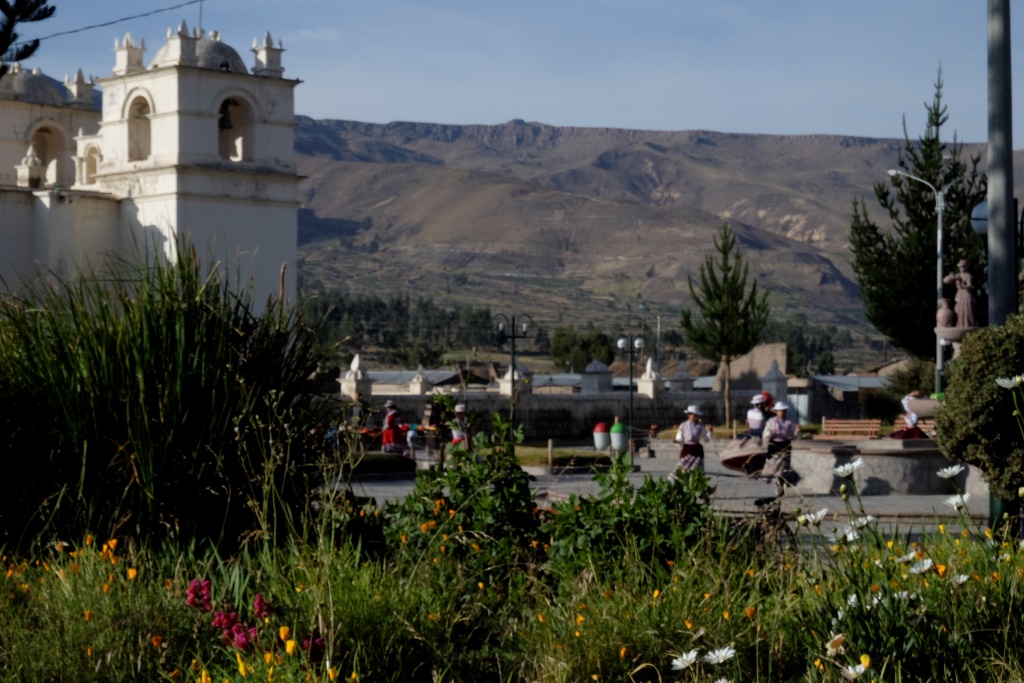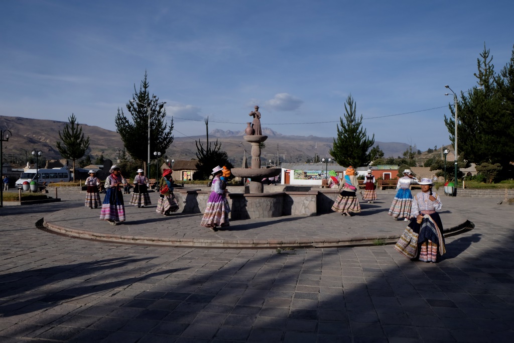 Agri no rīta ieturam brokastis un mazliet pēc sešiem rītā dodamies ceļā – no rītiem esot lielākas izredzes redzēt kondorus. Iesākumā mēs gan pieturam nelielā pilsētā, kuras centrālajā skvērā ap strūklaku virpuļo sievietes nacionālos tērpos. „Tourist trap”, mēs saskatāmies. Jā, drīz vien viena no viņām pievirpuļo ar māla krūzīti pie tūristiem – metiet naudiņas, metiet. Esmu nobildējusi „priekšnesumu” un godīgi iemetu savu artavu.