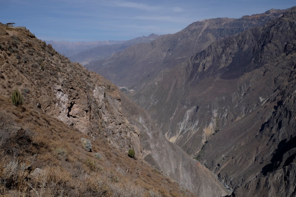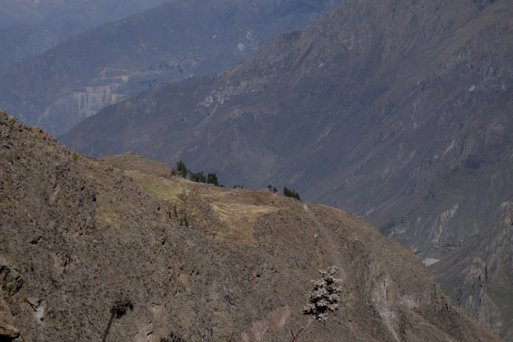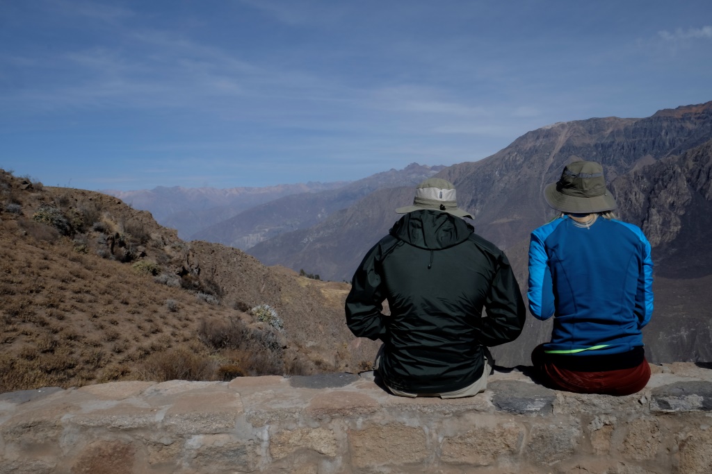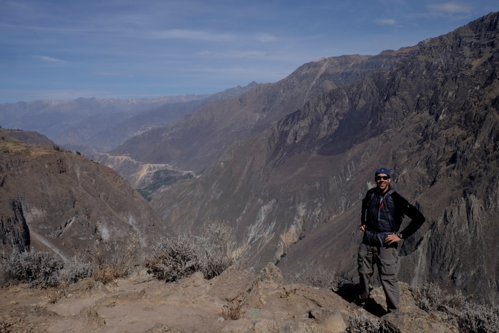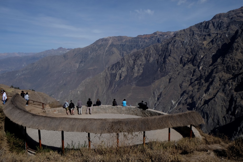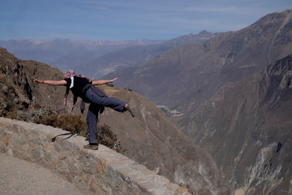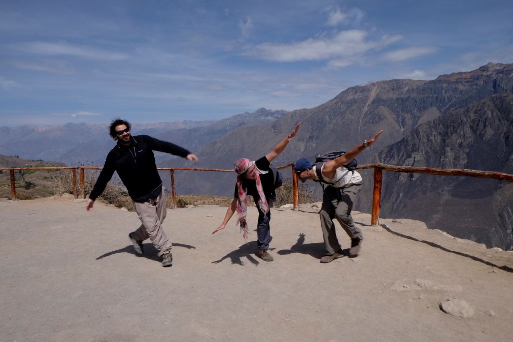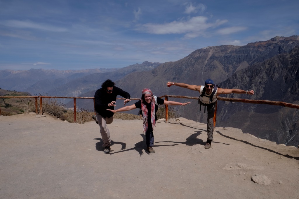 Ar vēl pāris apstāšanās pauzēm nonākam pie Kondoru krusta – šī esot laba vieta, no kuras vērot kondorus. Izskatās, ka tā domā visi tūrisma kantori, jo šajā vietā salidojuši lielu un mazu autobusu pūļi. Mēs ar Ali nolemjam vismaz nedaudz aizmukt no ļaužu masām un dodamies prom pa nelielu taciņu, kas ved gar kanjona malu. Jo tālāk tiekam, jo labāki skati paveras. Kanjons ir patiesi iespaidīgs un mēs esam diezgan sarūgtināti, ka esam netīšām nokļuvuši pilnīgā tūristu pasākumā – rezervējot ekskursiju mēs visi bijām domājuši, ka tas būs divu dienu pārgājiens pa kanjonu, bet tagad mums ir tikai pāris stundas, lai pavērtos uz to no augšas. Labi, labi, pietiek žēloties, jābauda to, kas ir. Jā, piecus kondorus no tālienes arī redzējām. Un, protams, izveicām paši savu „kondoru” fotosesiju.