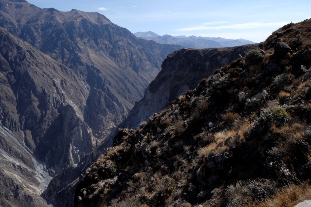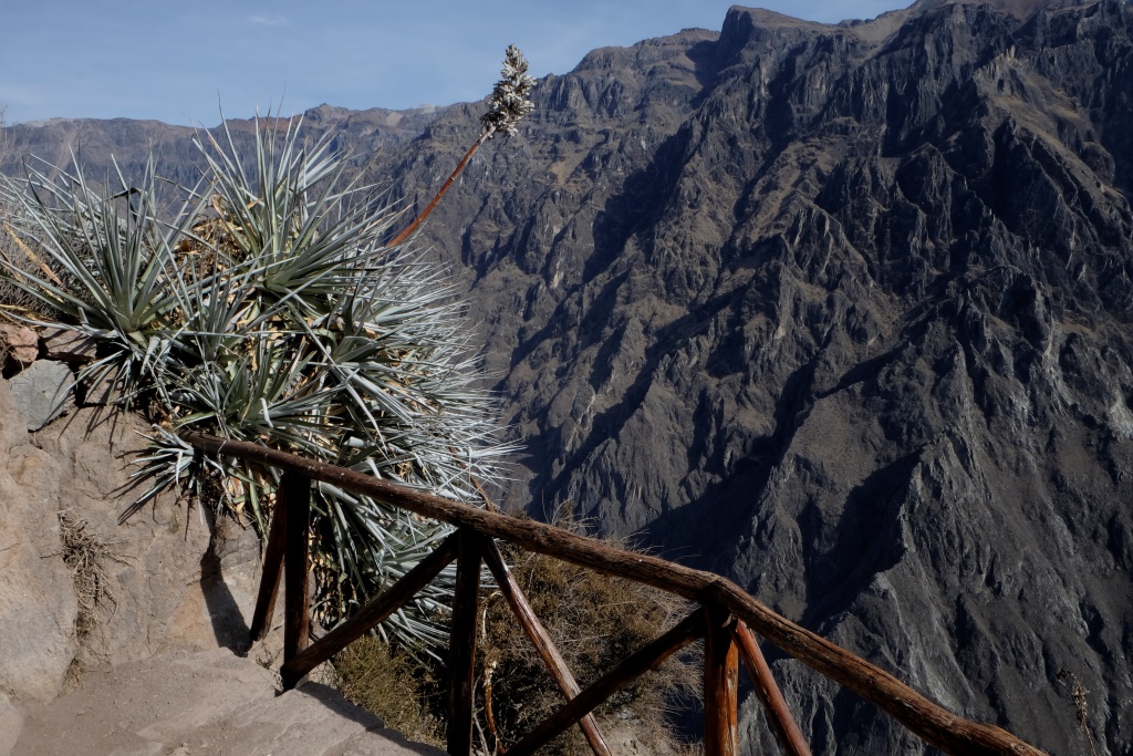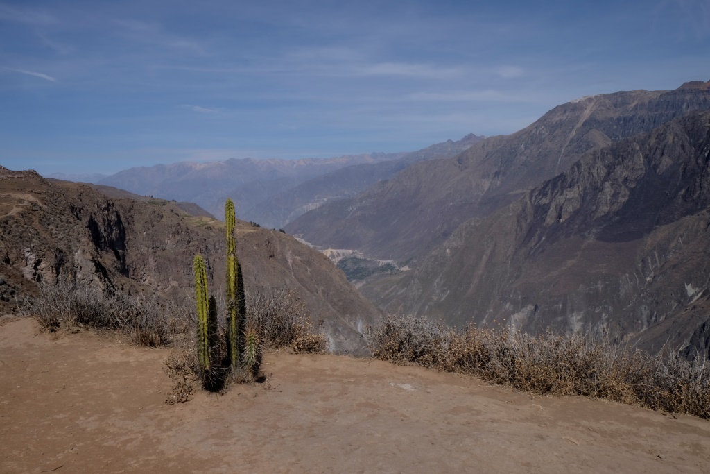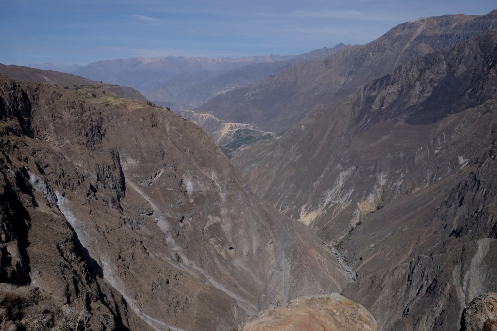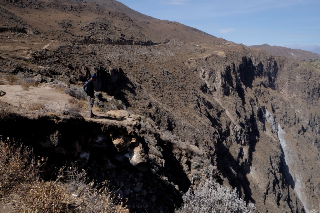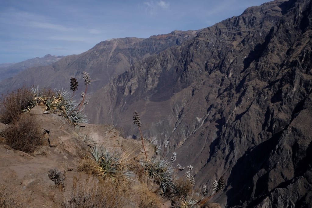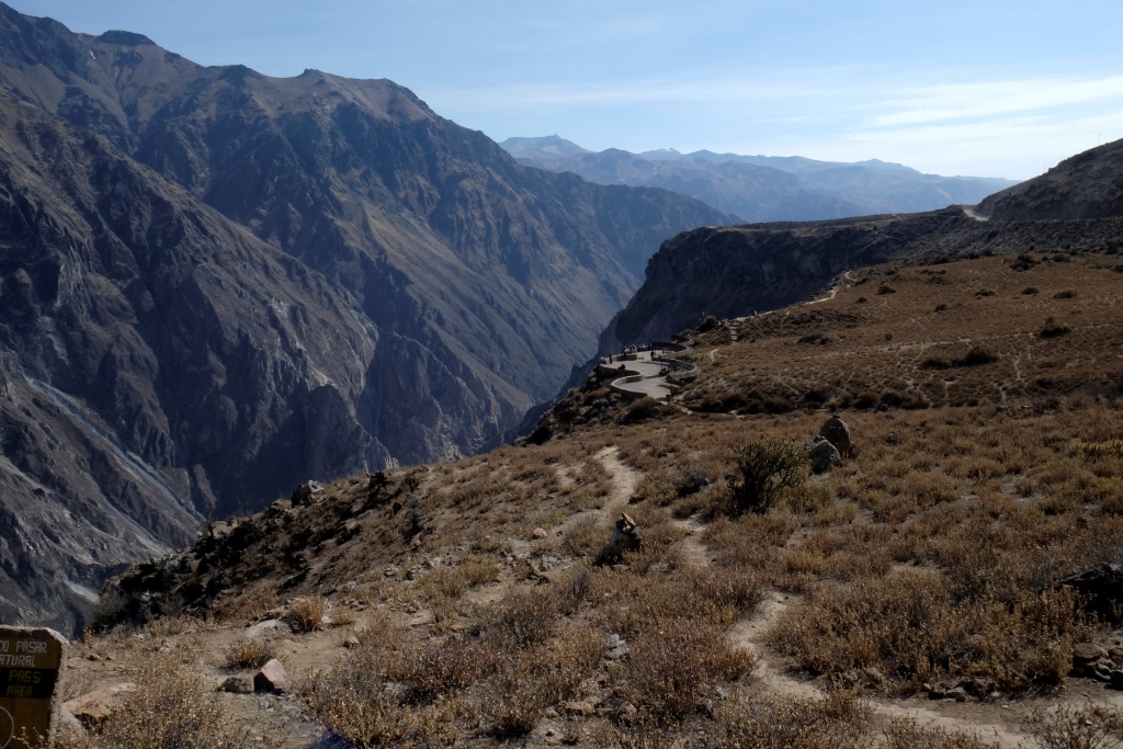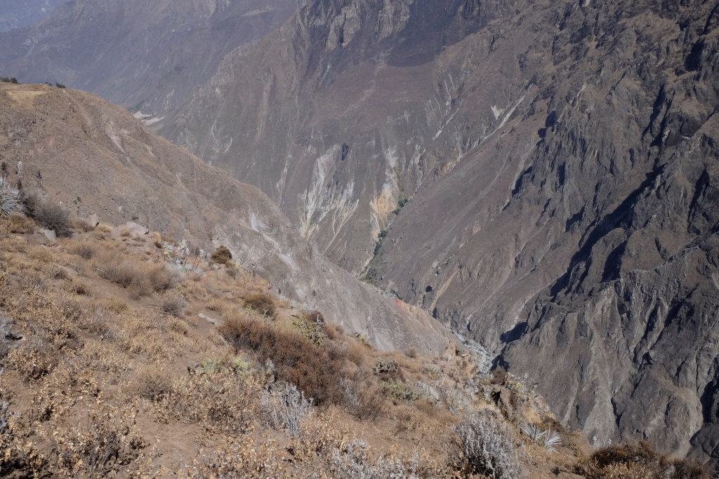 Ar vēl pāris apstāšanās pauzēm nonākam pie Kondoru krusta – šī esot laba vieta, no kuras vērot kondorus. Izskatās, ka tā domā visi tūrisma kantori, jo šajā vietā salidojuši lielu un mazu autobusu pūļi. Mēs ar Ali nolemjam vismaz nedaudz aizmukt no ļaužu masām un dodamies prom pa nelielu taciņu, kas ved gar kanjona malu. Jo tālāk tiekam, jo labāki skati paveras. Kanjons ir patiesi iespaidīgs un mēs esam diezgan sarūgtināti, ka esam netīšām nokļuvuši pilnīgā tūristu pasākumā – rezervējot ekskursiju mēs visi bijām domājuši, ka tas būs divu dienu pārgājiens pa kanjonu, bet tagad mums ir tikai pāris stundas, lai pavērtos uz to no augšas. Labi, labi, pietiek žēloties, jābauda to, kas ir. Jā, piecus kondorus no tālienes arī redzējām. Un, protams, izveicām paši savu „kondoru” fotosesiju.