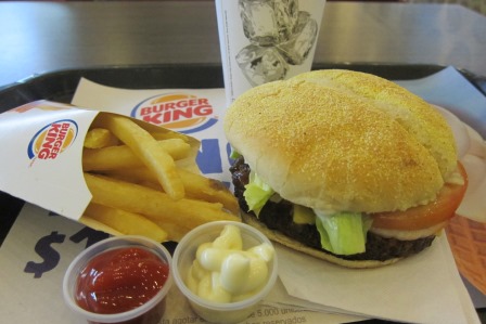 Pāris stundas nomocījusi Bogotas internetu, jūtos nopelnījusi Ziemassvētku vakariņas. Ēdienu placis piedāvā izvēlēties starp divām burgeru, vienu suši un vienu normāla ēdiena vietām. Eh, lai būtu Burger Kings. Pasūtu dārgāko no burgeriem, labāko no saldējumiem (pēc pārdevējas ieskatiem (ja kas, viņa izvēlējās ne dārgāko)) un nosvinu Ziemassvētkus. Ja saskaita burgera sastāvdaļas (redzamās) un pieskaita arī ketčupu un majonēzi, iznāk ikurāti deviņi ēdieni.