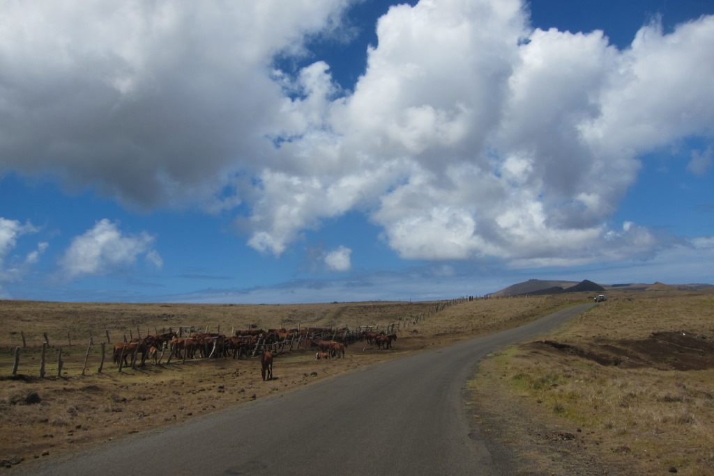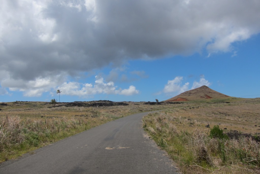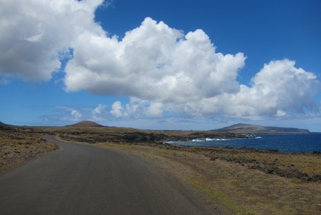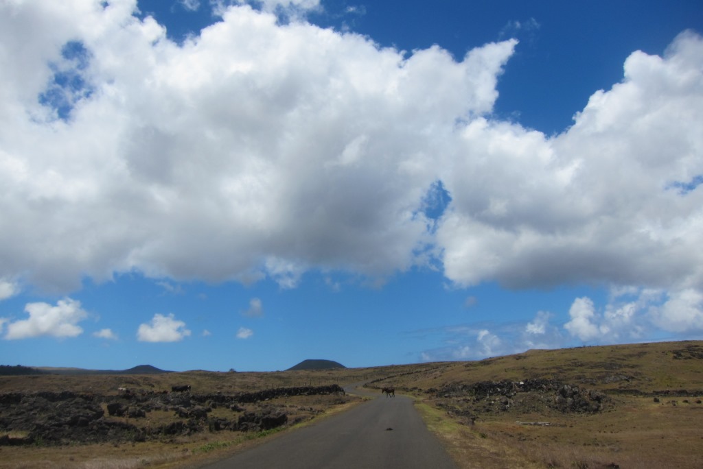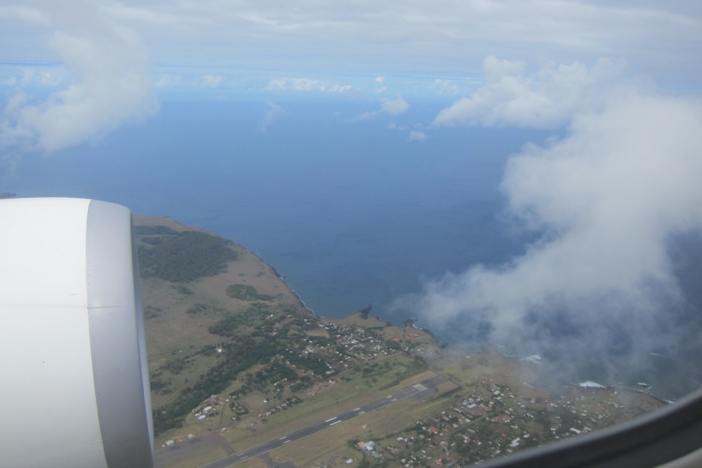 No kontinenta līdz Lieldienu salai jālido četras ar pusi stundas, mazliet paguļu, noskatos „Hitchhiker’s guide to the galaxy” un tad jau pie apvāršņa iznirst izslavētā sala. Man blakus sēdošais vietējais vīrs iepriecina, ka šobrīd Lieldienu salā ir dikti silti, ap 30 grādiem.