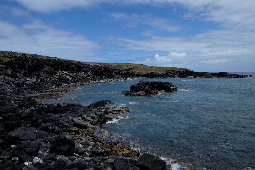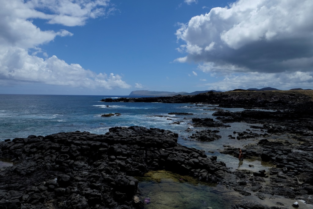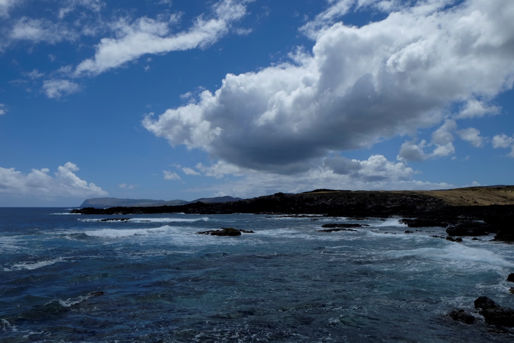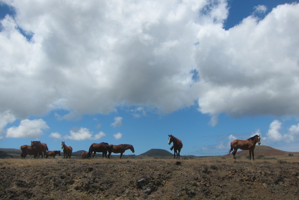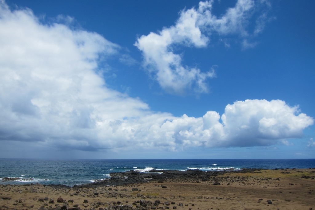 No kontinenta līdz Lieldienu salai jālido četras ar pusi stundas, mazliet paguļu, noskatos „Hitchhiker’s guide to the galaxy” un tad jau pie apvāršņa iznirst izslavētā sala. Man blakus sēdošais vietējais vīrs iepriecina, ka šobrīd Lieldienu salā ir dikti silti, ap 30 grādiem.