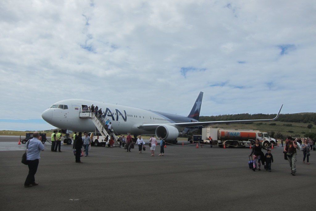 Lidmašīna no Bogotas uz Santjago laimīgā kārtā ir pustukša – operatīvi ieņemu tuvāko trīsrindnieku un, ieturējusi otrās svētku vakariņas, liekos uz auss un mierīgi noguļu līdz brīdim, kad sākam nosēsties. Santjago lidostā man ir tik vien laika, lai izietu visas birokrātiskās procedūras – esmu pie vārtiem 10 minūtes pirms iekāpšanas. Aši atrodu bankomātu, lai Lieldienu salās ierastos ar vietējiem peso kabatā, tomēr šis man naudu nedod. Otrs bankomāts arī nē, sasodīts. Nu neko, jācer, ka salā tikšu pie naudas.