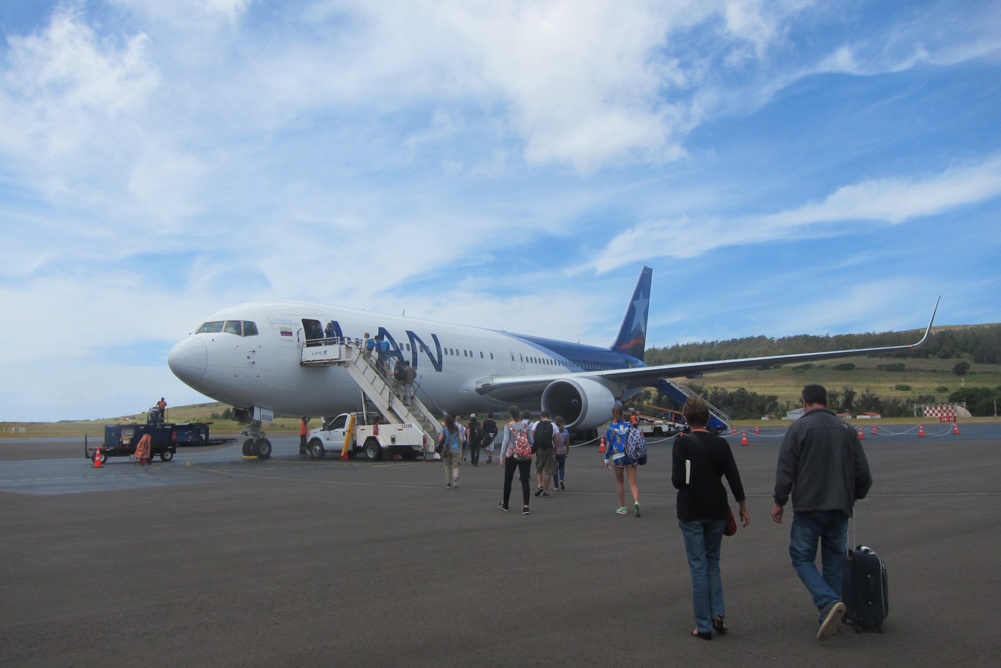 Otru rotu man uzkar kaklā Hopija, apkampju viņu un pārējos šejieniešus uz atvadām. Tad sēžos pie stūres uz laižu uz lidostu. Tur nolieku atslēgas zem vadītāja tepiķīša un atstāju neaizslēgtu auto lidostas stāvvietā, tā esmu vienojusies ar auto īres kompāniju. Tad mazajā lidostā izeju ierastās procedūras, sagaidu lidmašīnu un jau drīz māju atvadas Lieldienu salai. Eh, parastās atvadu skumjas arī piemetušās – šoreiz vairāk par vietu, kā cilvēkiem.