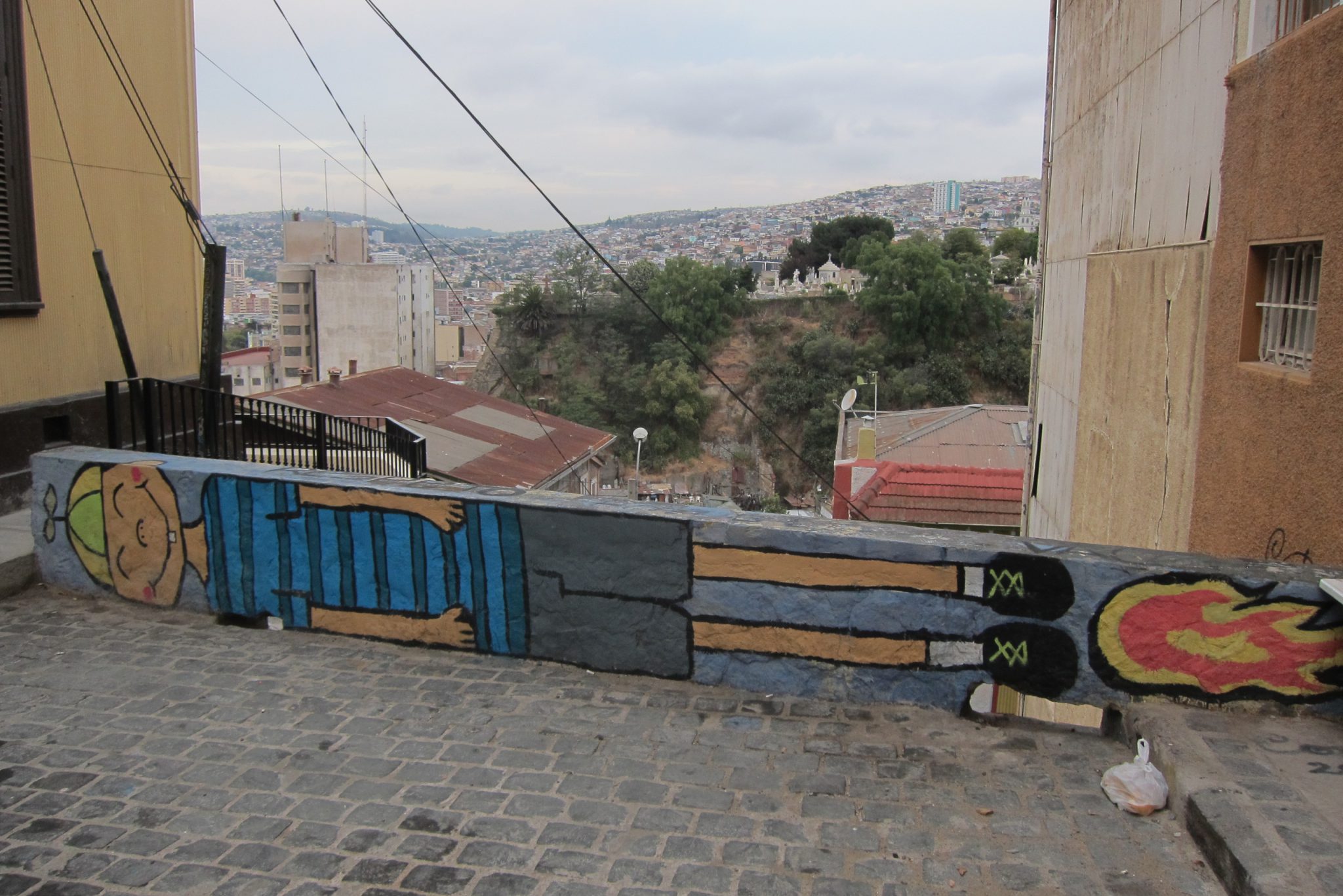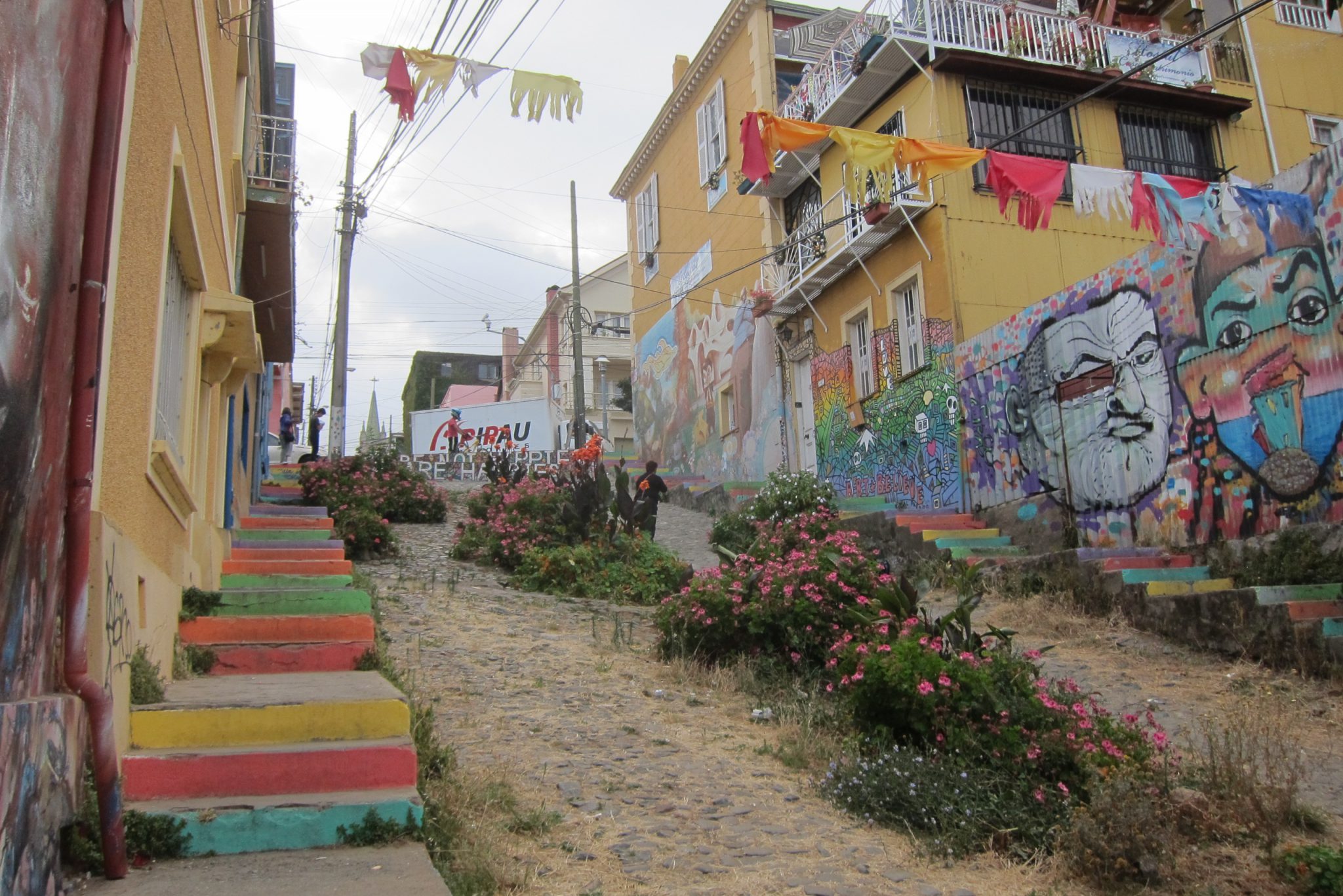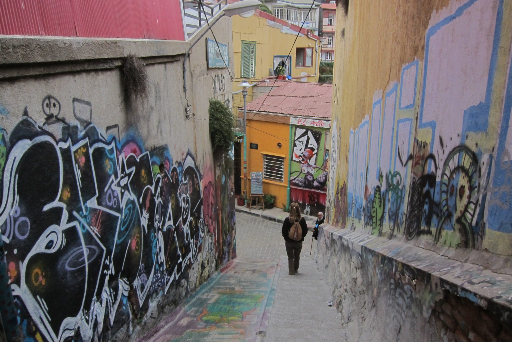 Tāda pūcīga iebraucu Valparaiso. Mēģinu zvanīt kontaktam trešo reizi, arī šoreiz nesekmīgi. Labi, esmu piefiksējusi pāris hosteļu adreses katram gadījumam, eju meklēt naktsmājas. Joprojām viss ir slikti, neesmu arī priecīga ieraudzīt, ka man nepieciešamā vieta atrodas kalna galā, ir jākāpj pa garum garām kāpnēm. Tomēr kāpnes jeb fiziskā slodze jocīgā kārtā palīdz kliedēt nejauko noskaņojumu un pie hosteļa durvīm zvanu nosvīdusi, bet daudz mierīgāka. Viņiem ir brīvas vietas, iekārtojos četrvietīgā istabiņā.