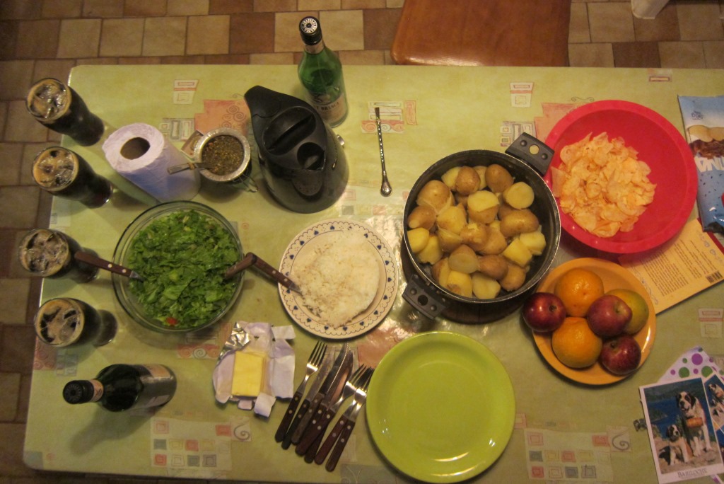 Esam izsalkušas, tāpēc piedāvāju puišiem, ka mēs varētu novārīt kartupeļus un pagatavot klāt salātus. „Un kur gaļa?”, prasa Rikijs. Pēdējās divas dienas mājās saimniekoja franču veģetārietes un Rikijs ir noilgojies pēc kā sātīgāka. „Jaunzēlande, laižam uz veikalu”, viņš aicina Emīliju un šie uz moča aizbrauc iepirkties. Es tikmēr tieku galā ar kartupeļiem un salātiem, bet Matiass iekurina kamīnu, lai tajā pagatavotu assado jeb, latviski izsakoties, izceptu gaļu. Gaļu viņi cep nevis kā mēs – šķēlēs vai gabaliņos, bet gan visu kluci uzreiz. Savus, it kā gatavos gabaliņus, lūdzu pacept ilgāk, neesmu radusi pie pusjēlas gaļas.