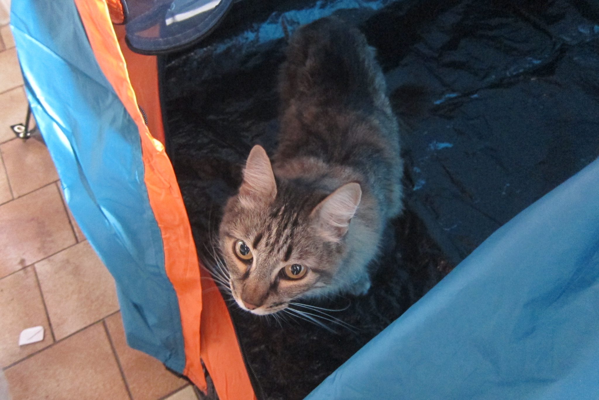 Nonākusi mājās, nevaru nociesties un uzceļu jauno telti istabas vidū. Kamēr es skatos, kā stiprināt ārējo apvalku, pa atvērto ieeju teltī ielavās Akmentiņš, Rikija kaķene. Viņai tur tīri labi patīk – kādu brīdi kaķis ķer ēnas un savus iedomu tēlus. Izstāstu meitenēm, ka Latvijā ir tradīcija jaunā mājā pirmo ielaist kaķi; izskatās, ka arī šejienes minči ir pazīstami ar šo paražu. Akmentiņš ir ielas kaķene, arī abi dukši, kas cilpo pa pagalmu, kādreiz bijuši klaiņojoši suņi, līdz Rikijs šos adoptējis.