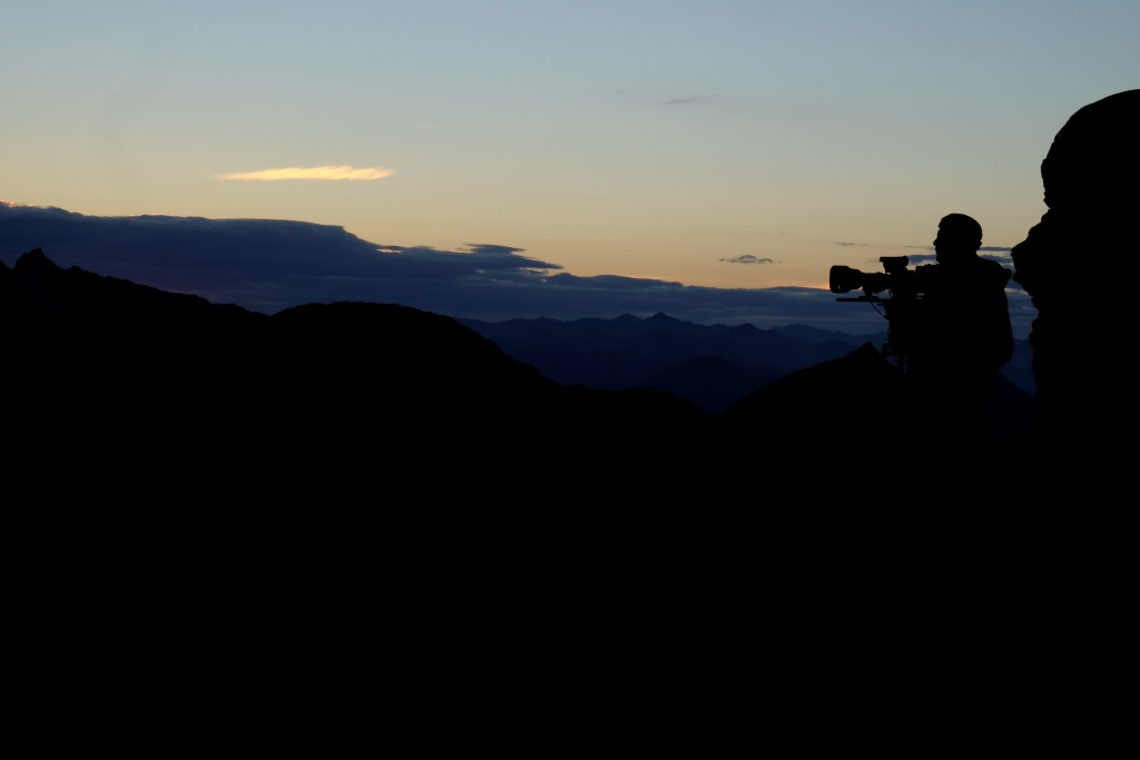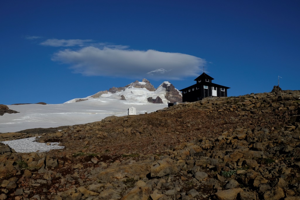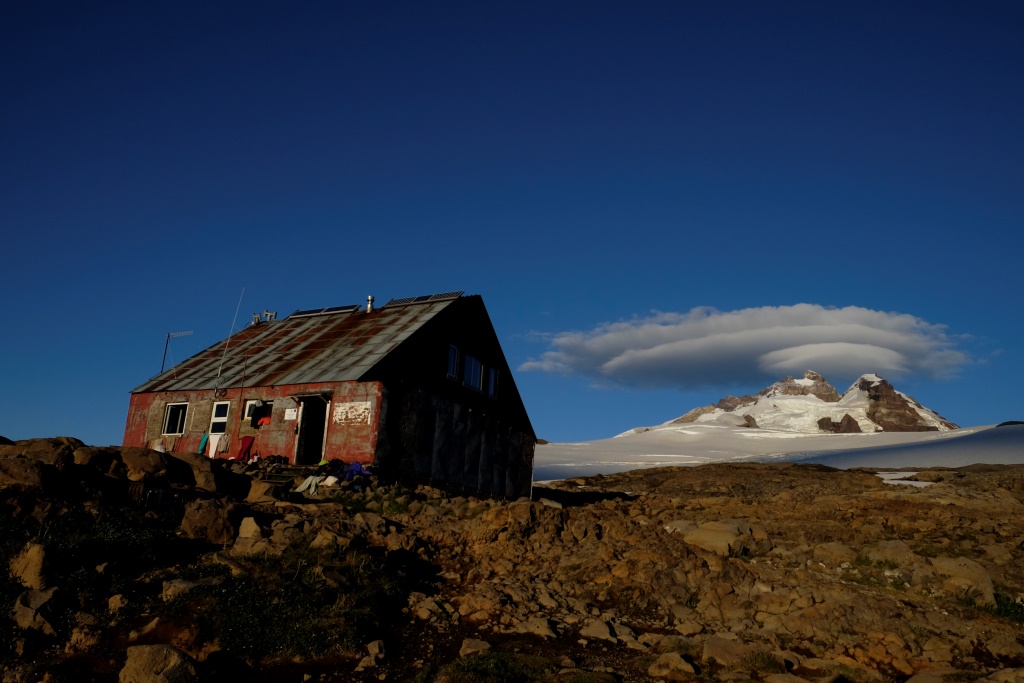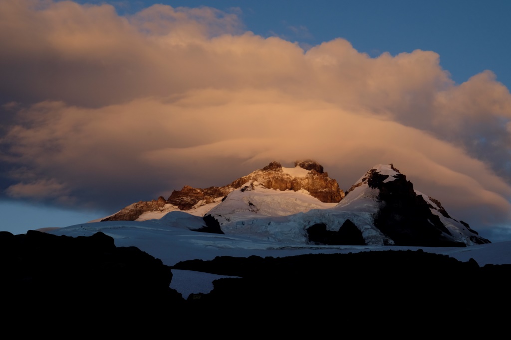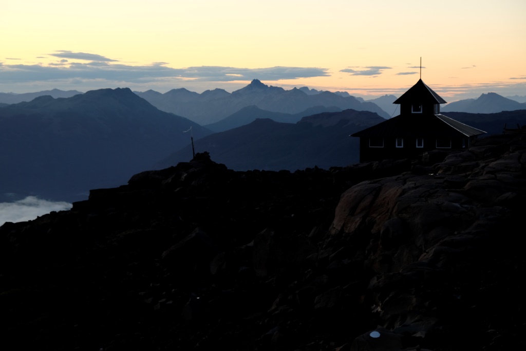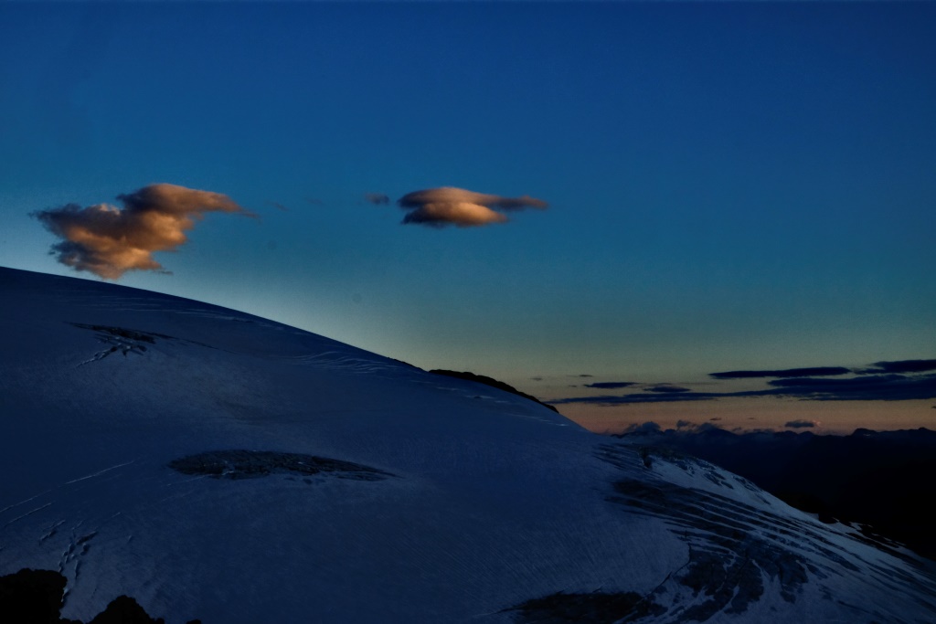 Sākumā kalni ir tumši uz sarkanu debesu fona – tādu, kuru bildē mierīgi varētu noturēt par saulrietu. Lēnām top aizvien gaišāks, vietā, kur ausīs saule, uz brīdi parādās purpursarkans pleķis. Pirmo saule sasilda mākoni virs kalnu smailēm, tad lēnām pieskaras arī tām, pēc tam devīgi pārklāj visu balto ledāju. Ak, rīta krāsas. Drebošiem pirkstiem staigāju ap refugio un cenšos iemūžināt vismaz apjausmu par šejienes skaistumu. Kā man gribas, lai šeit būtu mani kolēģi no foto „pulciņa”- tie, kuri pa īstam to māk. Tomēr dažas bildes man šķiet jaukas un nospriežu, ka šodiena ir gana vērtīga, lai arī to kādam veltītu – manai paralēlās klases biedrenei Inesei Stūrei – Goldmann, kas pasūtīja Īpaši Skaistu Bildi. Inese, paskaties pastkastē, manuprāt, tajā ir visskaistākā no bildēm.