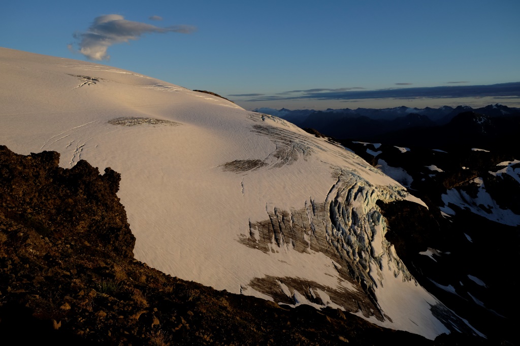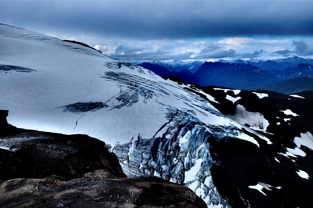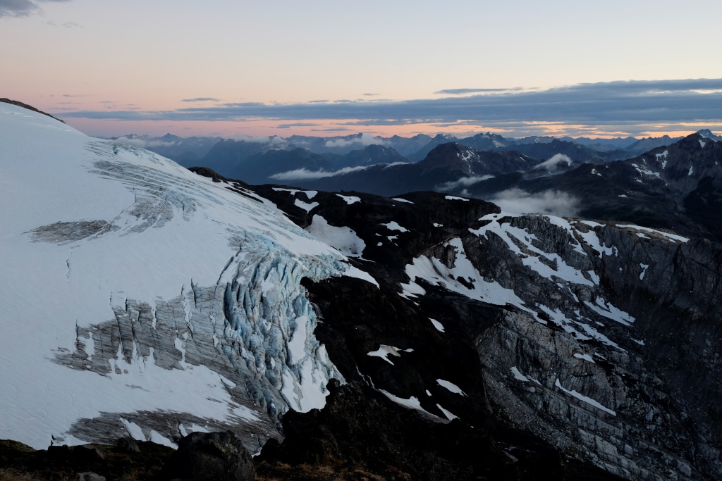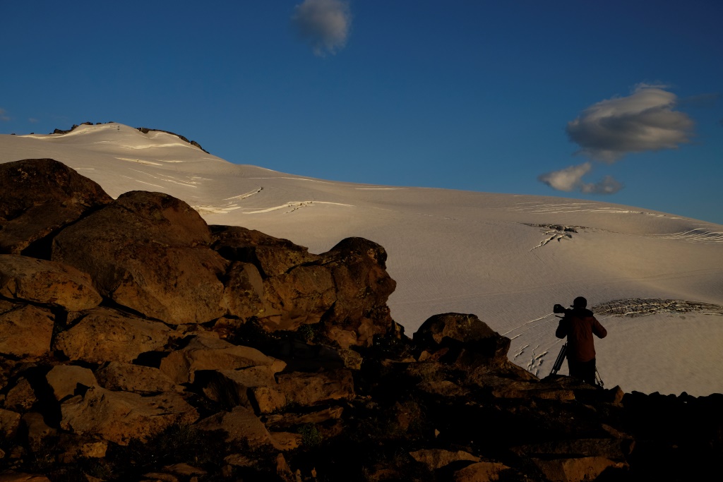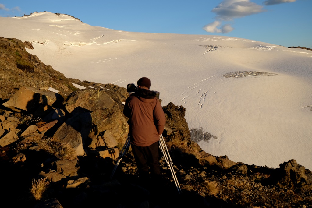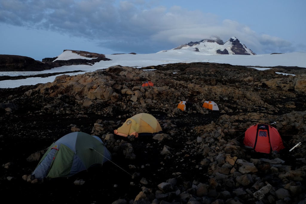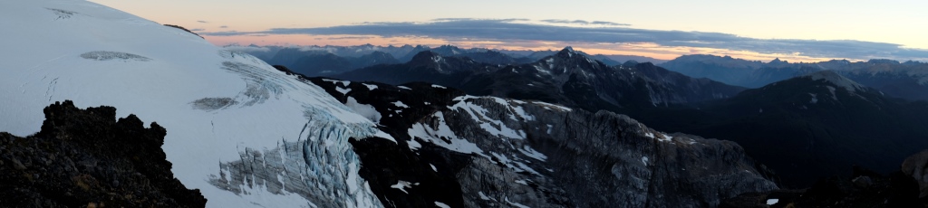 Sākumā kalni ir tumši uz sarkanu debesu fona – tādu, kuru bildē mierīgi varētu noturēt par saulrietu. Lēnām top aizvien gaišāks, vietā, kur ausīs saule, uz brīdi parādās purpursarkans pleķis. Pirmo saule sasilda mākoni virs kalnu smailēm, tad lēnām pieskaras arī tām, pēc tam devīgi pārklāj visu balto ledāju. Ak, rīta krāsas. Drebošiem pirkstiem staigāju ap refugio un cenšos iemūžināt vismaz apjausmu par šejienes skaistumu. Kā man gribas, lai šeit būtu mani kolēģi no foto „pulciņa”- tie, kuri pa īstam to māk. Tomēr dažas bildes man šķiet jaukas un nospriežu, ka šodiena ir gana vērtīga, lai arī to kādam veltītu – manai paralēlās klases biedrenei Inesei Stūrei – Goldmann, kas pasūtīja Īpaši Skaistu Bildi. Inese, paskaties pastkastē, manuprāt, tajā ir visskaistākā no bildēm.