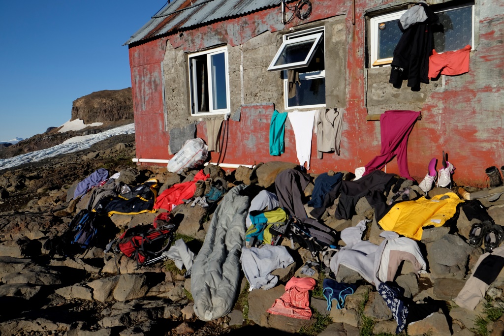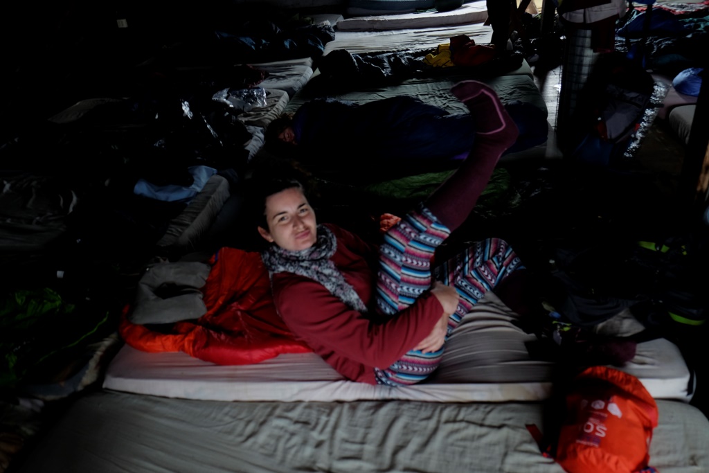Vēl pēc pusstundas esam to sasniegušas un klūpam pār slieksni iekšā. Tur jau priekšā ir pilns ar tādiem pašiem slapjiem elementiem – citi jau pārģērbušies un izskatās diezgan omulīgi, citi drebinās tāpat kā mēs. Pirmām kārtām novelkam slapjās drēbēs (tas ir – visu, kas mugurā) un uzvelkam sausās (visu, kas ir somā). Es izceļos ar īpašu gudrību – neesmu paņēmusi otru zeķu pāri (būšot taču tik saulains). Izgriežu slapjās zeķes un nolieku žāvēties. Ir grūti atrast kādu brīvu vietu – visās malās karājas slapjas zeķes, jakas, bikses, apakšbikses un citi apģērba gabali – šķiet, lietu šodien dabūjuši visi.