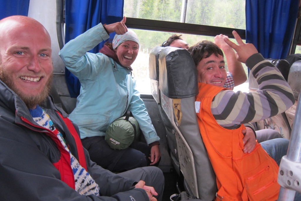 Tad garām brauc autobuss, kas ved ceļa strādniekus mājās un, vairāk koķetējot ar šoferi, nekā cerot uz apstāšanos, paceļu roku. Tavu brīnumu, šis tomēr apstājas. Mēs jau teju bijām gatavi padoties, bet tagad, lai arī autobuss brauc vien 10 kilometrus tālāk, nolemjam kāpt iekšā – vismaz nomainīsim dekorācijas vietai, kur gaidīt.