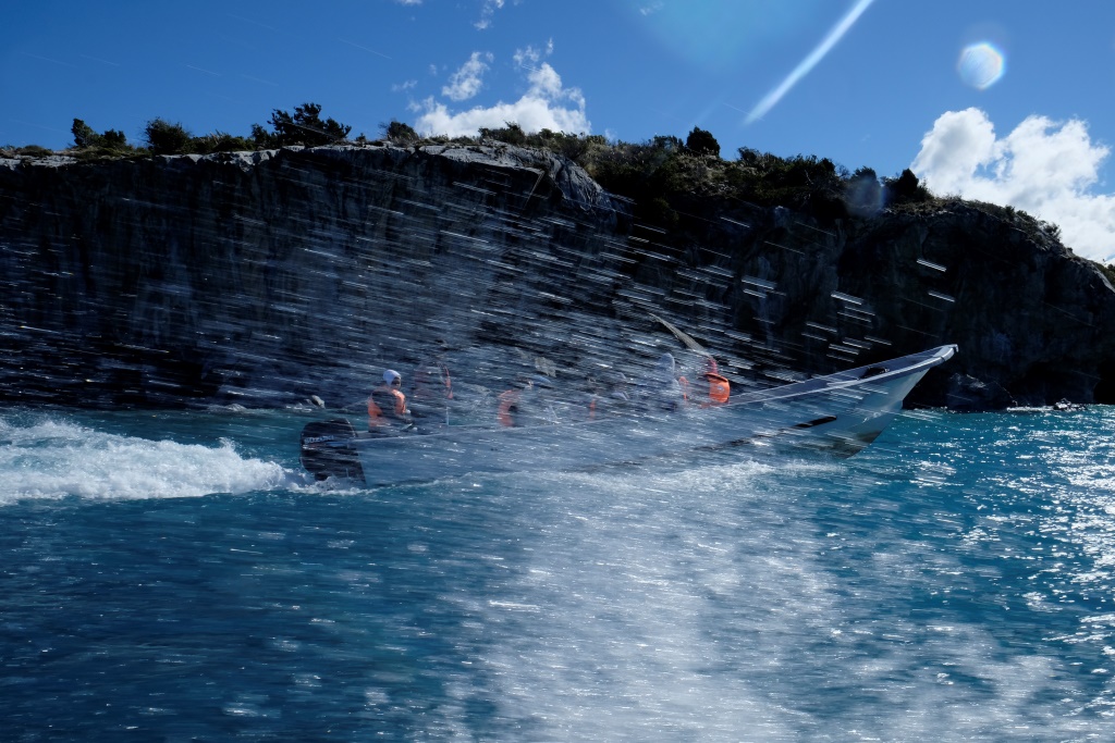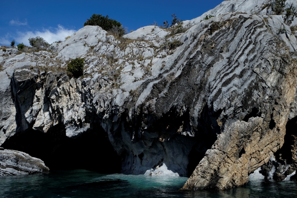 Mūs sasēdina laivā, liek uzvilkt glābšanas vestes un esam gatavi ceļam. „Kapteinis” pielaiž motoru un mēs pa viļņiem lidojam alu virzienā. Ezera ūdens ir zilganzaļš, tajā spoguļojas tālie baltie un tuvie zaļie kalni. Pēc neilga brauciena esam nonākuši līdz alām, motors apklust un varam lēnītēm aplūkot dabas radīto brīnumu. Dažām alām izbraucam cauri, jāpiesargās, lai ar galvu nepārbaudītu marmora cietības pakāpi. Atsevišķi stāvošam klints klucim dots nosaukums „Katedrāle”. Laivas vadītājs aptur peldlīdzekli noteiktā attālumā, aicina mūs fotografēt un saka, ka šādu bildi parasti var redzēt visos materiālos, kur tiek stāstīts par šo vietu.
