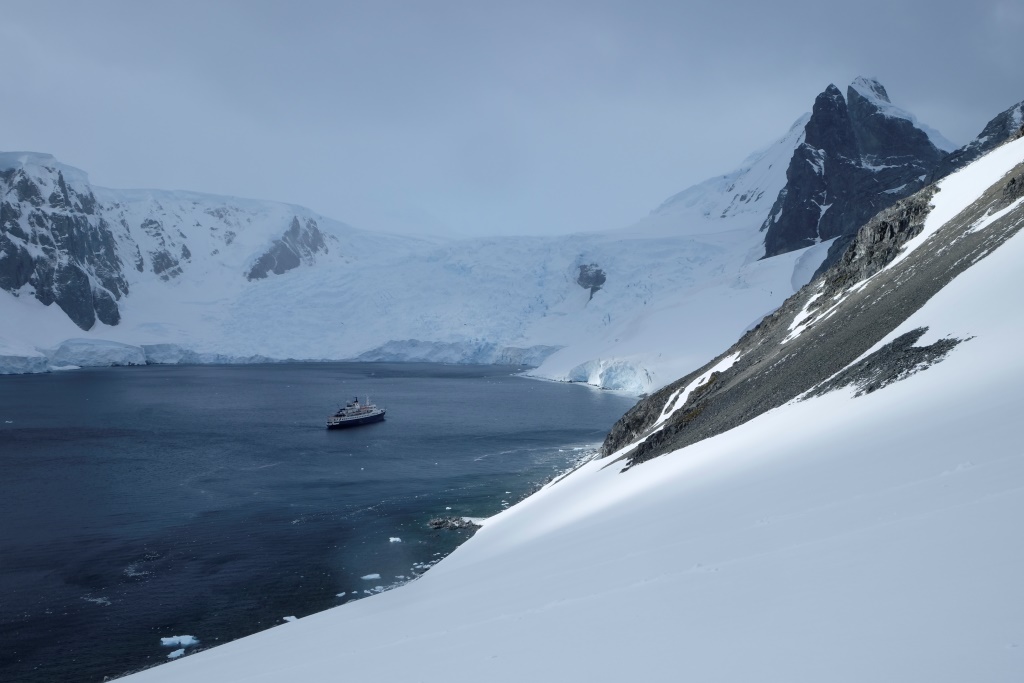Arī šajā kalnā mums ļauj uzkāpt līdz pusei – tālāk taka vijas pa sniegotu kori un šajā vējā mēs visi drīz palidotu uz vienu vai otru pusi. Kad kāpjam lejup, dakteris Saimons stāv nogāzes lejas daļā un ir gatavs ķert lidojošos aziātus – viņi ir visvieglākie un nestabilākie. Bet visi tiekam lejā sveiki un veseli, pagaidām dakterim nav daudz darba. Līdz šim nopietnākās traumas ir šūta brūce sievietei, kas sagrieza roku ar vētrā plīstošu stikla glāzi un galvas sasitums citai pasažierei, kas Dreika šaurumā izlidoja no gultas un atsitās ar galvu pret nakts skapīti. Visi pārējie pasažieri meklējuši dakteri vien jūras slimības mākti, es tai skaitā.