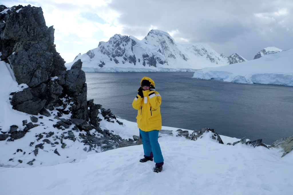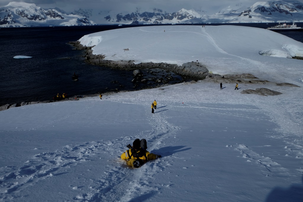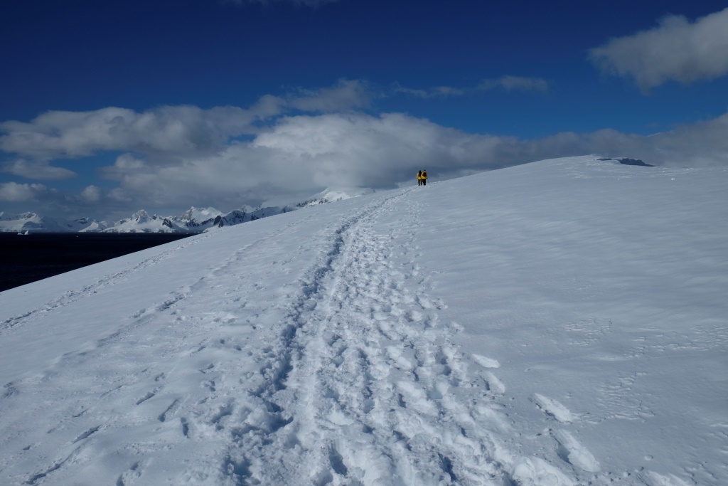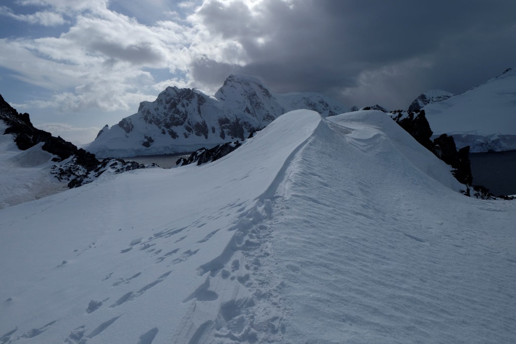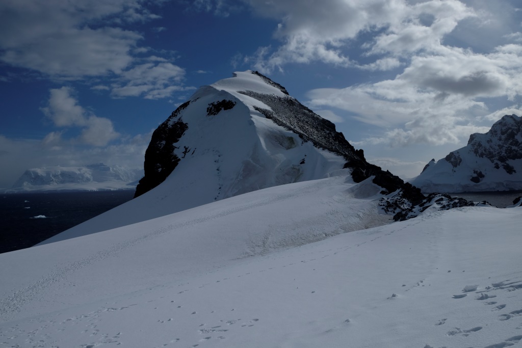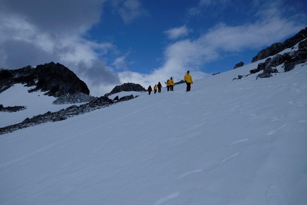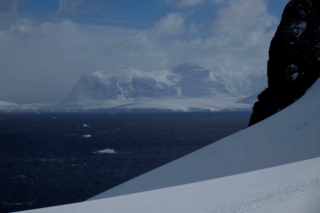 Uzreiz pēc brokastīm mūs salādē zodiakos un aizved uz krastu. Ceļš ved augšup stāvā kalnā pa sniegu, galvenais šķērslis ir vējš. Bildēs viss izskatās tik mierīgs un saulains, bet patiesībā katrs kadrs tika uzņemts kamerai teju lidojot pa gaisu. Vispār fotografēt ir diezgan grūti. Es nemāku noregulēt parametrus ar cimdiem, tāpēc pamatā darbojas ar plikām rokām un tas ir sasodīti auksti. Objektīvs regulāri tiek aizmests ciet ar sniegu vai jūras ūdeni, jāslauka ik pēc minūtes un katru reizi, atgriežoties kuģī, fotoaparāts jānotīra kārtīgi un jānožāvē. Ceru, ka neesmu to dikti sabojājusi, jo šis dabūja piedzīvot diezgan daudzas situācijas, kurās tam nevajadzētu atrasties.