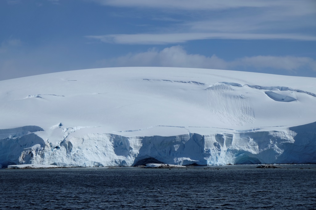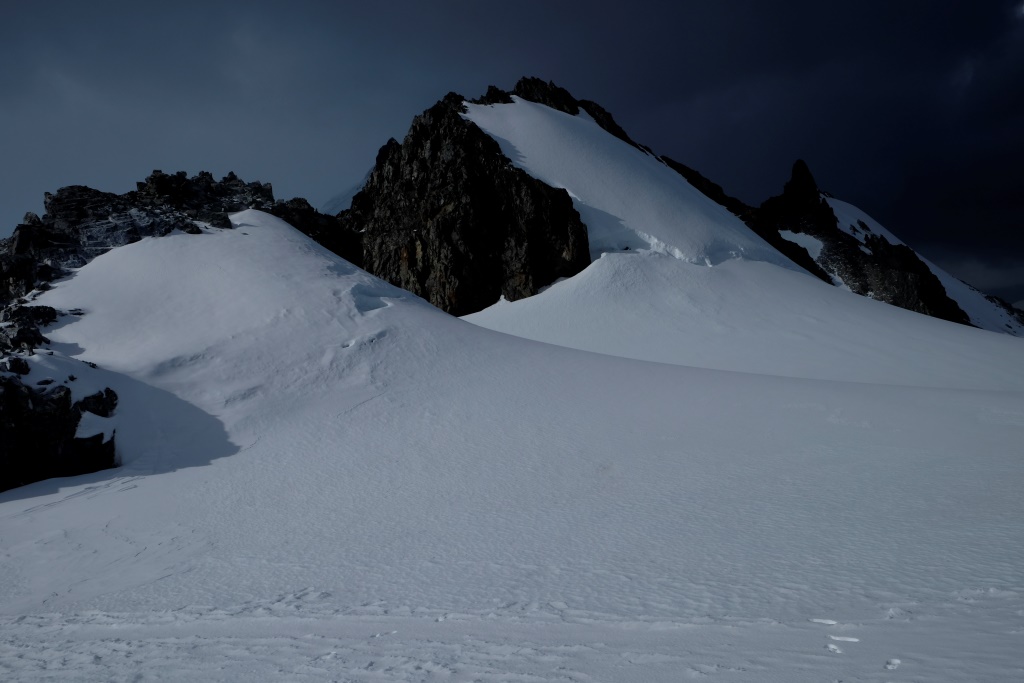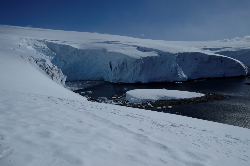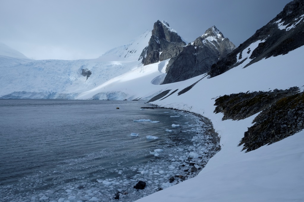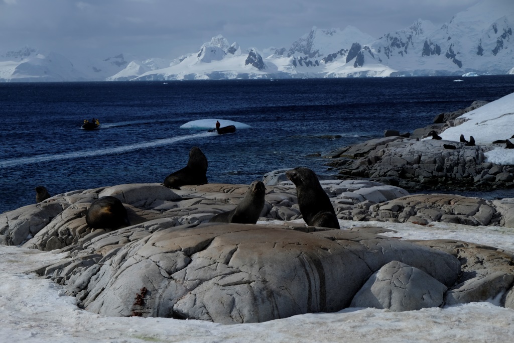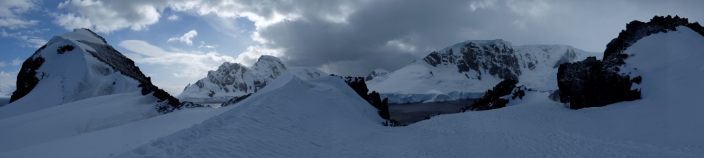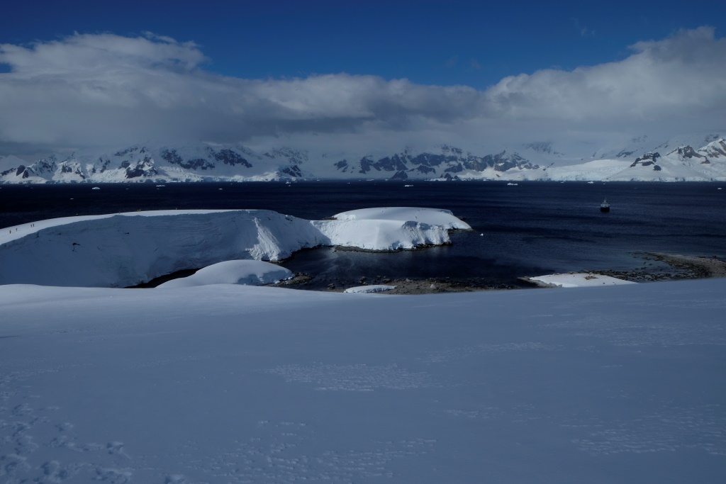 Uzreiz pēc brokastīm mūs salādē zodiakos un aizved uz krastu. Ceļš ved augšup stāvā kalnā pa sniegu, galvenais šķērslis ir vējš. Bildēs viss izskatās tik mierīgs un saulains, bet patiesībā katrs kadrs tika uzņemts kamerai teju lidojot pa gaisu. Vispār fotografēt ir diezgan grūti. Es nemāku noregulēt parametrus ar cimdiem, tāpēc pamatā darbojas ar plikām rokām un tas ir sasodīti auksti. Objektīvs regulāri tiek aizmests ciet ar sniegu vai jūras ūdeni, jāslauka ik pēc minūtes un katru reizi, atgriežoties kuģī, fotoaparāts jānotīra kārtīgi un jānožāvē. Ceru, ka neesmu to dikti sabojājusi, jo šis dabūja piedzīvot diezgan daudzas situācijas, kurās tam nevajadzētu atrasties.