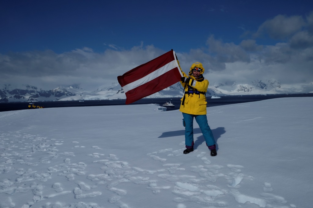 Kad ieraudzīju, ka kuģī uz komandtiltiņa ir visu valstu karogi, palēcos un uzreiz pajautāju atļauju uz vienu dienu aizņemties Latvijas karogu, ko man apkalpe laipni atļāva. Tad nu šodien bildējos ar mūsu skaisto karogu uz sniegbaltā fona. Cilvēki prasa, kas tas par karogu, vairums, protams, nav pazīstami ar mūsu simboliem.