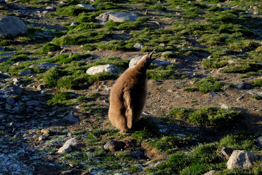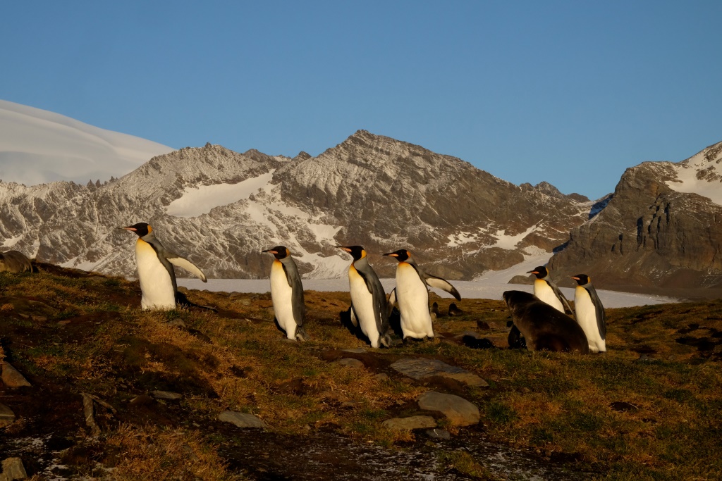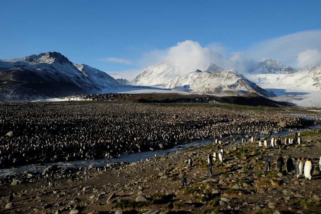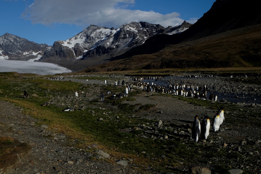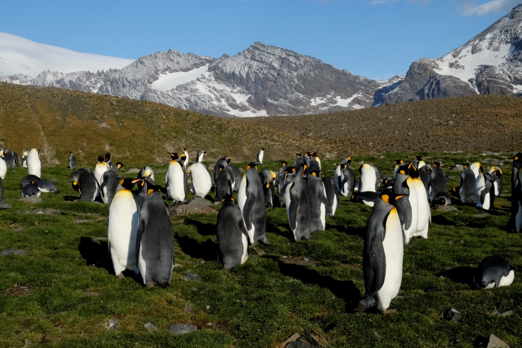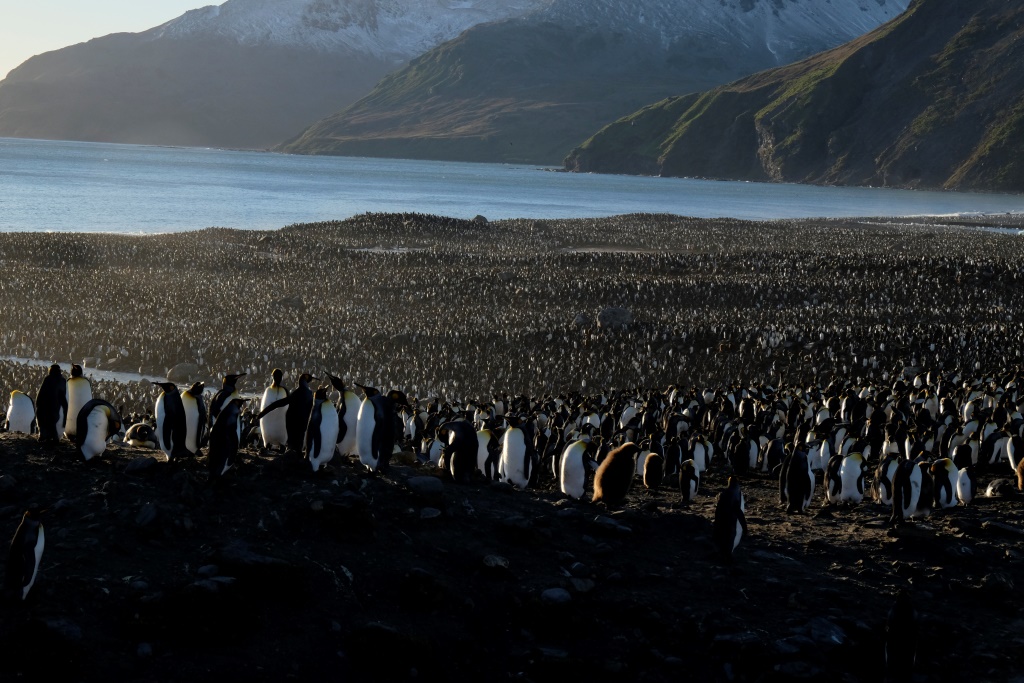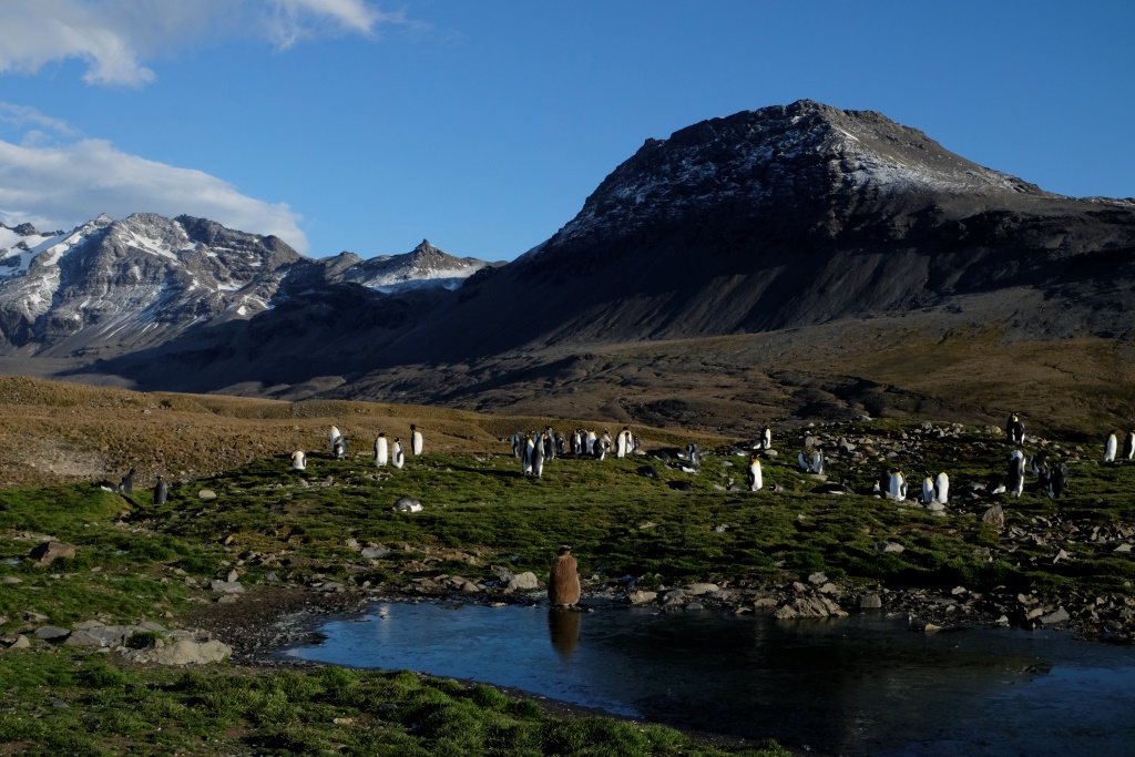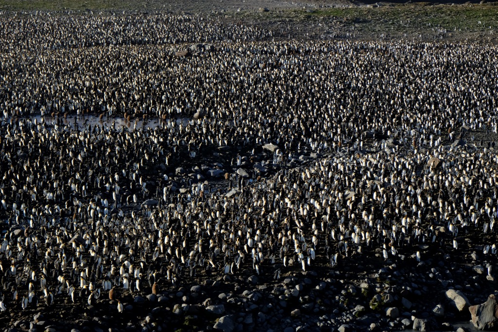 Pa roņiem pilnu pļavu dodamies pingvīnu kolonijas virzienā. Pirms ieraugām pašus putnus, dzirdam skaņu – izklausās it kā mēs tuvotos milzīgam bišu stropam. Kad uzkāpjam kalnā, ieraugām pašus putnus – mūsu skatam paveras neticams pingvīnu daudzums. Mums nav skaidrs, kā pingvīnvecākiem pēc medībām jūrā iespējams šajā troksnī un barā atrast tieši savu mazuli, lai viņu pabarotu.