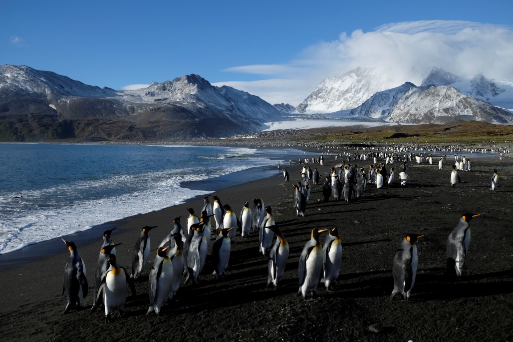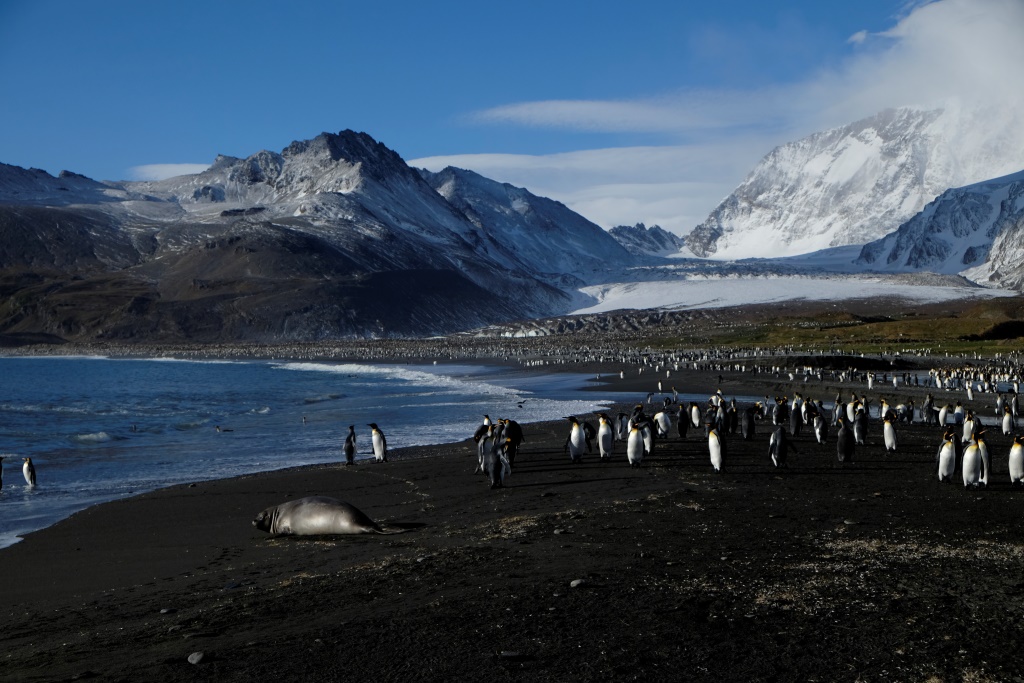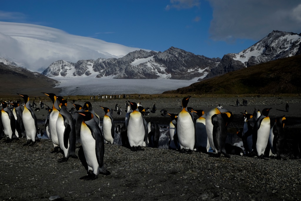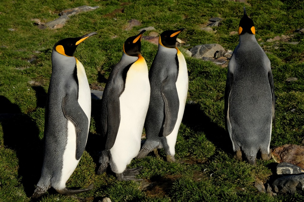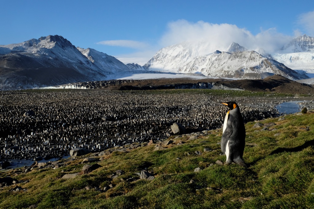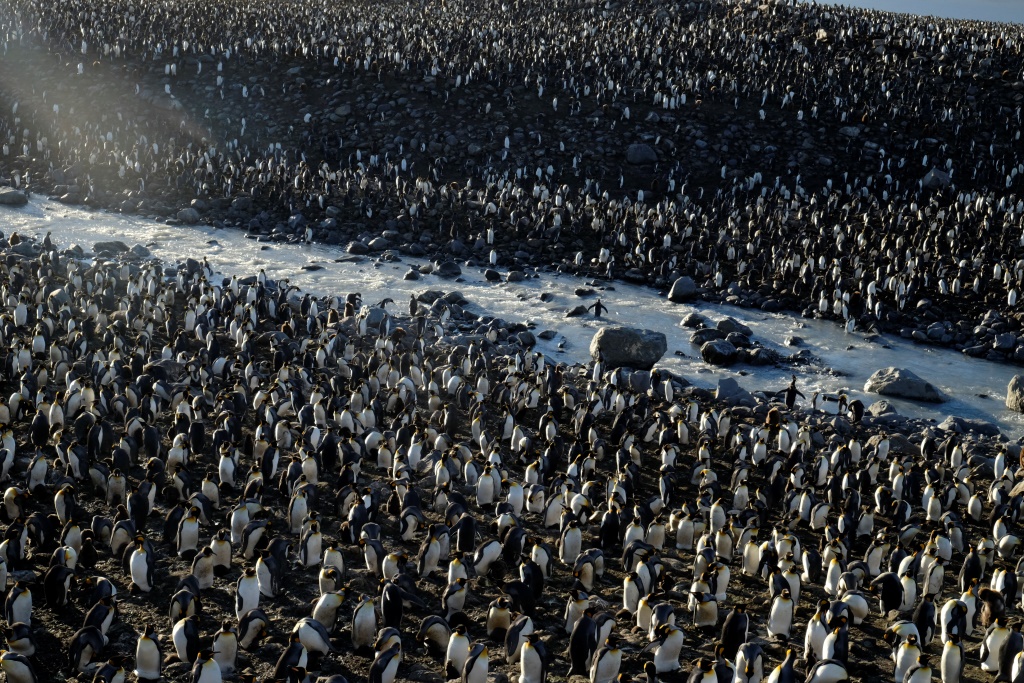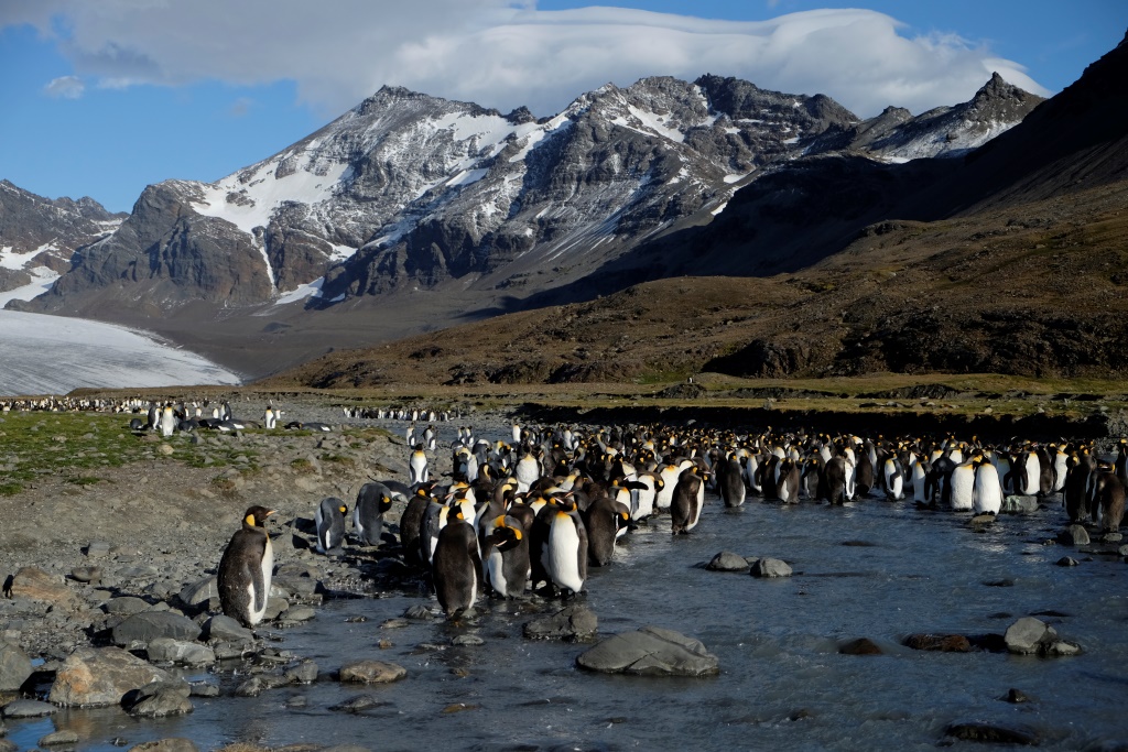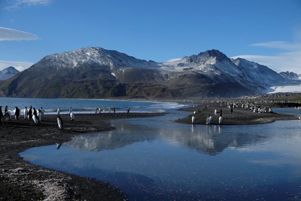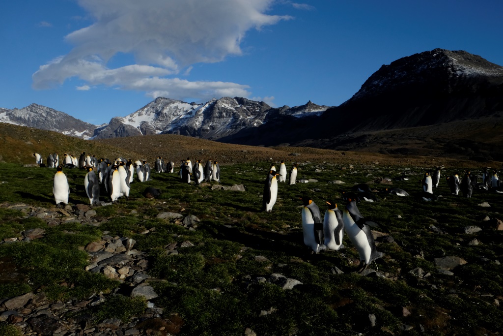 Pa roņiem pilnu pļavu dodamies pingvīnu kolonijas virzienā. Pirms ieraugām pašus putnus, dzirdam skaņu – izklausās it kā mēs tuvotos milzīgam bišu stropam. Kad uzkāpjam kalnā, ieraugām pašus putnus – mūsu skatam paveras neticams pingvīnu daudzums. Mums nav skaidrs, kā pingvīnvecākiem pēc medībām jūrā iespējams šajā troksnī un barā atrast tieši savu mazuli, lai viņu pabarotu.