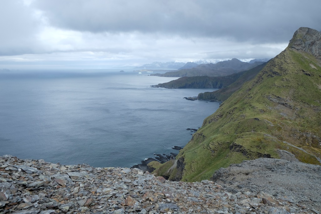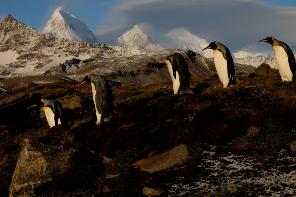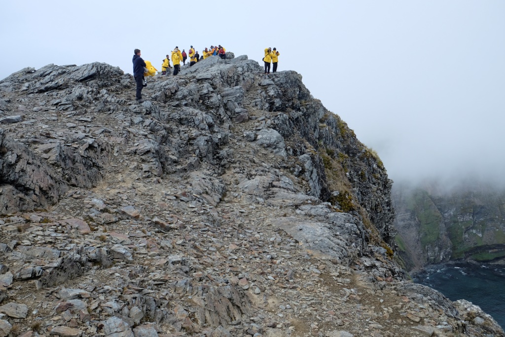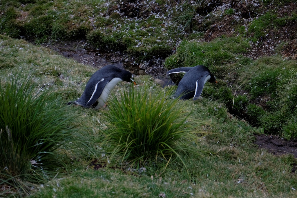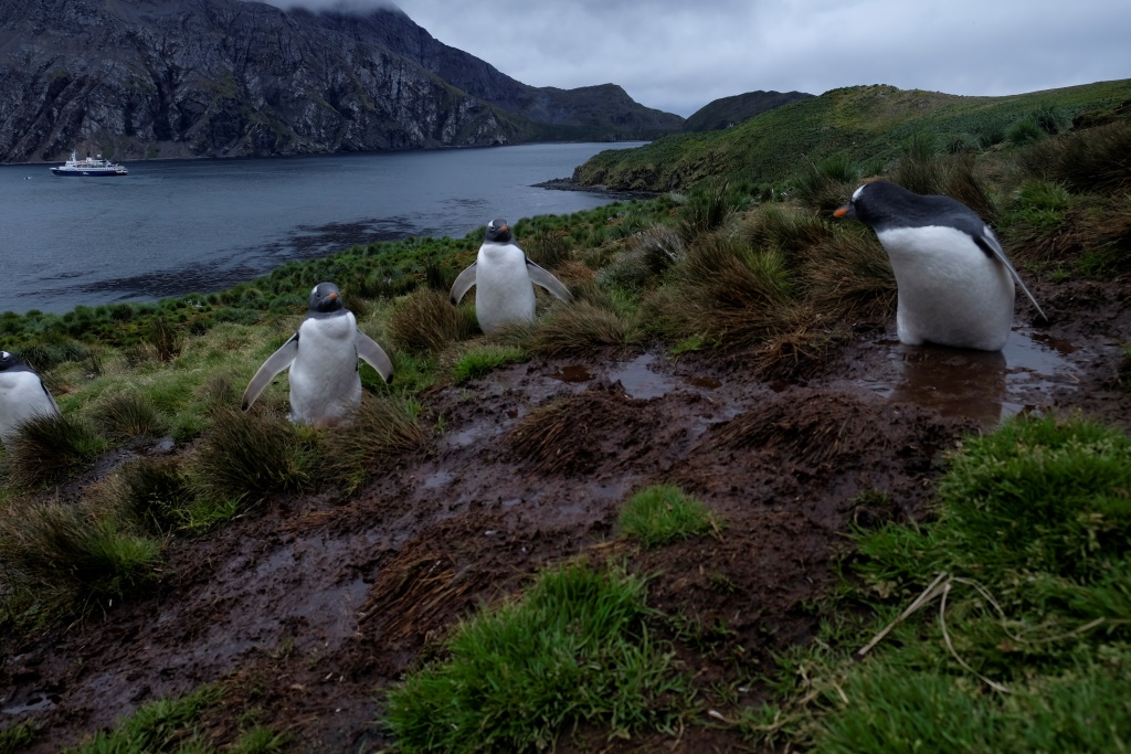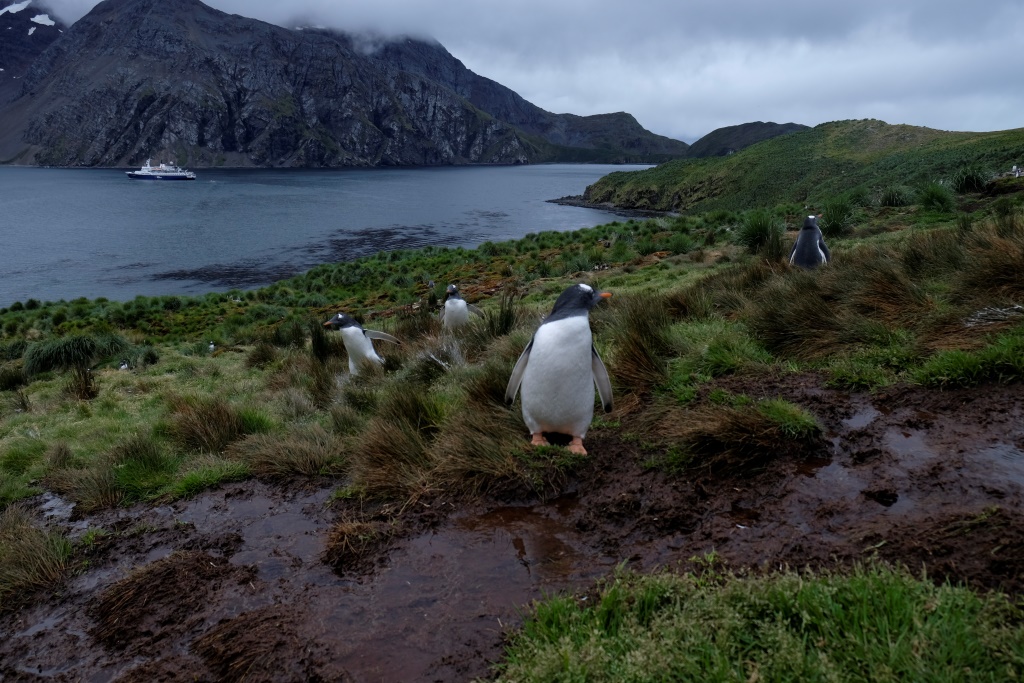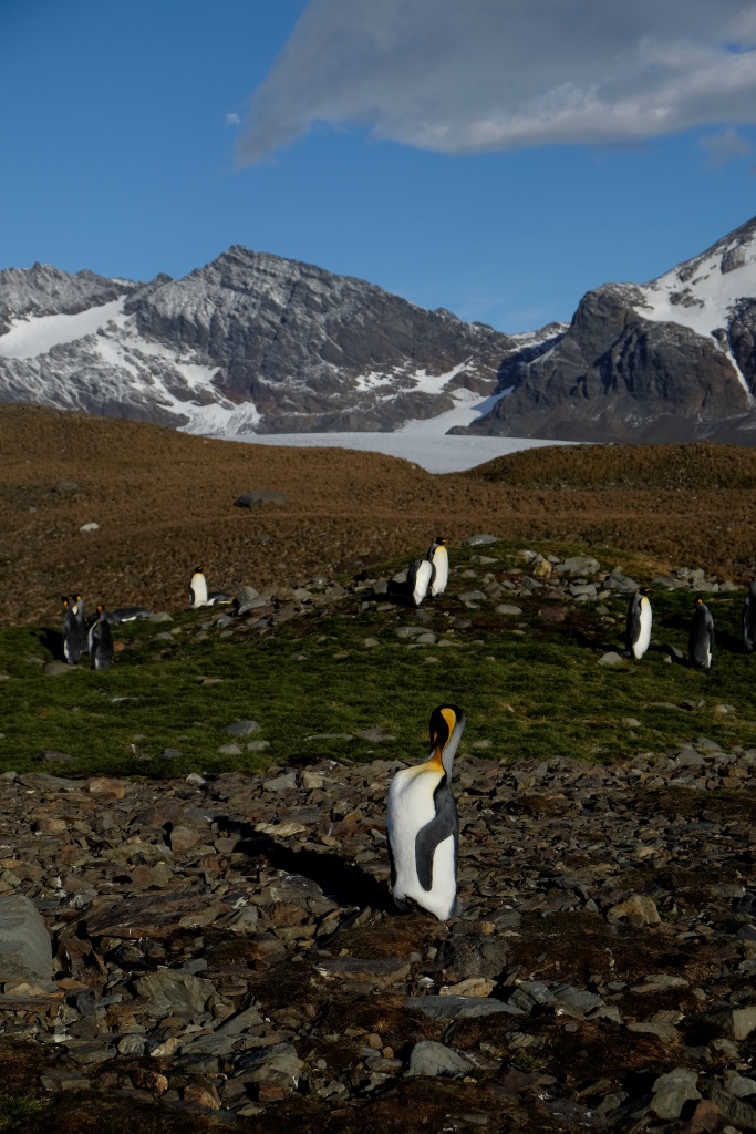 Augšā tiekam atalgoti ar krāšņiem skatiem visos virzienos, ik pa laikam mākoņi ir tik laipni un pašķiras, lai varam skatīt okeānu un tā roboto zemes malu. Lēnām raušamies atpakaļ, es parasti eju pēdējā kopā ar japāņu meiteni Hitomi, arī šoreiz. Vairākas reizes virs mūsu galvām noplivinās albatrosi, pie krasta ceļu šķērso džentū pingvīni. Tagad, kopš esam redzējuši karaliskos pingvīnus, džentū šķiet tik maziņi. Jocīgi arī vērot, kā šie lēkā pa zaļo zāli, bija pierasts nebēdņus skatīt uz balta fona.
