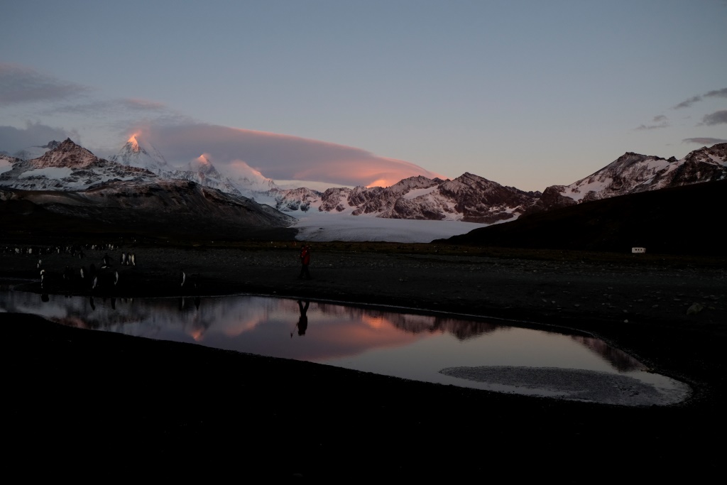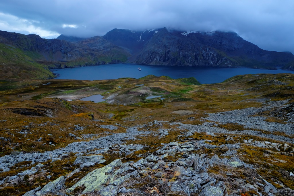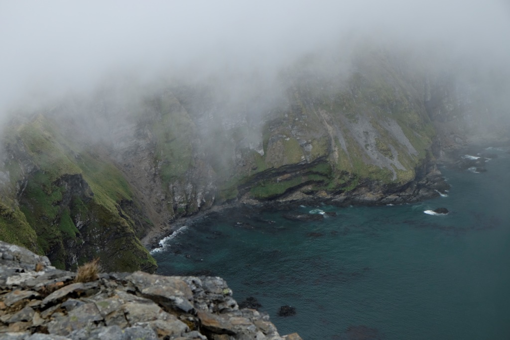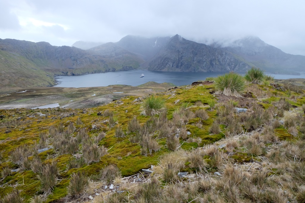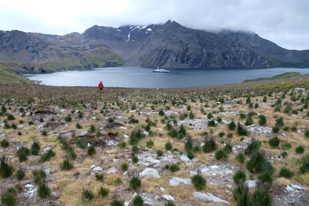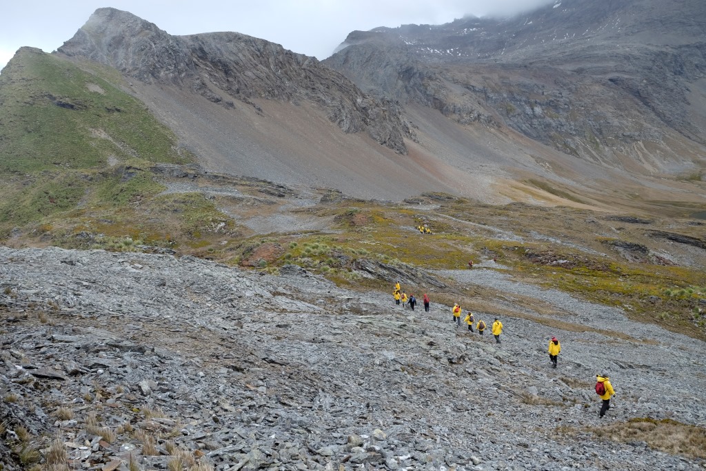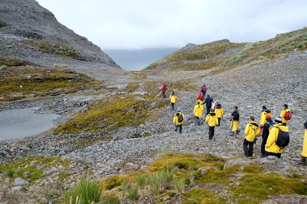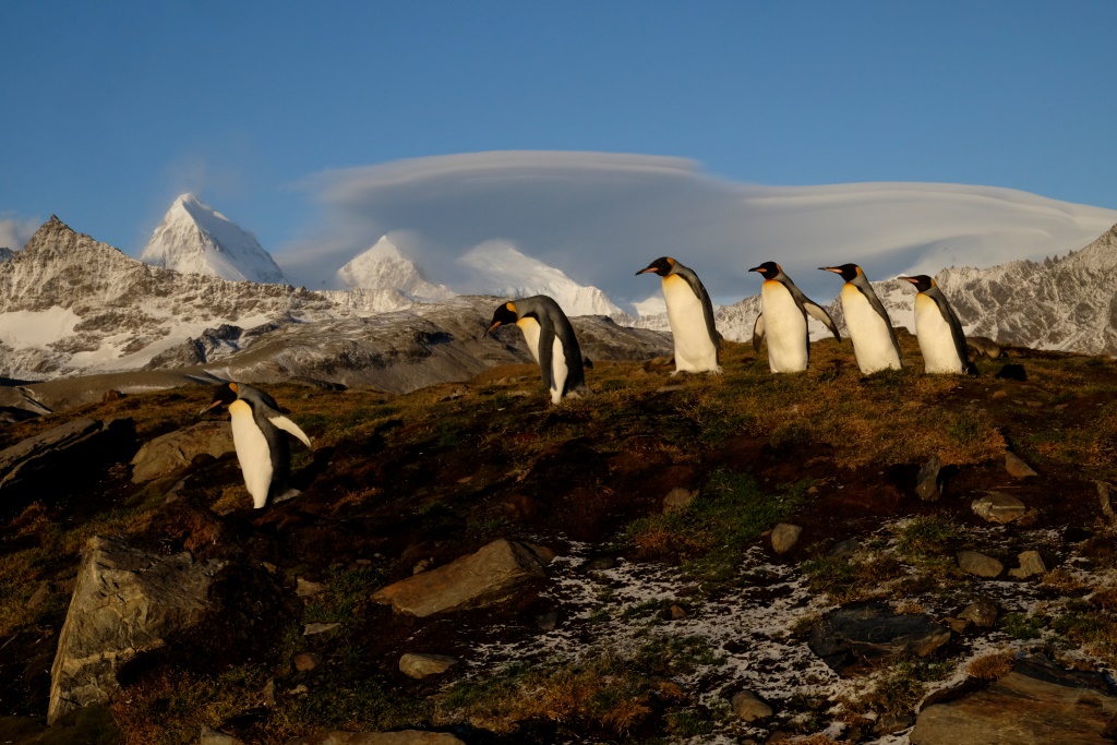 Augšā tiekam atalgoti ar krāšņiem skatiem visos virzienos, ik pa laikam mākoņi ir tik laipni un pašķiras, lai varam skatīt okeānu un tā roboto zemes malu. Lēnām raušamies atpakaļ, es parasti eju pēdējā kopā ar japāņu meiteni Hitomi, arī šoreiz. Vairākas reizes virs mūsu galvām noplivinās albatrosi, pie krasta ceļu šķērso džentū pingvīni. Tagad, kopš esam redzējuši karaliskos pingvīnus, džentū šķiet tik maziņi. Jocīgi arī vērot, kā šie lēkā pa zaļo zāli, bija pierasts nebēdņus skatīt uz balta fona.