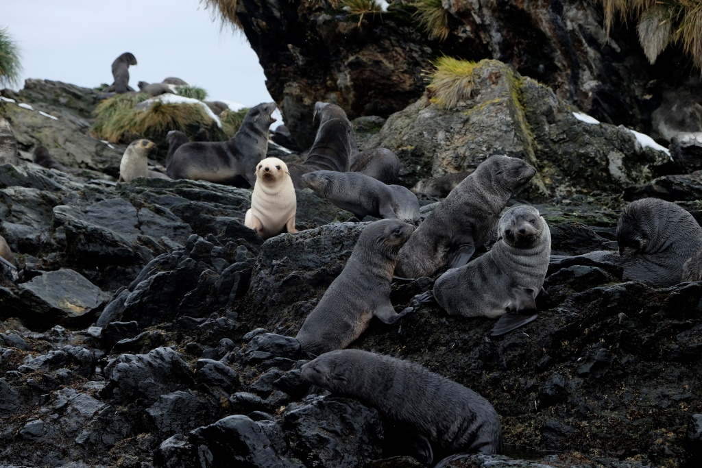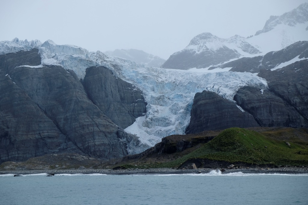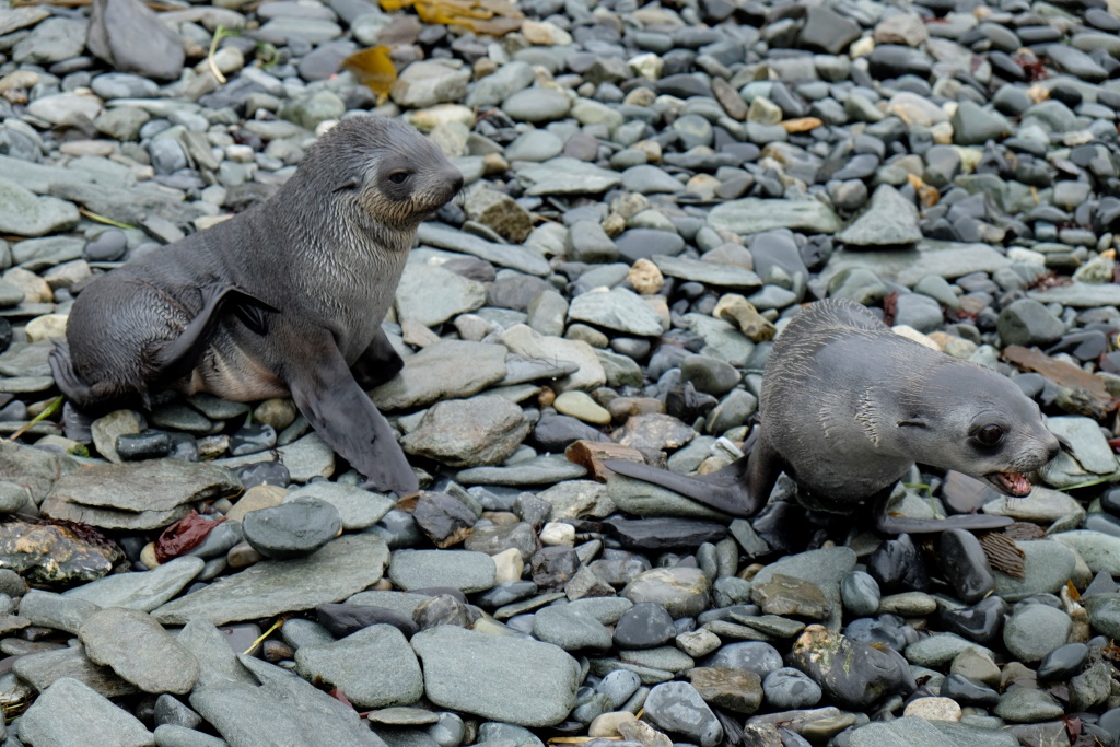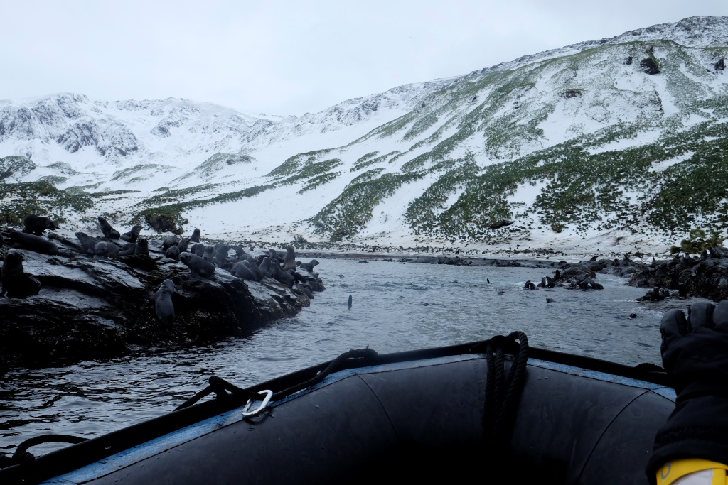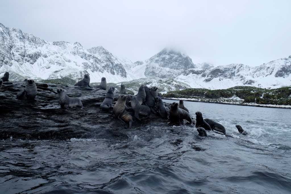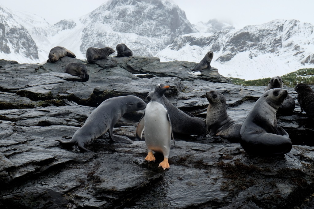 Mūsu pirmā piezemēšanās Dienviddžordžijas salā ir mazā līcī, kur satiekam roņus un jau pazīstamos džentū pingvīnus. Pēc tam tiekam vizināti zodiakos un mums ir iespēja apskatīt zeltcekula pingvīnus – šī ir vienīgā vieta mūsu ceļojumā, kur varam satikt šo pingvīnu sugu. Šodien jūra viļņojas ne pa jokam un klinšu malās augošās ūdenszāles kustas kā biezi mati uz troļļu galvas. Vienā no līčiem braucam cauri roņu baram – viņu ir tik daudz, viss ūdens ņudz kā zupas katls, krastā sēž arī balts albīnronītis.