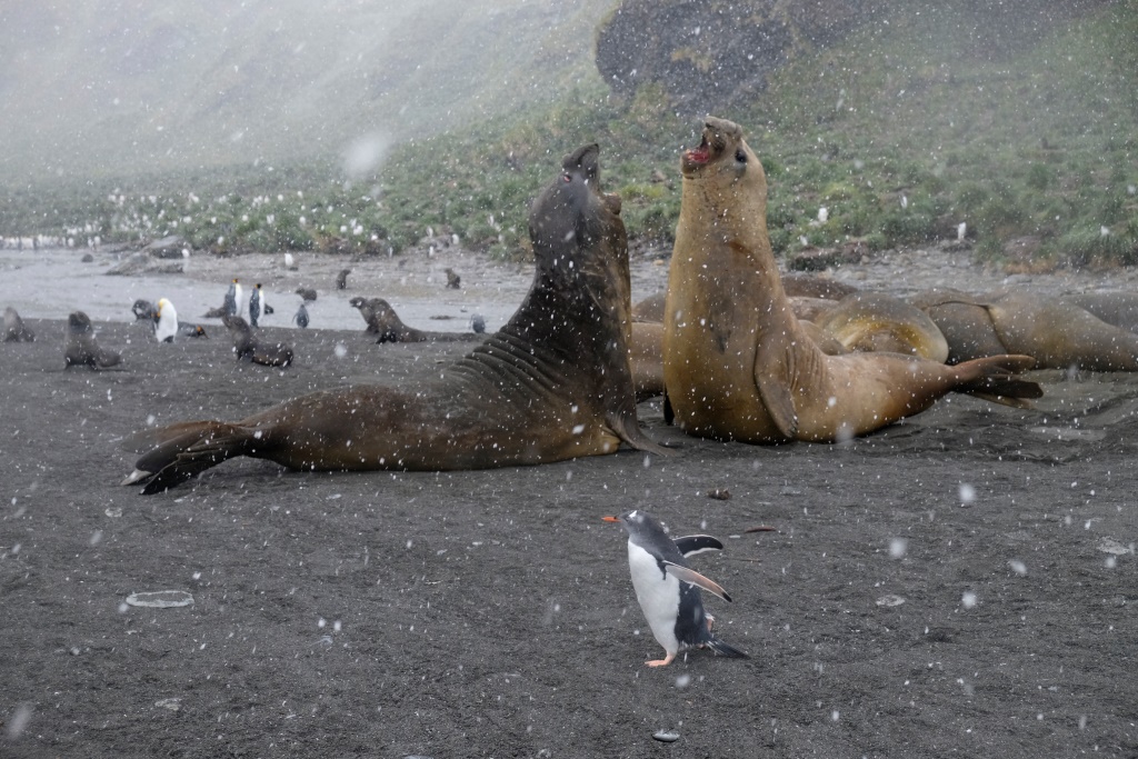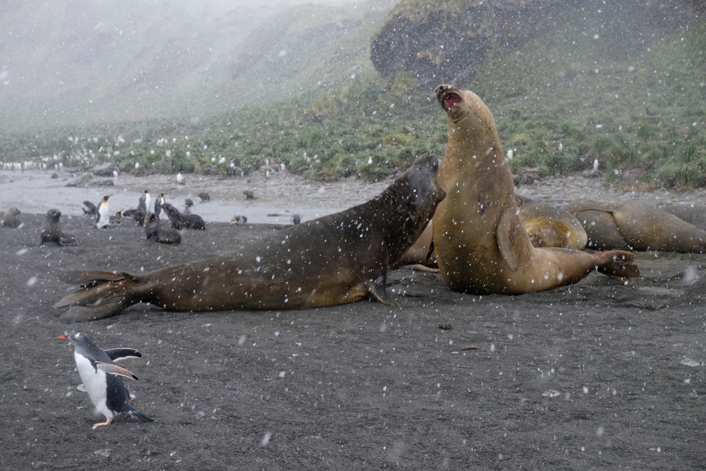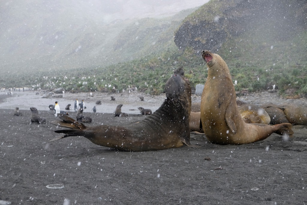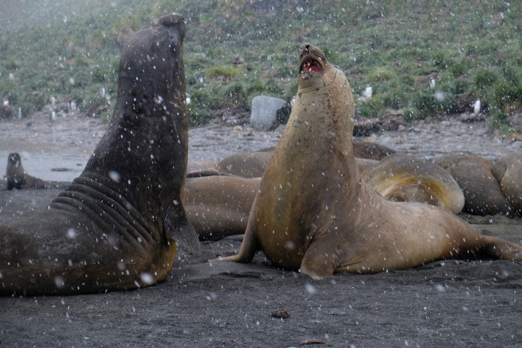 Visi pasažieri jau devušies uz kuģa, palicis vien pēdējais zodiaks. Mēs ejam uz to gar jūras ziloņiem, kad divi milzīgie dzīvnieki uzsāk cīniņu. Ekspedīciju komandai nākas gandrīz ar varu mūs dabūt prom, jāteic šie paši arī gana priecājās vērot šo skatu.
