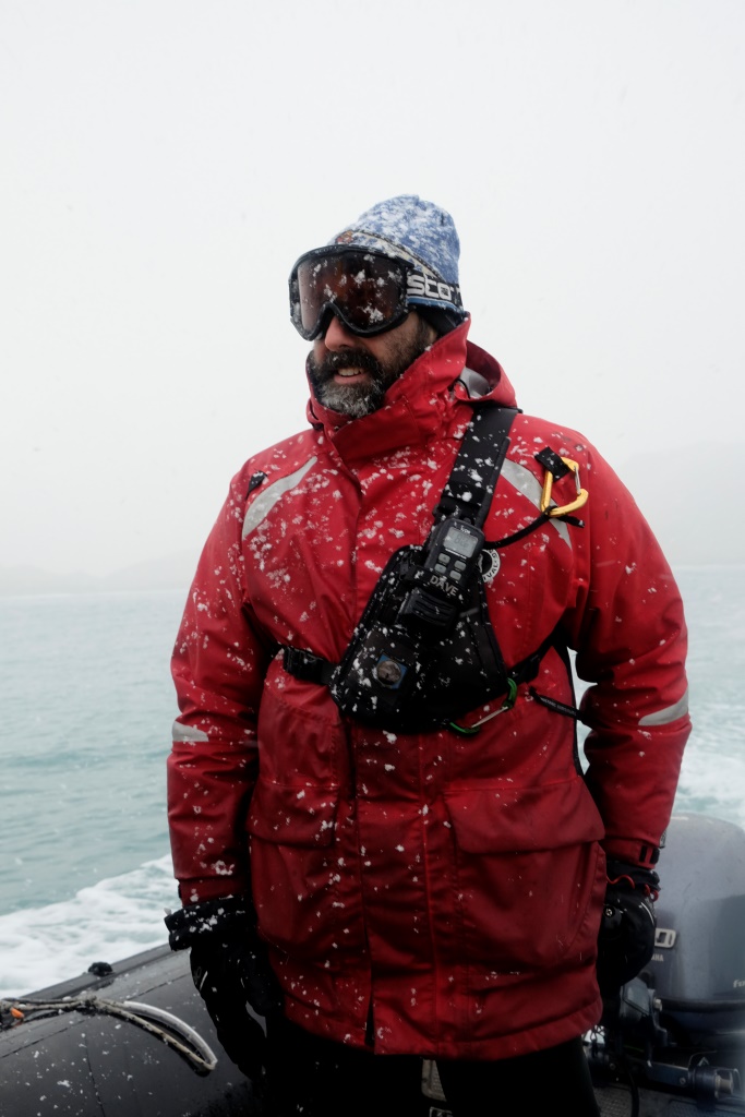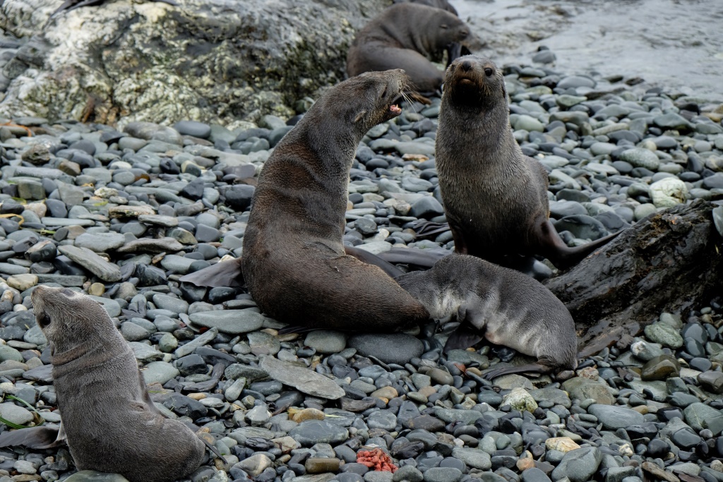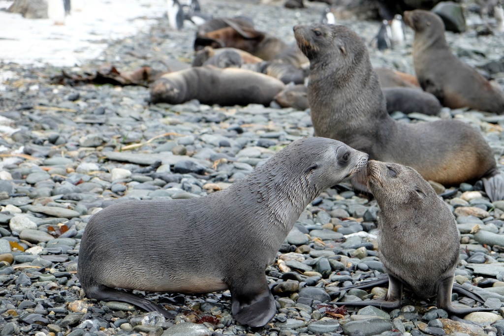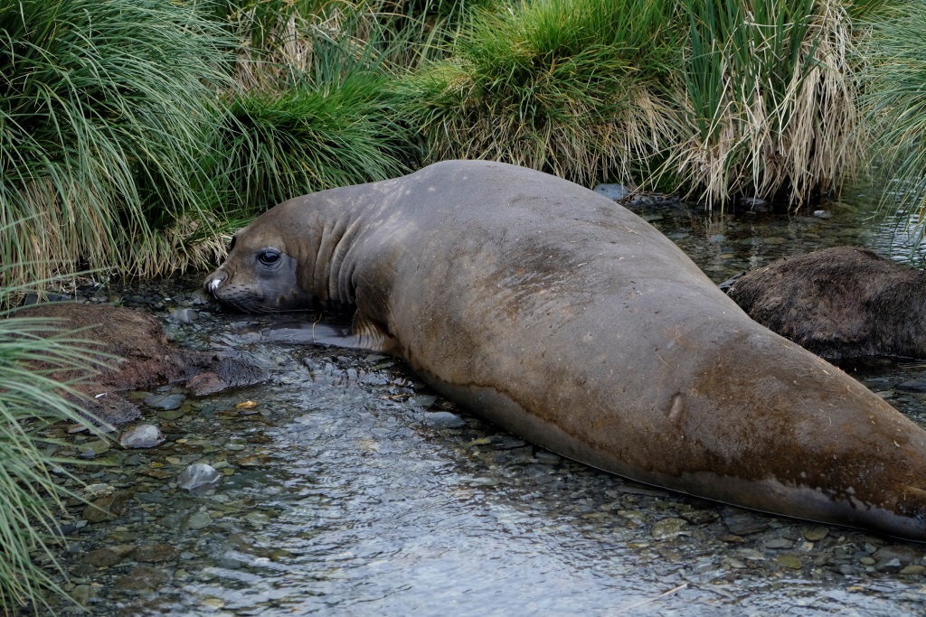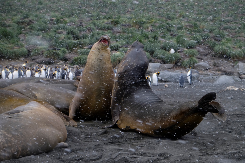 Visi pasažieri jau devušies uz kuģa, palicis vien pēdējais zodiaks. Mēs ejam uz to gar jūras ziloņiem, kad divi milzīgie dzīvnieki uzsāk cīniņu. Ekspedīciju komandai nākas gandrīz ar varu mūs dabūt prom, jāteic šie paši arī gana priecājās vērot šo skatu.