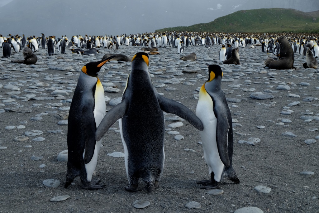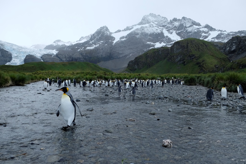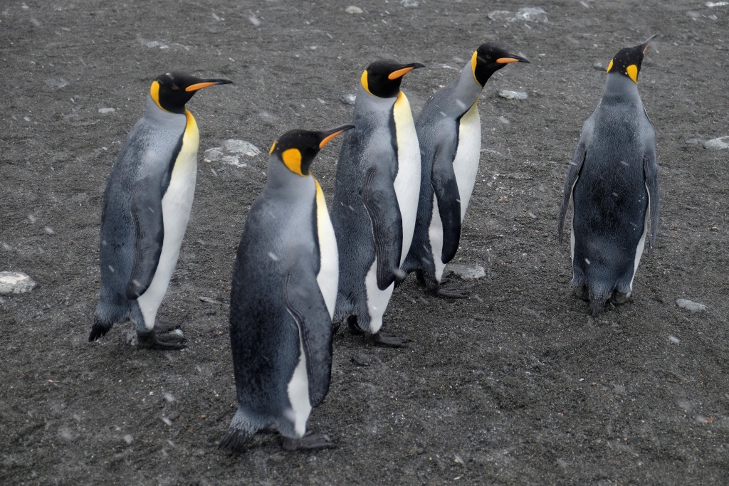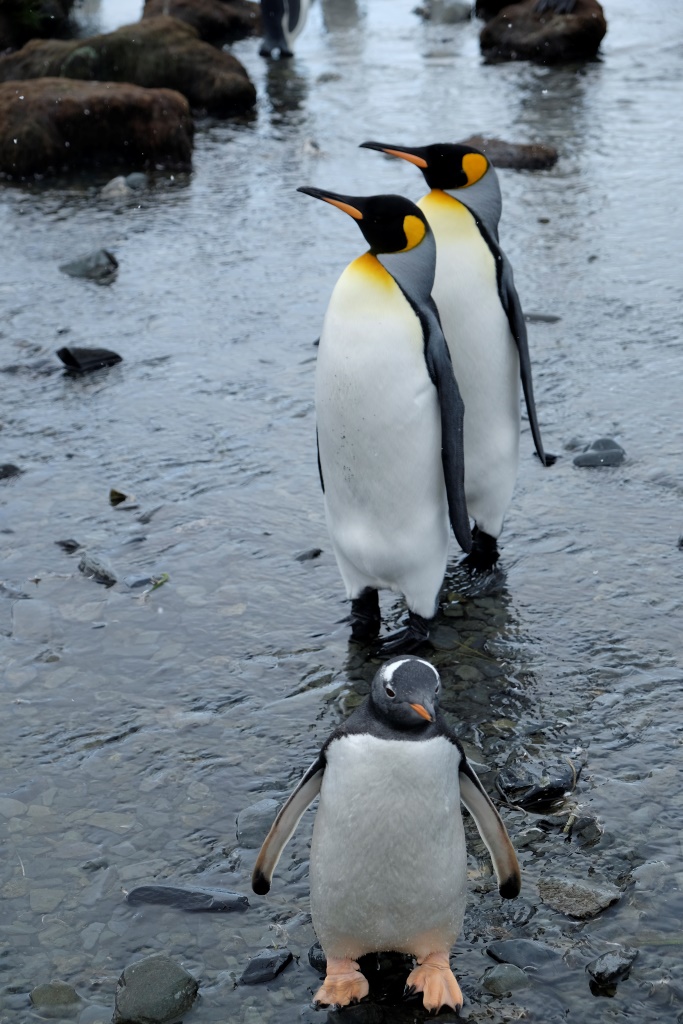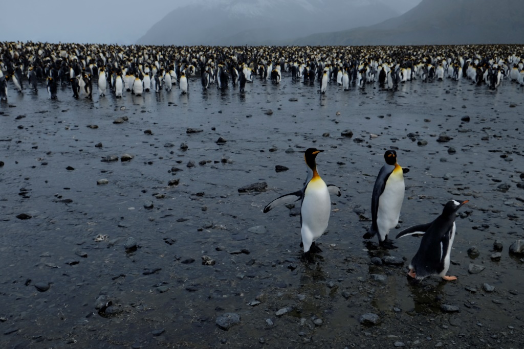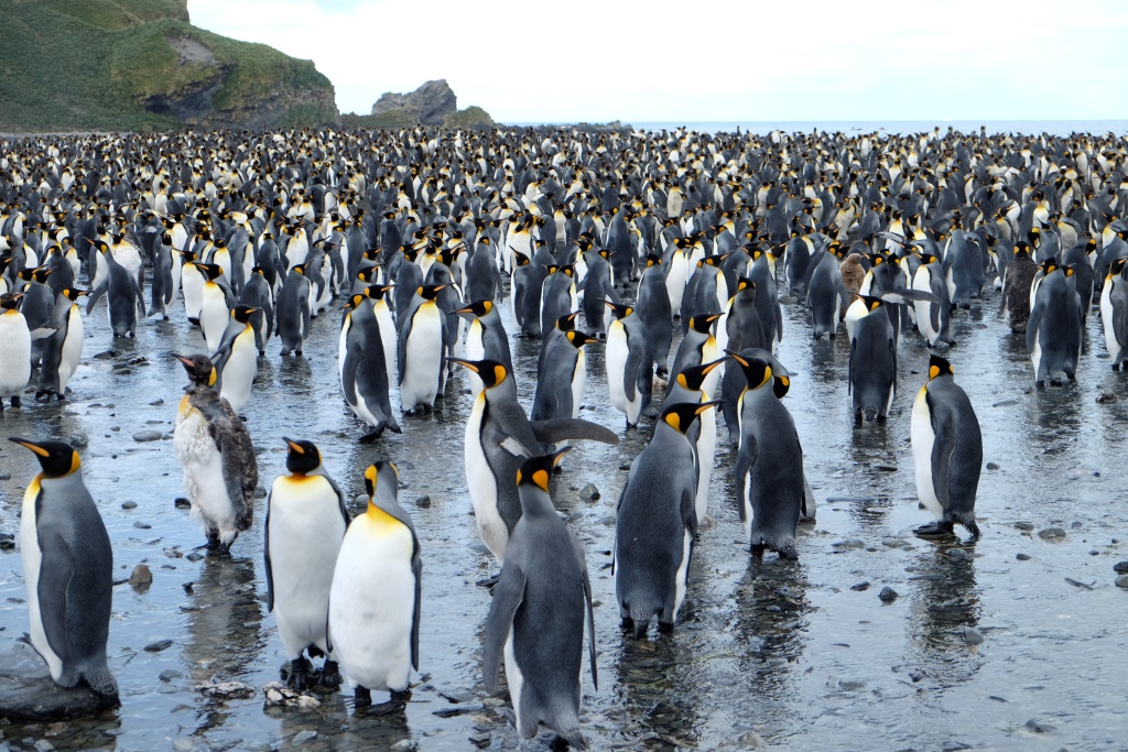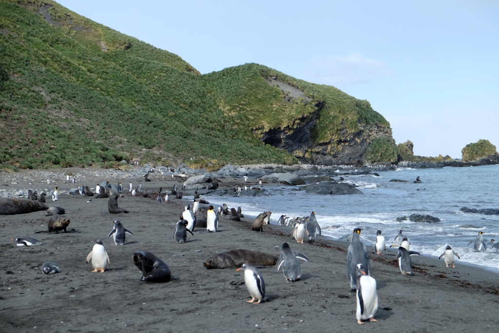 Mēs ejam gar krastu tālāk – tas, kas pa gabalu izskatās pēc akmeņainas klinšu sienas, patiesībā ir karalisko pingvīnu kolonija. Pingvīnu okeāns, kurš mutuļo un sarunājas. Mēs klusēdami staigājam starp pingvīniem un izskatāmies viegli apdulluši.