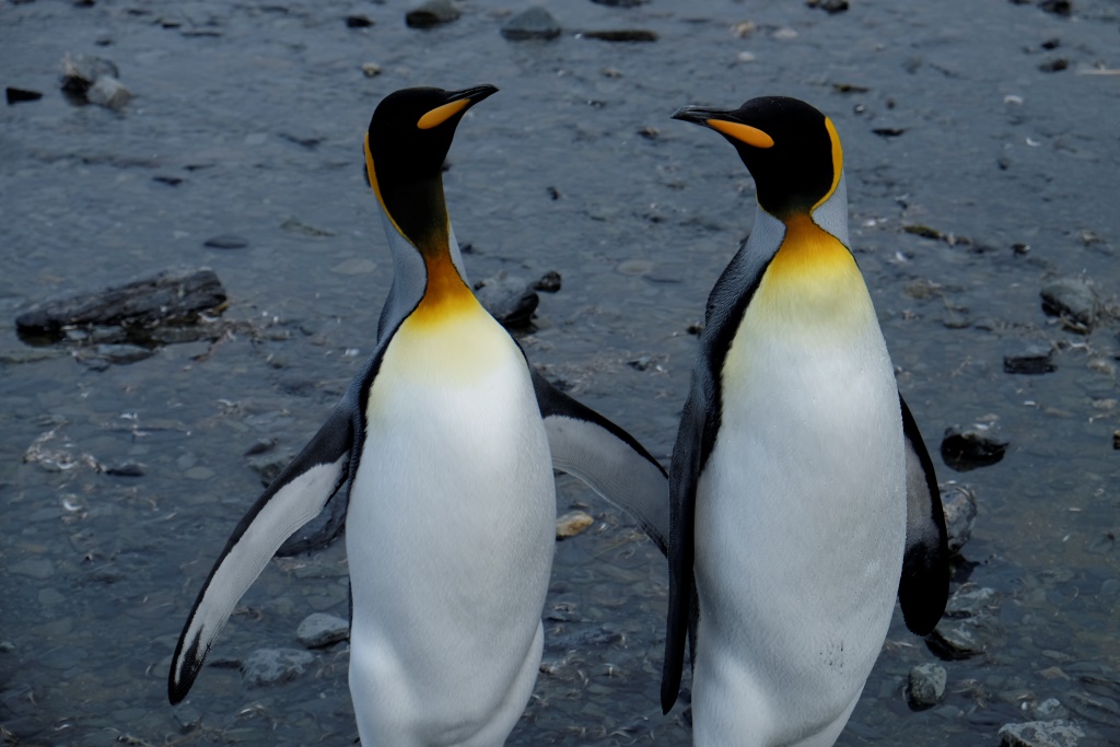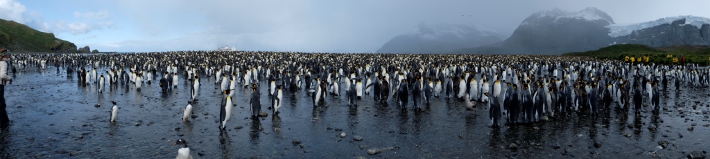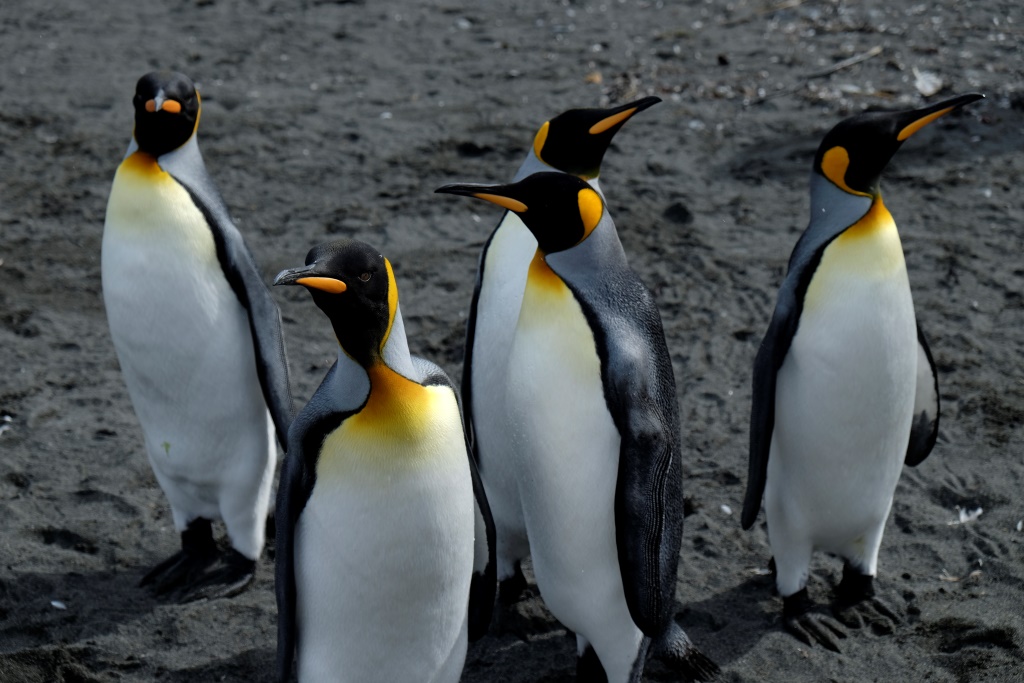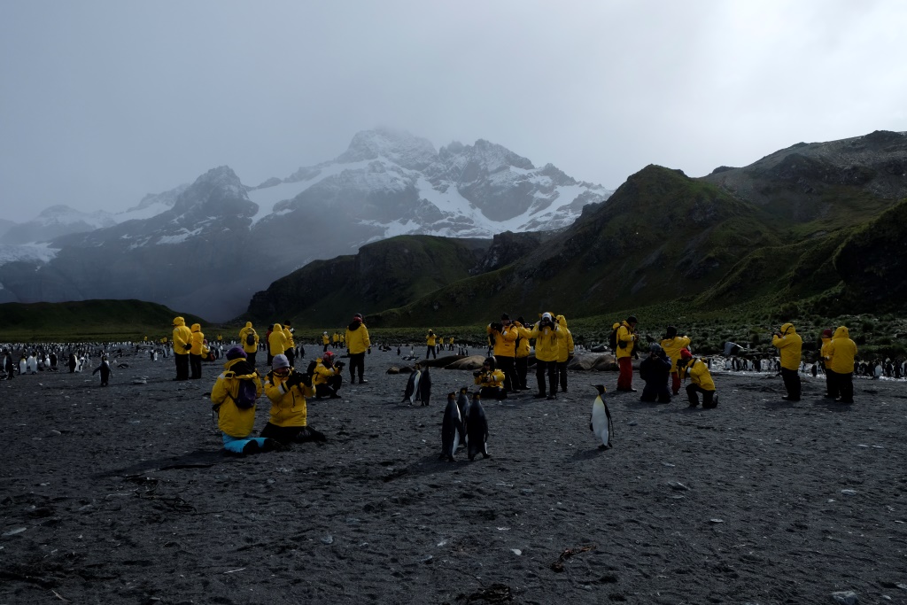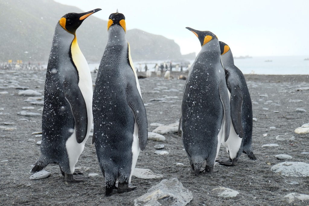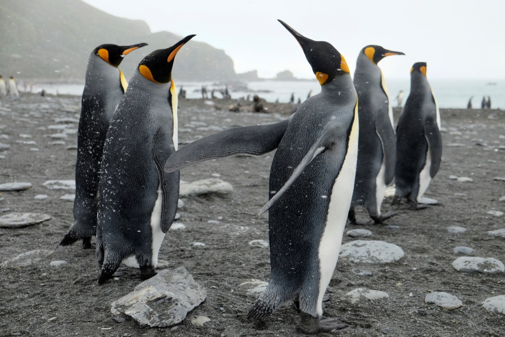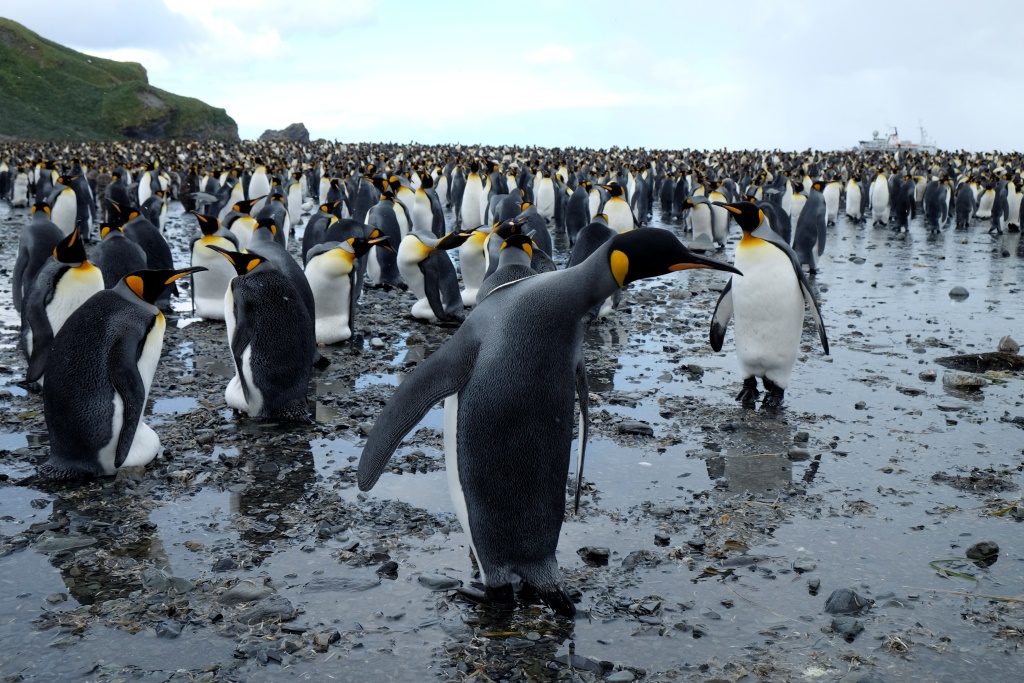 Mēs ejam gar krastu tālāk – tas, kas pa gabalu izskatās pēc akmeņainas klinšu sienas, patiesībā ir karalisko pingvīnu kolonija. Pingvīnu okeāns, kurš mutuļo un sarunājas. Mēs klusēdami staigājam starp pingvīniem un izskatāmies viegli apdulluši.