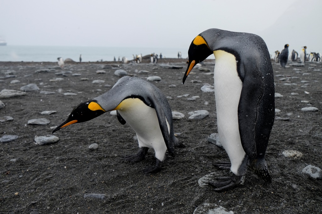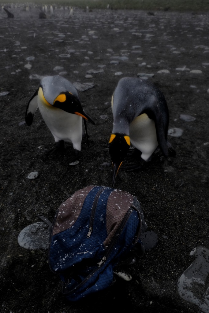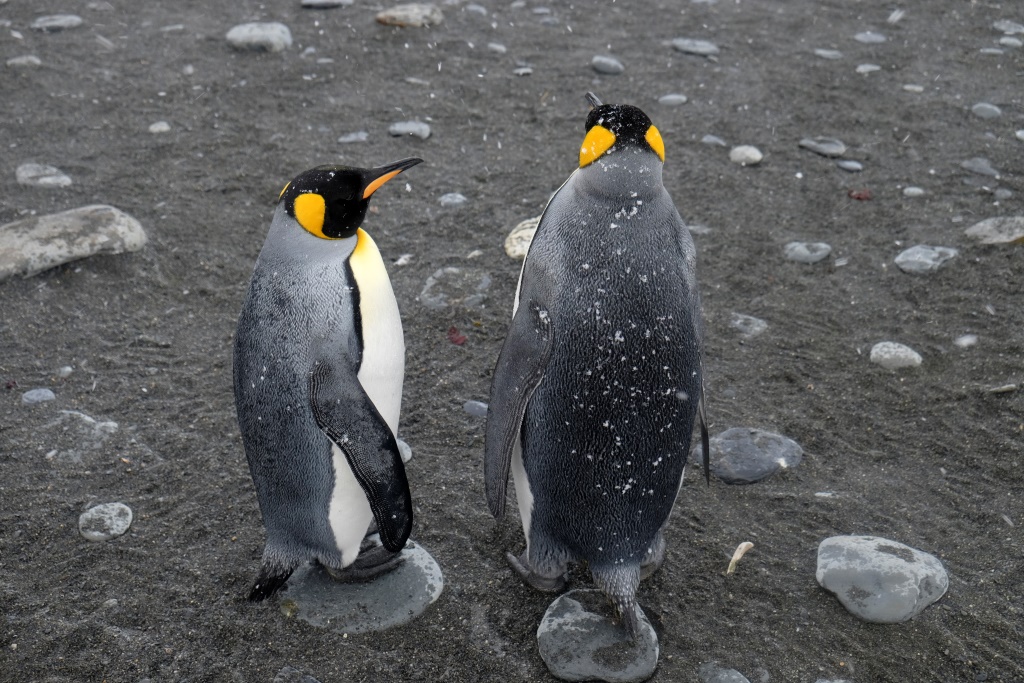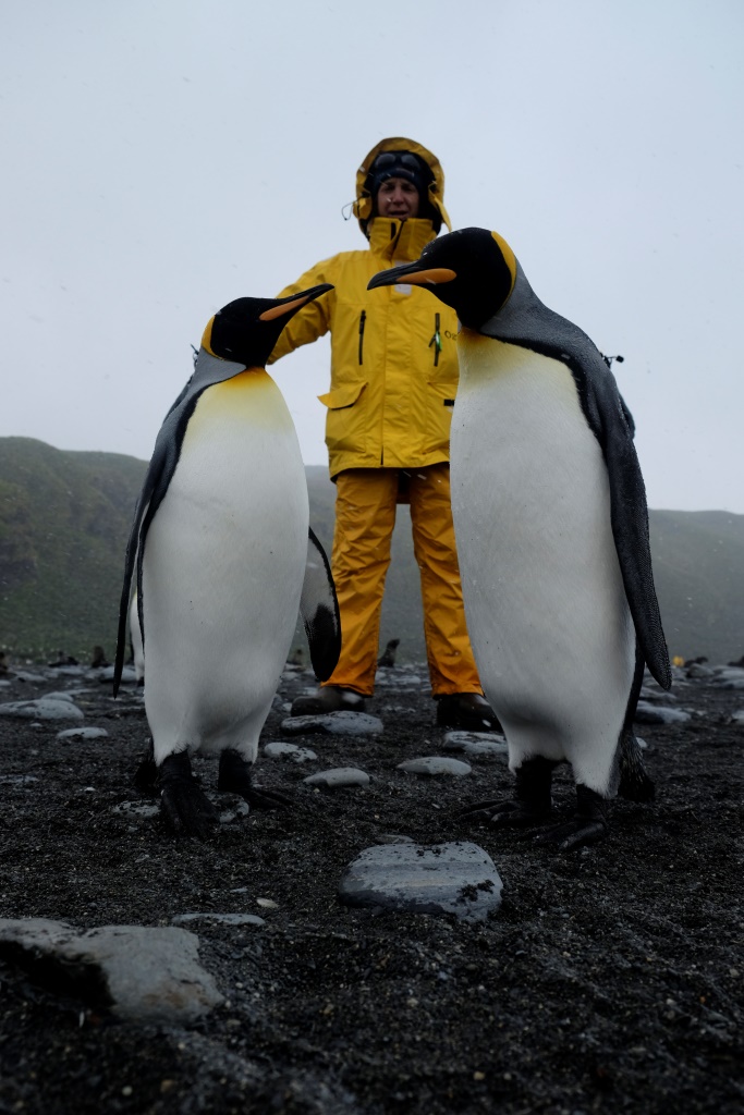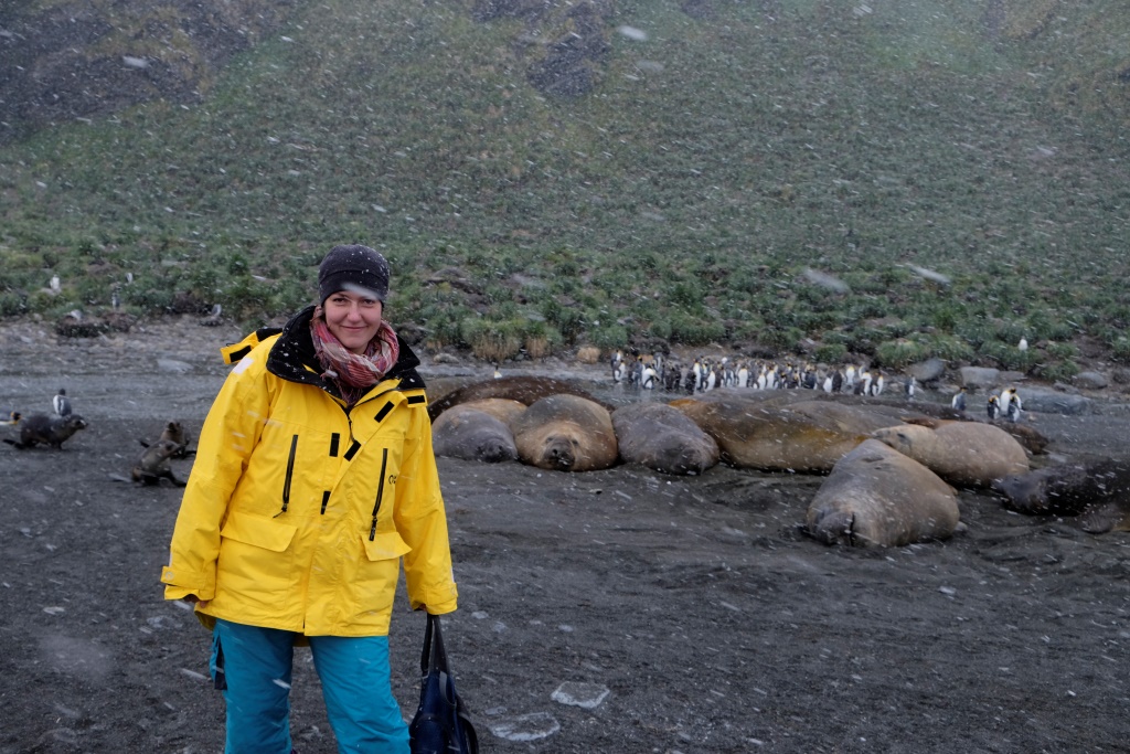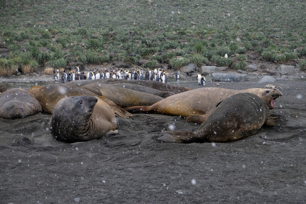 Pēcpusdienā piestājam krastā uz ilgāku laiku. Tur, kopā ar ekspedīcijas komandu mūs sagaida karaliskie pingvīni. Tērpti savos viesmīļa uzsvārčos viņi gāzelēdamies staigā mums apkārt. Netālu guļ arī milzīgie jūras ziloņu ķermeņi. Uz vecumu šo dzīvnieku deguni nedaudz atgādina ziloņa snuķi, tā šie tikuši pie nosaukuma. Ceļa biedrenei Alisonei izdevies noķert, manuprāt, burvīgu viena eksemplāra portretu.