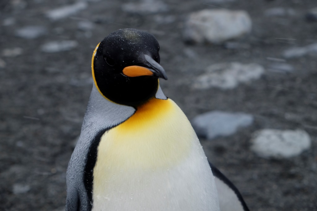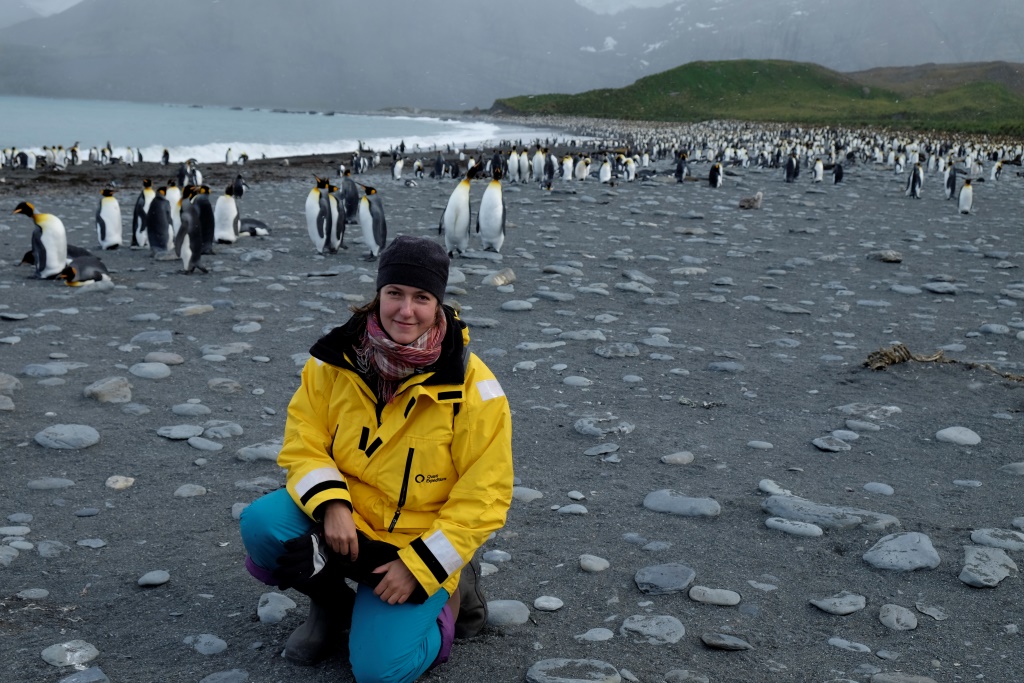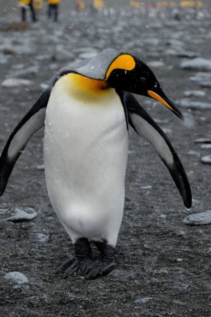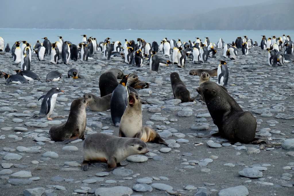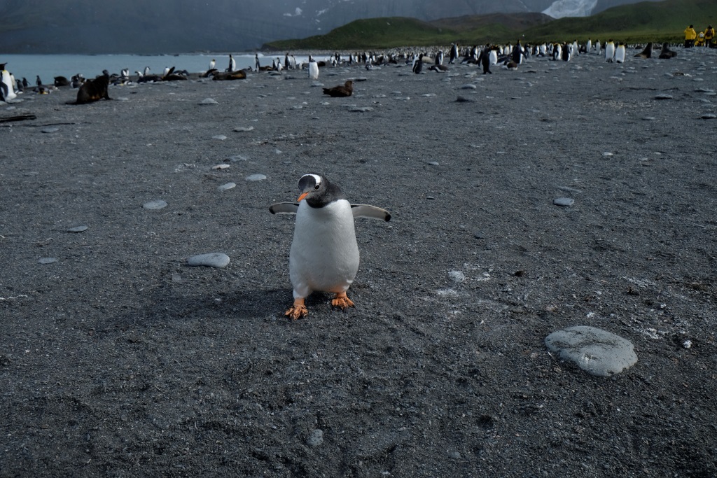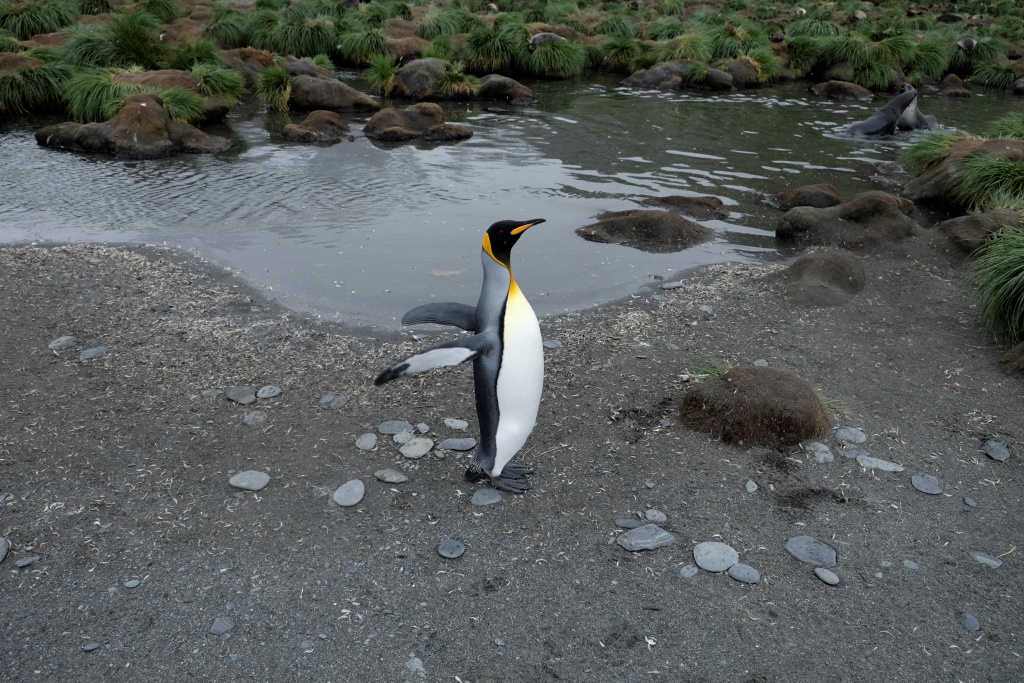 Pēcpusdienā piestājam krastā uz ilgāku laiku. Tur, kopā ar ekspedīcijas komandu mūs sagaida karaliskie pingvīni. Tērpti savos viesmīļa uzsvārčos viņi gāzelēdamies staigā mums apkārt. Netālu guļ arī milzīgie jūras ziloņu ķermeņi. Uz vecumu šo dzīvnieku deguni nedaudz atgādina ziloņa snuķi, tā šie tikuši pie nosaukuma. Ceļa biedrenei Alisonei izdevies noķert, manuprāt, burvīgu viena eksemplāra portretu.
