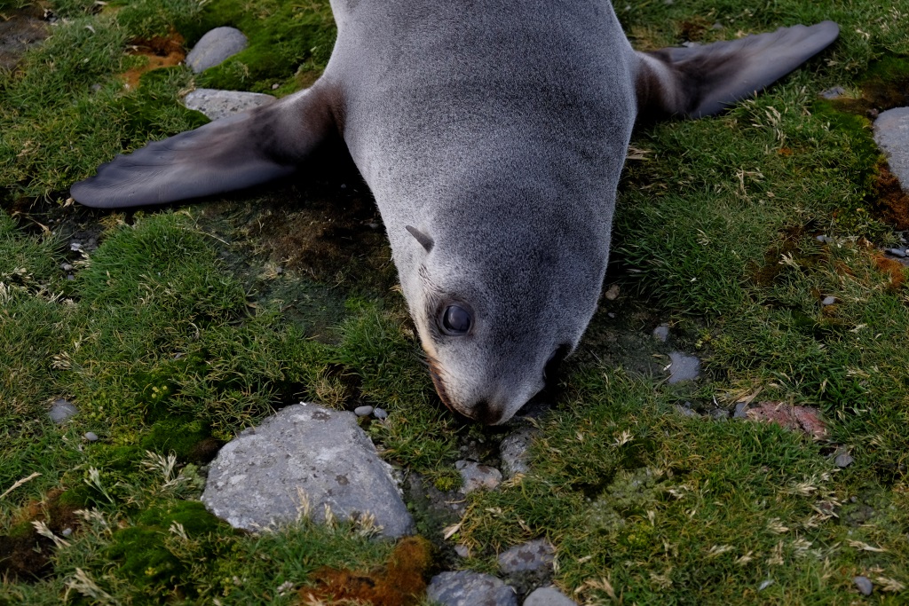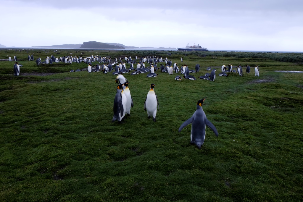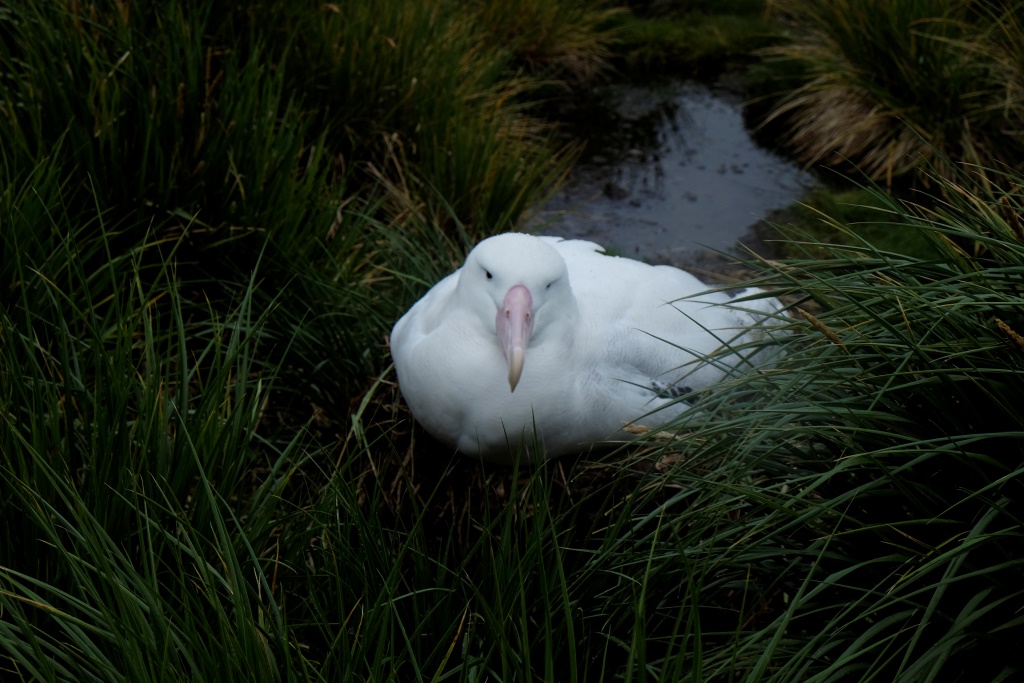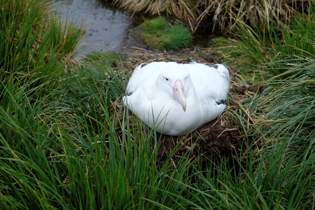Uz kuģa atgriezušies ieturam brokastis un esam gatavi jauniem piedzīvojumiem – šoreiz esam piestājuši pasaulē lielāko jūras putnu, klejojošo albatrosu ligzdošanas vietā. Šo putnu spārnu vidējais platums ir 3 metri, kad tāds laižas pāri galvai, sajūta ir vienlaikus grandioza un mazliet biedējoša. Albatrosi var izaudzināt mazuli reizi divos gados un perēšanas procesā piedalās abi vecāki – kamēr viens perē olu vai sargā mazuli, otrs dodas okeānā ieturēties. Pēc pārtikas šie putni var doties pat 7500 km tālu. Viens no albatrosiem bijis tik neprātīgs, ka izveidojis ligzdu pie pašas novērošanas platformas, varam milzīgo putnu apskatīt pavisam tuvu. Cenšamies uzvesties, cik vien klusu iespējams, lai netraucētu putnu, šis pacietīgi vēro mūs, tāpat kā mēs viņu.