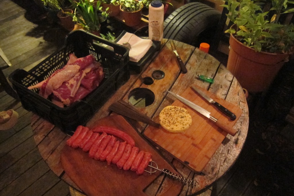 Drīz parādās arī Manuels, sarokojas ar mums, vedina uz otro stāvu, kur notiks vakariņas un iepazīstina ar pārējiem viesiem – lielākā daļa ir vietējie, bet ir arī pāris no Montevideo. Kopumā esam cilvēki desmit. Zaļo augu apvītā un lampiņu virtenēm izgreznotā terase ir pasakaina. Tāpat kā ēdiens. Vakariņas sākas ar nelielām uzkodām – ceptu sieru, vistas salātiem, kaltētiem tomātiem, pesto. Kad esam remdējuši pirmo izsalkumu, Manuels sāk iznēsāt asado – ceptu gaļu. Kā kāds gabaliņš top gatavs uz blakus stāvošā grila, tas tiek sagriezts sīkāk un uz neliela dēlīša iznēsāts viesiem. Šis process atkārtojas reizes septiņas vismaz. Uz beigām mēs vairs neesam spējīgi neko dabūt iekšā un tie viltnieki, protams, uz beigām atstājuši pašu labāko. Lai nu kā – vakariņu noslēgumā visi elšam un pūšam. Es noeju uz pirmo stāvu, lai apmeklētu labierīcības, un ko es tur redzu – Marija virtuvē cep pankūkas, kaut kas traks.