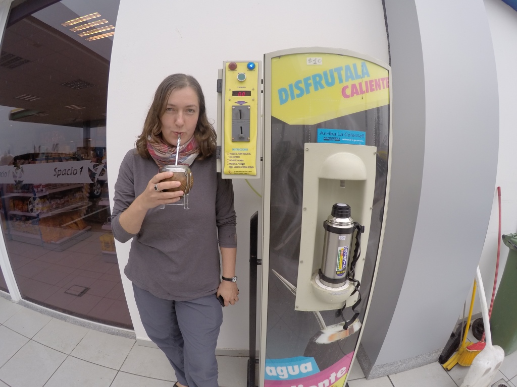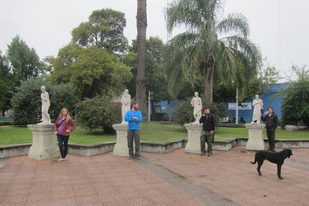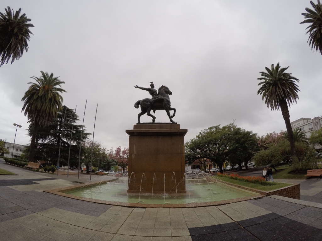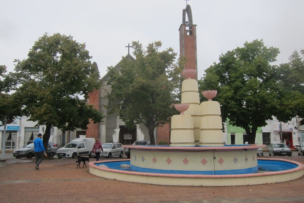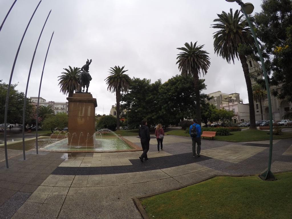 Pusdienlaikā piestājam nelielā pilsētiņā Carmelo – apēdam pa vietējam hamburgerveidīgam čivito, izstaigājam centrālo laukumu, iedraudzējamies ar melnu suni un braucam tālāk. Diena ir pelēka un lietaina, ainava diezgan vienmuļa – nevarētu teikt, ka pagaidām mēs būtu Urugvajas pārņemti. Pēcpusdienā ierodamies pilsētā Mercedes, tā ir salīdzinoši lielāka un salīdzinoši glītāka – pāris stundas veltām centra apskatei. Šeit ir arī veikali un iespēja atjaunot somas saturu, ja ir tāda nepieciešamība. Karims prasa, vai manā iepirkumu sarakstā ir kāda lieta. Atbildu, ka nekas akūti svarīgs, bet apsveru garderobes atjaunošanu, jo pāris krekliņi, valkāti diendienā, ir visai bēdīgā stāvoklī, kā arī gribu iegādāties saliekamo nazi, diezgan bieži esmu izjutusi vajadzību pēc tāda – līdz šim gan ir bijusi iespēja to aizņemties, bet ne jau vienmēr tā būs. Aha, konstatē Karims.