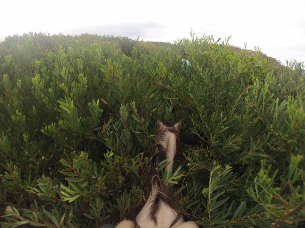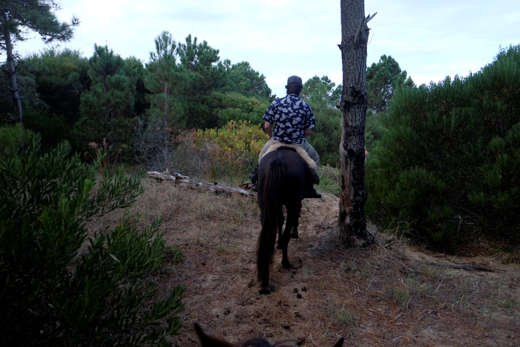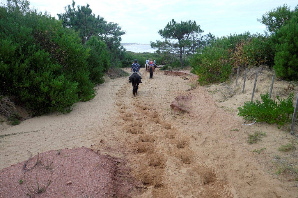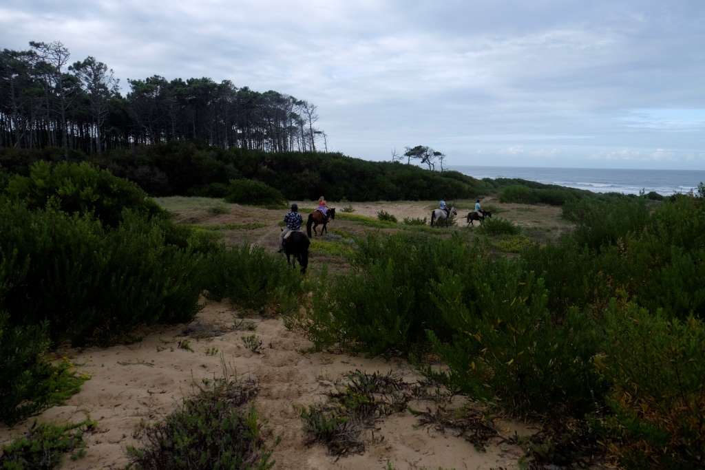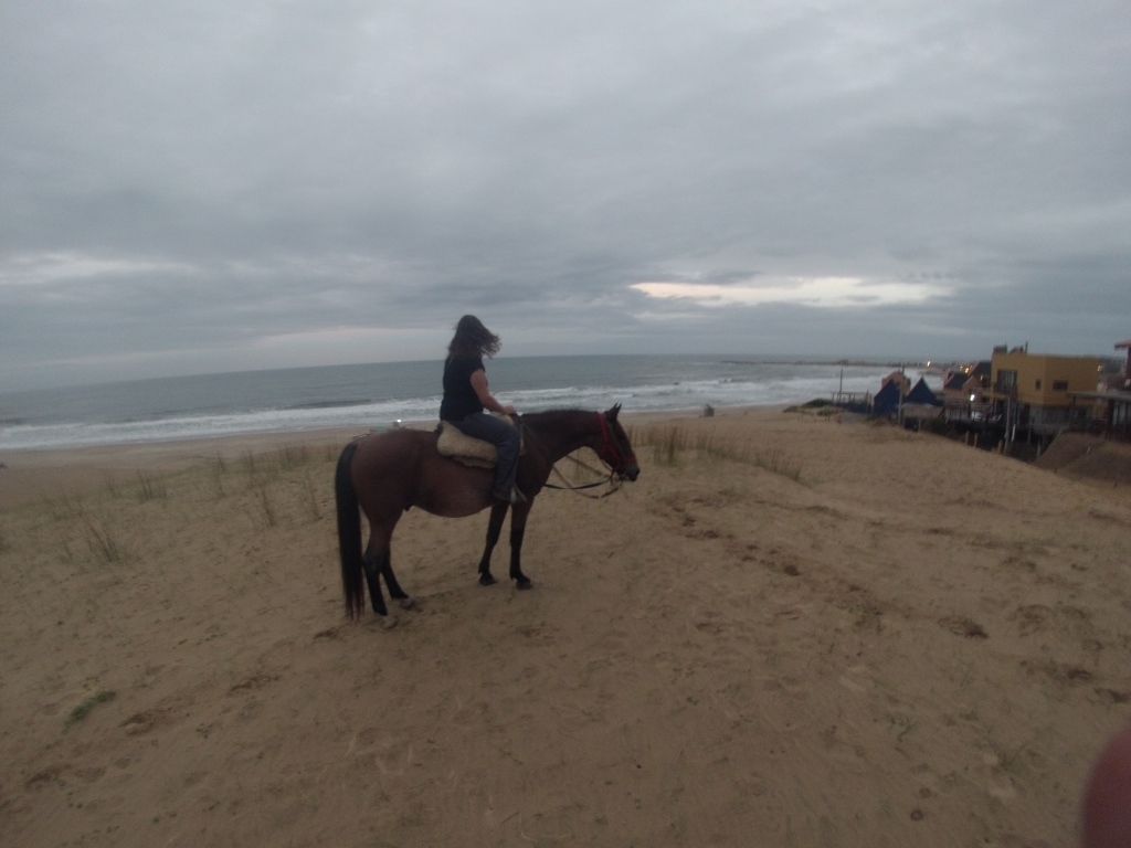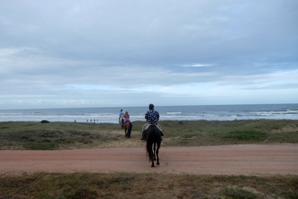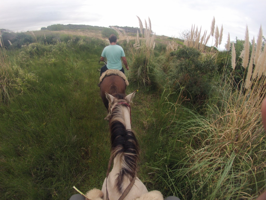 Kad visi esam zirgā, Fabians mums katram izsniedz koka zariņu, ar ko pamudināt zirgu, izstāsta, kā zirgs vadāms un sākam lēnītēm soļot ārā no pilsētas. Es jūtos ļoti nestabili. Tik augstu no zemes, kājas šļūk ārā no kāpšļiem, zvalstos no vienas sedlu malas uz otru. Vienā rokā esmu sagrābusi pavadu, ar otru iekrampējusies sedlu malā. Šaumas. Kad tiekam kāpu zonā, Fabiana zirgs sāk vieglu riksi un visi pārējie viņam seko. Jēziņ! Man ir sajūta, ka ķermenī kratās katra šūna un pavisam drīz nonākšu zemē. Savā muļķībā esmu uzkārusi kaklā fotoaparātu, tas sitas gar rokām. Pēc pusstundas palūdzu pauzi – novelku džemperi un ielieku fotoaparātu somā, nu ir mazliet labāk. Pamudināmo kociņu esmu izmetusi jau sen, mans zirgs saprot daudz labāk par mani, ko un kad vajag darīt.