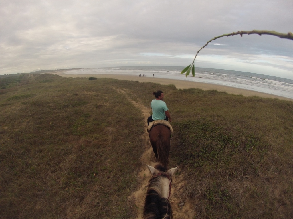 Tad mēs izjājam pludmalē. Te nu ir plašumi un zirgi, sajutuši to, uzņem vēl ātrāku tempu. Brendons atkal ik pa laikam piejāj blakus kādam no mūsu zirgiem un izaicina viņu skrieties. Tā mēs labu brīdi lēkšojam, apsteidzot cits citu, neticama brīvības sajūta. Vēlāk Karims no Brendona gopro video materiāliem samontē mazu filmiņu. Droši vien, ka pēc mana stāstītā jūs iztēlojāties mūs visus kā kovbojus, pieplakušus zirgu mugurām un lēkšojot kā senās amerikāņu filmās. Kā redzēsiet video, mēs tāpat (izņemot Brendonu) izskatāmies pēc iesācējiem (īpaši es), bet sajūtas bija vienreizējas un tie, kas ir mēģinājuši mācīties jāt, sapratīs.