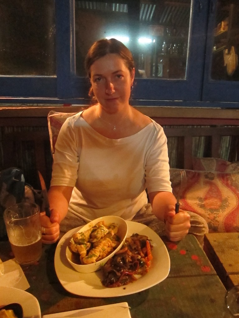 Noskalojuši sviedrus un mirkli atpūtušies, ejam vakariņās. Šovakar ieturēsimies krodziņā, kas pieder itāļu pārim, šīs valsts virtuvē reti nākas vilties. Un arī šoreiz viss ir perfekti – gan pamatēdiens, gan saldais ir pasakaini gardi. Citādi nemaz nevarēja būt – Guna Bazone ir savā dzimšanas dienā vēlējusi man apēst kaut ko garšīgu un zinot viņas gurmāna pieeju, tās nedrīkstēja būt vakariņas ar frī kartupeļiem un „balto mērci”. Pat, tev, Gunīt, būtu garšojusi šī zivs un siera kūka! Paldies un vēlreiz bučas aizgājušajā!