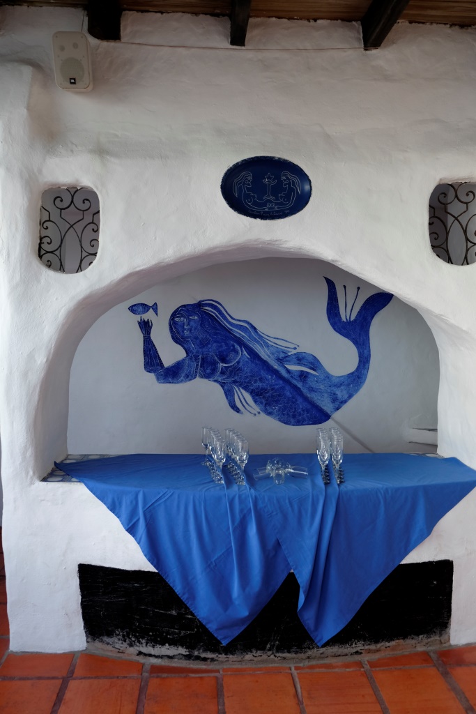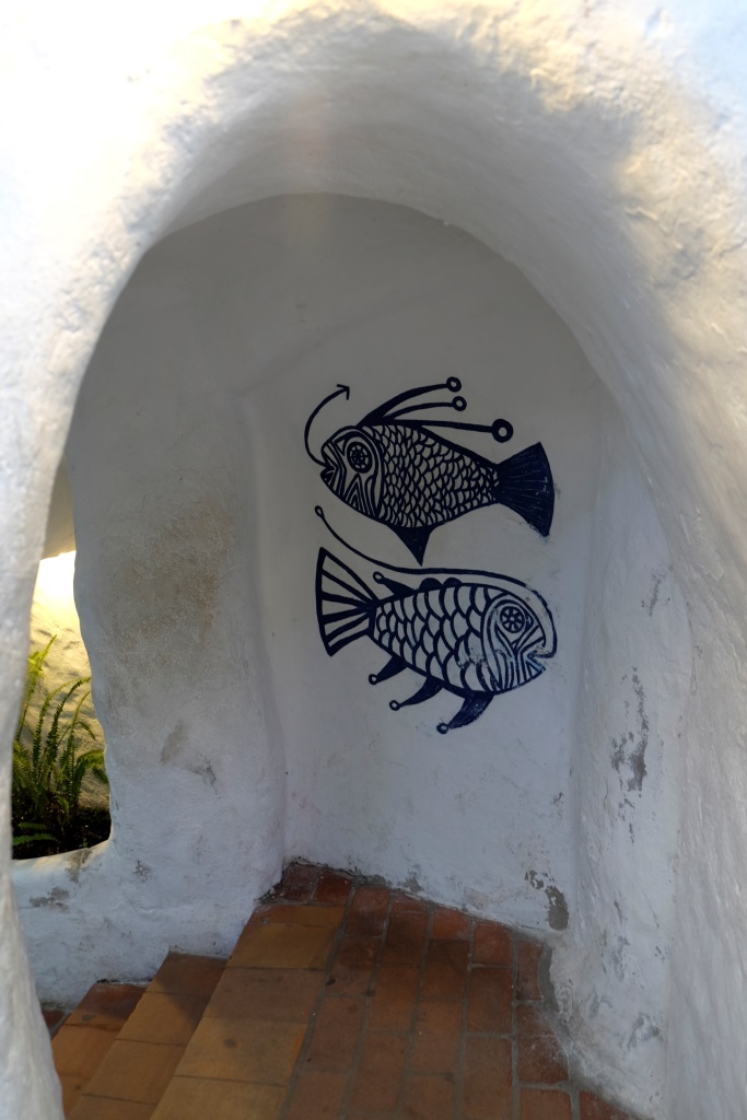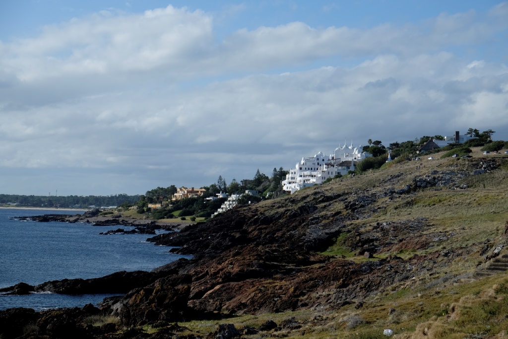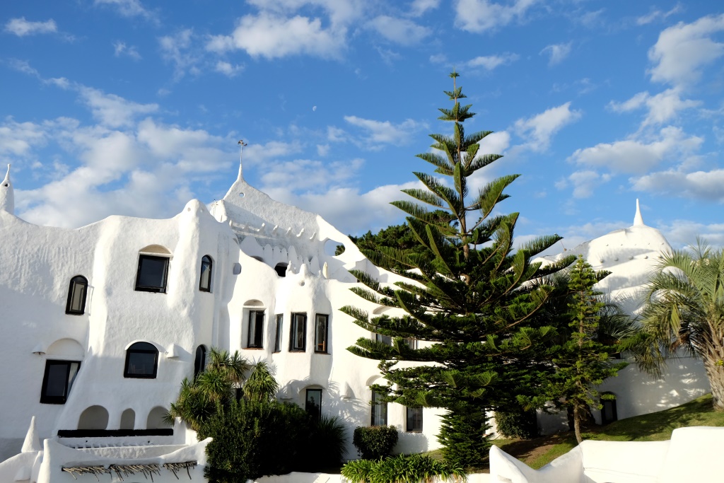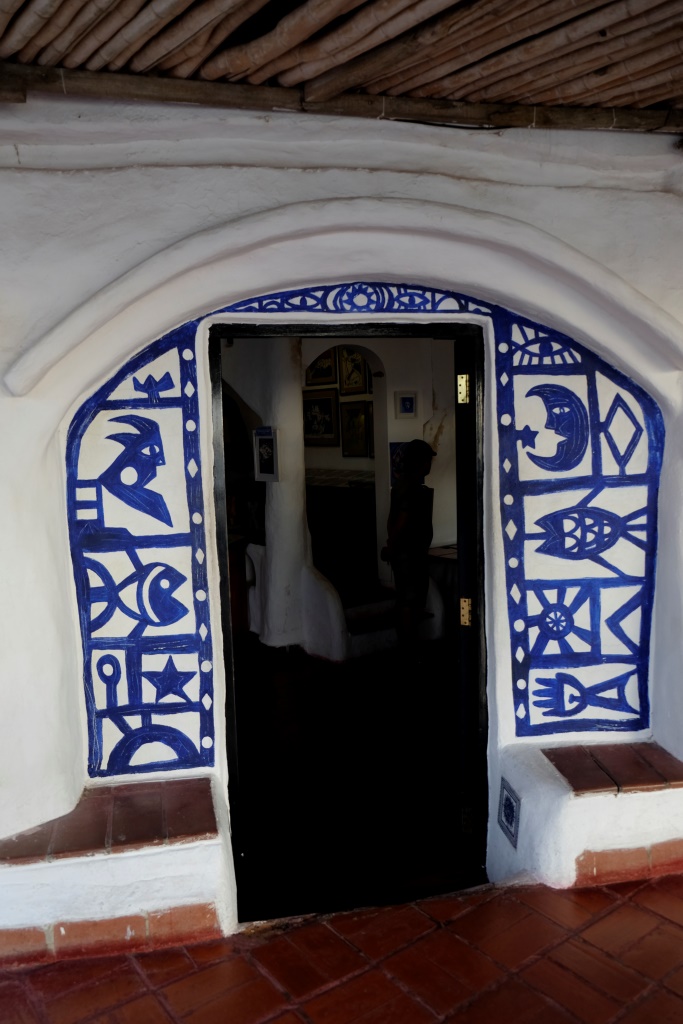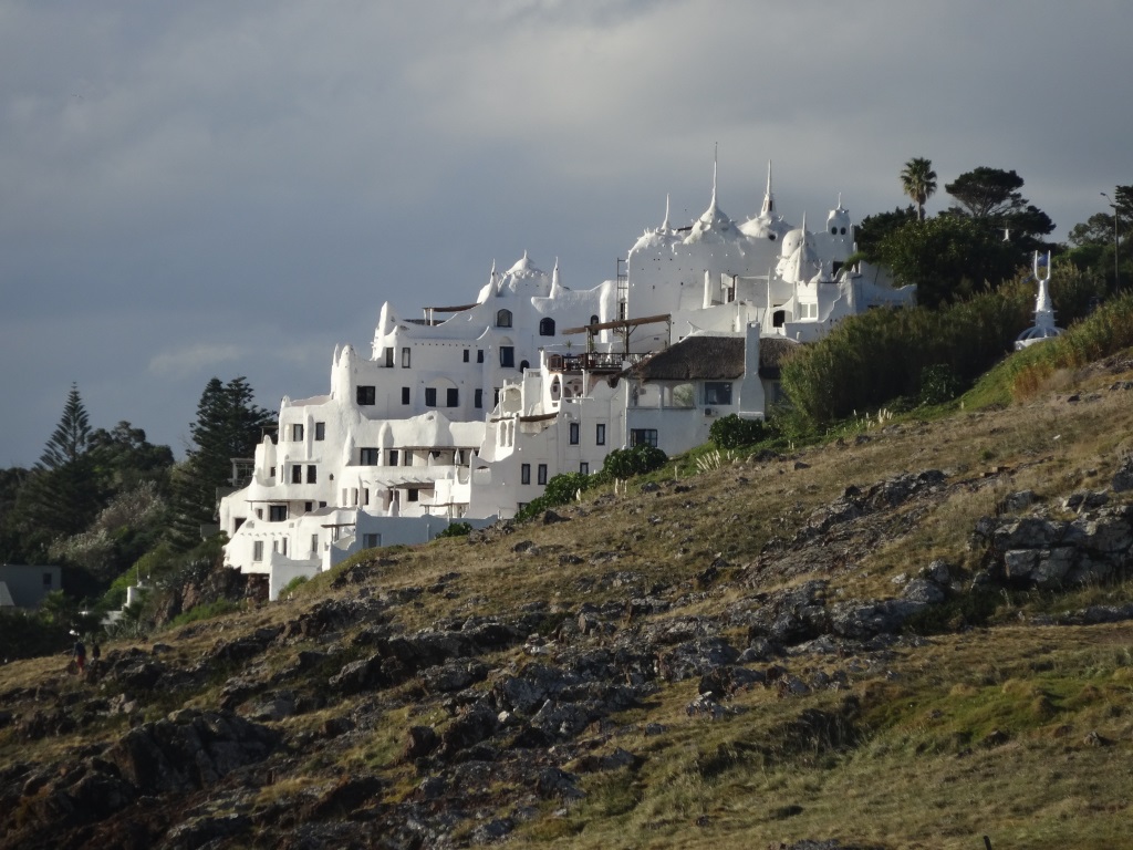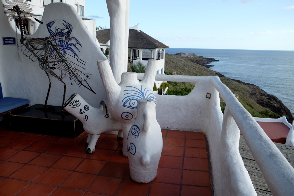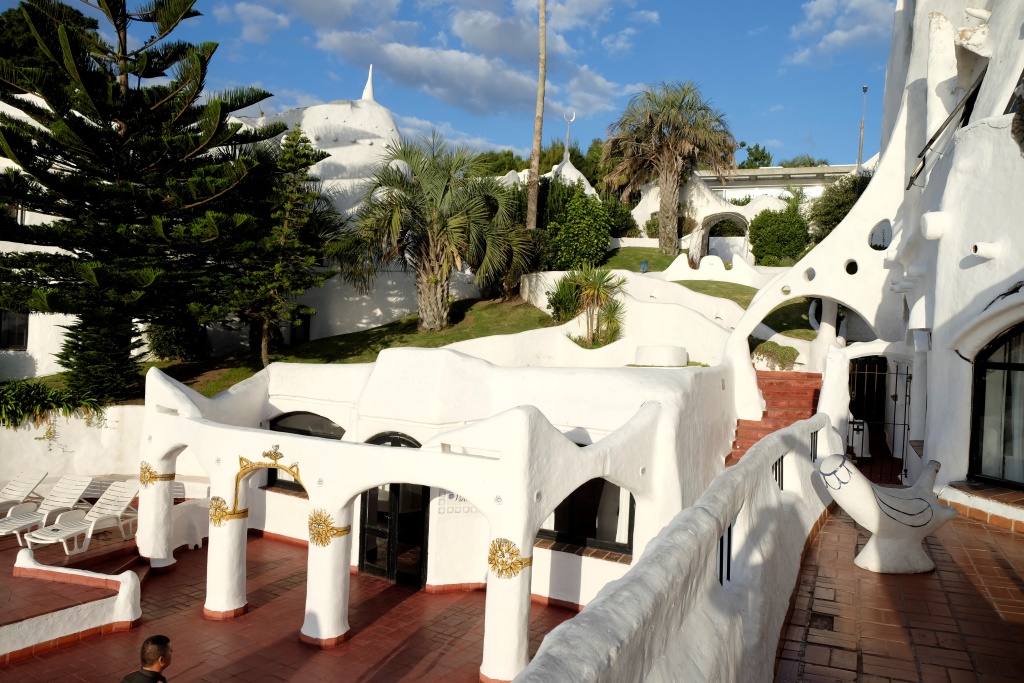 Vēlā pēcpusdienā atkal piestājam pie okeāna, pa gabalu jau redzamas mūsu galamērķa baltās augstceltnes. Pavisam netālu rēgojas cita balta celtne, kas mūsu uzmanību saista daudz vairāk – tās arhitektūra izskatās dikti neordināra, jābrauc izpētīt tuvāk. Izrādās, esam atkūlušies līdz Casapueblo – pasaules slavenā urugvajiešu mākslinieka Karlosa Paeza Vilaro (Carlos Paez Vilaro) namam, ko viņš 40 gadu laikā uzbūvējis pats savām rokām, piepalīdzot vien draugiem un vietējiem zvejniekiem. Esmu diezgan droša, ka lielākā daļa no jums ir pazīstami ar šī ģēnija daiļradi, bet sev par kaunu atzīšos, ka es nebiju vis. Būvējot šo kompleksu, Vilaro iedvesmojies no putnu ligzdām, un atvainojas arhitektūrai par sava lolojuma brīvību. Multifunkcionālais autodidakts atstājis pasaulei milzum daudz radošuma, ietērptus gleznās, gobelēnos, grāmatās, mūzikā, ēku sienās un keramikas krūkās. Līdz pat savai aiziešanas dienai pērnā gada februārī, viņš turpinājis gleznot, muzicēt, radīt. Nav brīnums, ka radošums ir burtiski fiziski sajūtams šīs ēkas sienās. Tagad viņa mājā izveidots muzejs, tajā par ieeju jāmaksā – mēs ar Rafaēlu nolemjam izpētīt vietu sīkāk no iekšpuses, pārējie paliek apskatīt ārieni un baudīt tuvojošos saulrietu.
