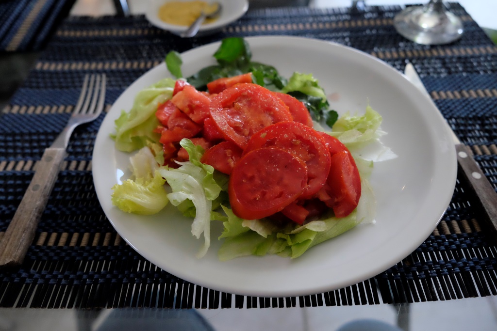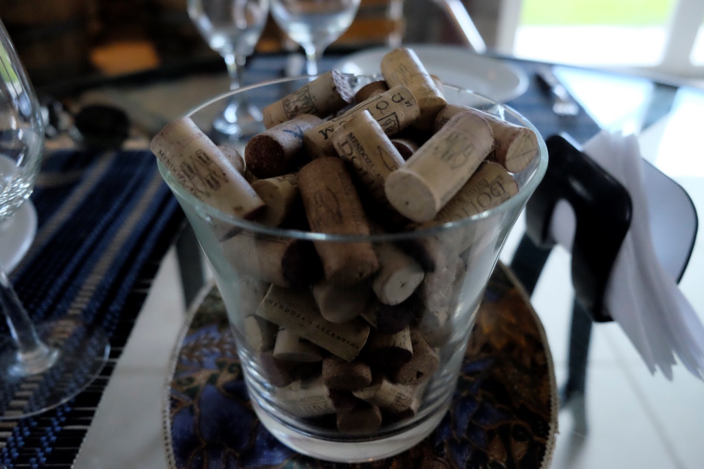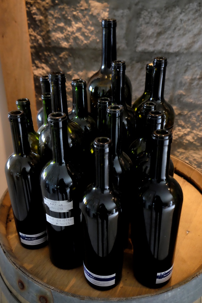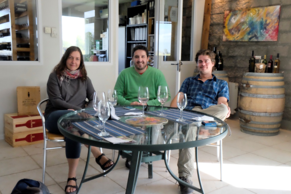 Šodien esam divas kompānijas, kas pieteikušās apmeklējumam un Saule sadala uzmanību starp diviem galdiņiem. Galvenais moments, protams, ir vīnu degustācija. Saule katru reizi atnes trīs vīna šķirnes, sapilda mums glāzēs, tad mēs tās pagaršojam un cenšamies uzminēt, kas ir kas. Kad esam nonākuši pie mūsu spriedumiem, viņa atgriežas ar tām pašām pudelēm, parāda etiķetes un mazliet pastāsta par katru no vīniem. Rafaēls ar savu profa degunu diezgan bieži pareizi uzmin gan vīnogu šķirnes, gan to, kurš no tiem ir kvalitatīvākais (un dārgākais). Paralēli vīnam nobaudām arī eko-šmeko salātus un kūku. Kad esam salīdzinājuši vīnus 13, dodamies pagrabā aplūkot ražotni.