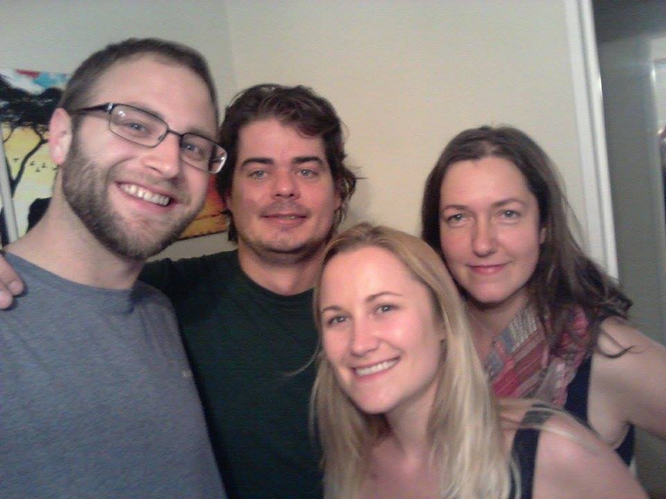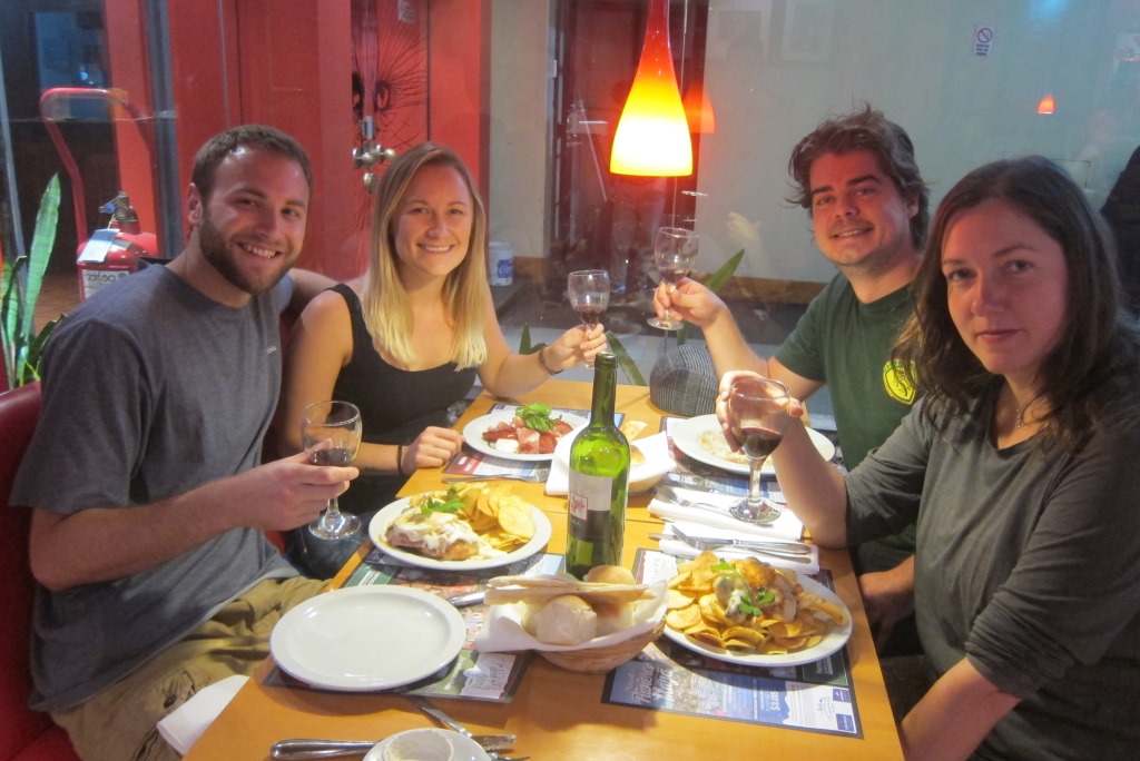 Mēs, savukārt, pastāstām kā mums katram gājis Buenosairesā un ko sadarījām Mendozā. Izstāstām par vīna degustācijas pasākumu, garām ejot pieminam arī britu pāri, ar kuriem kopā to veicām un ar kuriem iepriekšējā dienā Rafaēls piedalījās velo vīna degustācijas pasākumā. Tā kā Rafaēls šos nosauc vārdos, amerikāņi saausās. „Pag, meitene bija tumšiem, gariem matiem un ar viegli kosmisku paskatu, bet puisis garāks, ar ūsiņām, abi šobrīd ceļo mēnesi kopā”, Makss īsi raksturo britus. Protams, tie ir tie paši. Mēs visi esam neatkarīgi iepazinušies un labi pavadījuši laiku ar vienu un to pašu pāri. „Jaušība, jaušība!”, priecājas Rafaēls. Ātri nofotografējamies un aizsūtām šiem kopbildi. Briti arī priecājas un vēstulē prasa Rafaēlam, kādā veidā viņi tikuši atpazīti. „Vai jūs raksturojāt mūs kā neatvairāmi pievilcīgu britu pāri?”, viņi smejas. Rafaēls atbild kā ir: „Nē, kā britu pāri ar dikti jocīgiem vārdiem”.
