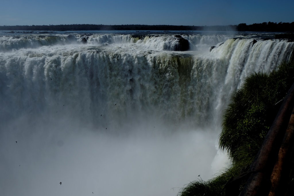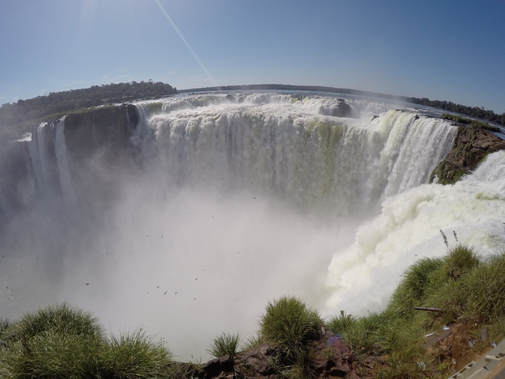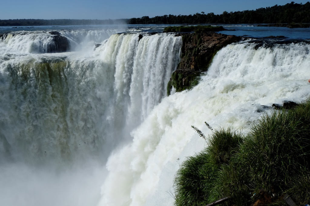 Sākam ar ūdenskritumu tālākā punkta – Velna rīkles apskati. Visi mums ieteica turp doties vispirms, pēcpusdienā šī vieta esot cilvēku pārbāzta. To par īpaši vientuļu nevarētu nosaukt arī šobrīd. Lai tiktu pie fotogrāfijas bez spalvainiem elkoņiem blakus, ir „jāķer moments”. Bet ir skaidrs, kāpēc tik daudzi vēlas apskatīt šo vietu. Jau pa gabalu var redzēt kā nekurienes vidū gaisā ceļas balti tvaika mākoņi. Seklais ūdens klajs izskatās tik mierpilns un nevainīgs, bet pēkšņi tas uz galvas metas lejā, pārvērzdamies baltā un mutuļojušā sienā. Velna rīkles galu redzēt nevar, to aizsedz tvaika mākoņi, kas piešķir vietai vēl mistiskāku paskatu. Tas izskatās aptuveni šādi.