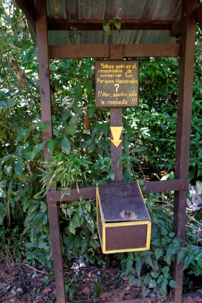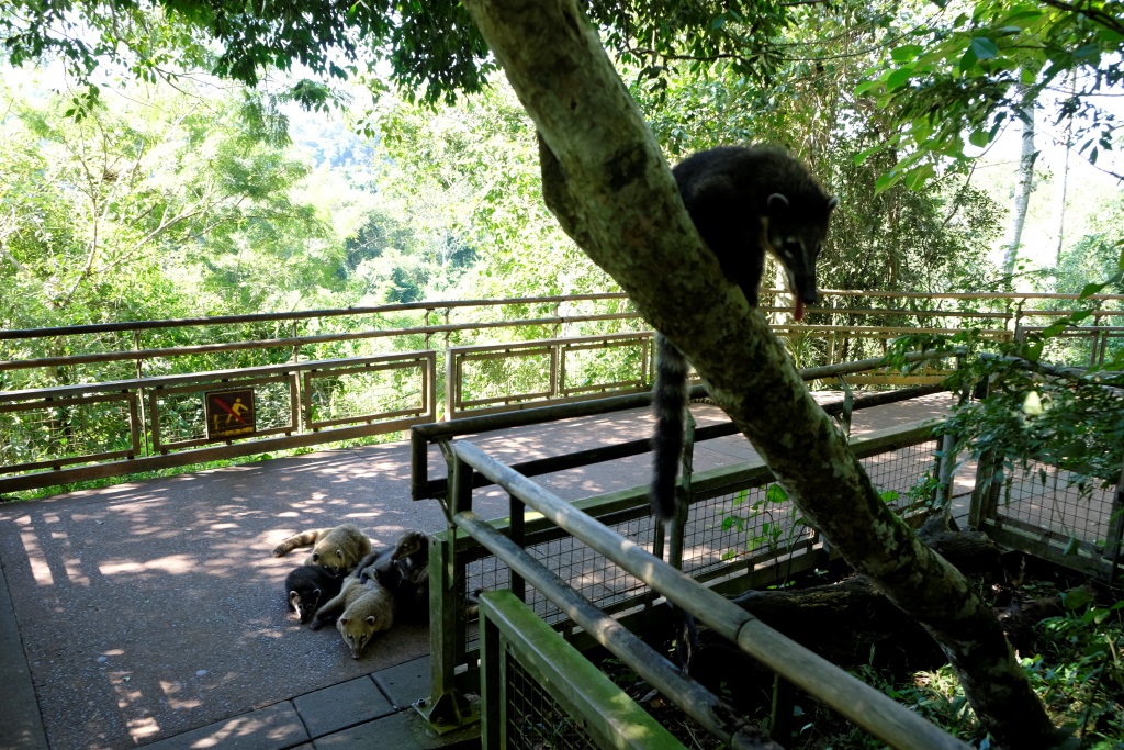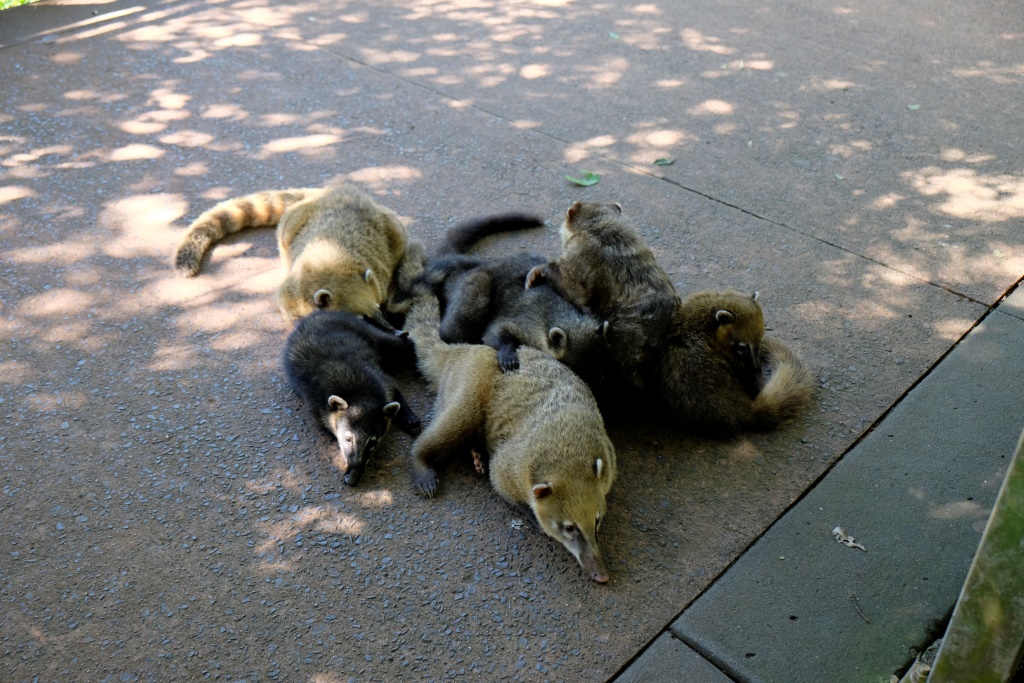 Teorētiski starp galvenajām apskates vietām var pārvietoties ar vilcieniņu, bet mēs izlemjam iet kājām – negribam stāvēt rindā un spiesties starp ļaudīm. Džungļu ceļš ir cilvēku tukšs un taureņu pilns. Izbaudām mierīgu pastaigu, cilvēki atkal parādās vien nākamās stacijas tuvumā. Pēc vēl vienas takas izpētes mūs ir pieveicis izsalkums. Pārtika šeit ir padārga, bet ēst gribas un mēs nopērkam vienu empanadu komplektu. Apsēžamies ieturēties un tad parādās viņi. Coaties spāniski un coatis angliski. Nezinu kā latviski, bet apzīmēšu kā koatis. Viltīgie dzīvnieki ar strīpainajām astēm labi zina, ko cilvēki šeit dara. Mēs ar Rafaēlu arī zinām, ko viņi šeit dara, tāpēc rūpīgi pieskatām savas pusdienas. Šejienes viesmīļa galvenais pienākums nav vis trauku novākšana vai ļaužu apkalpošana, bet gan koati prom dzīšana.
