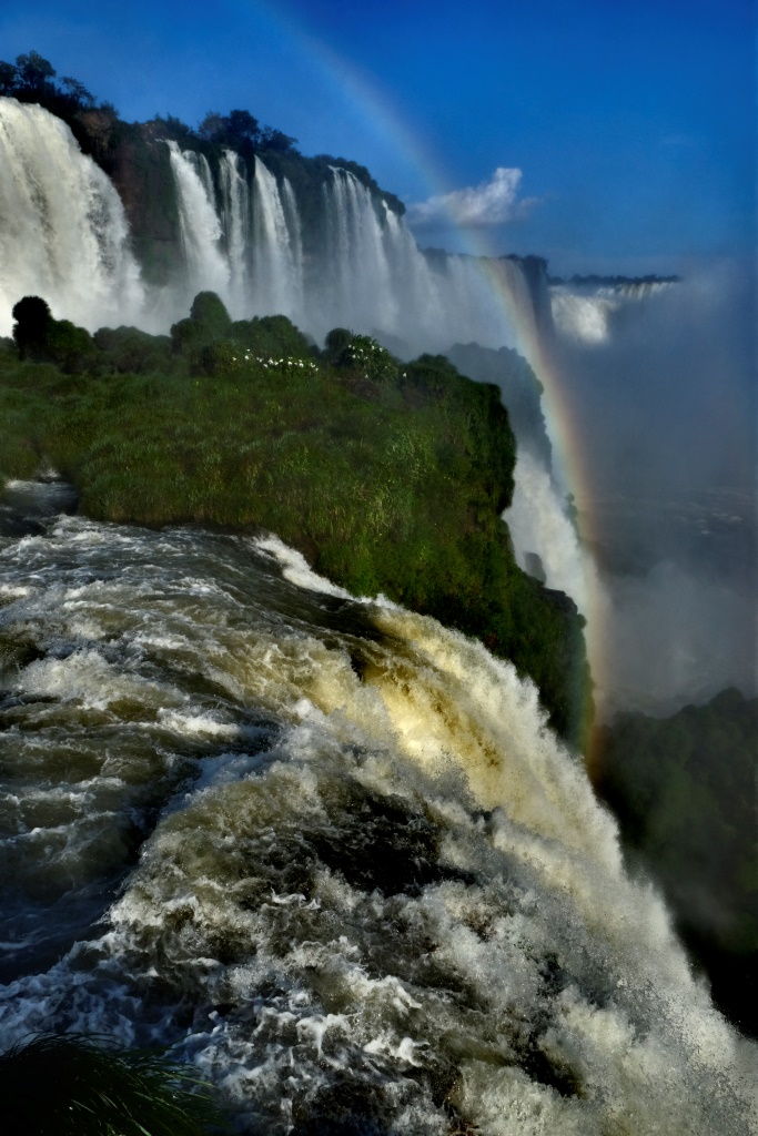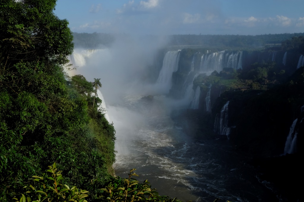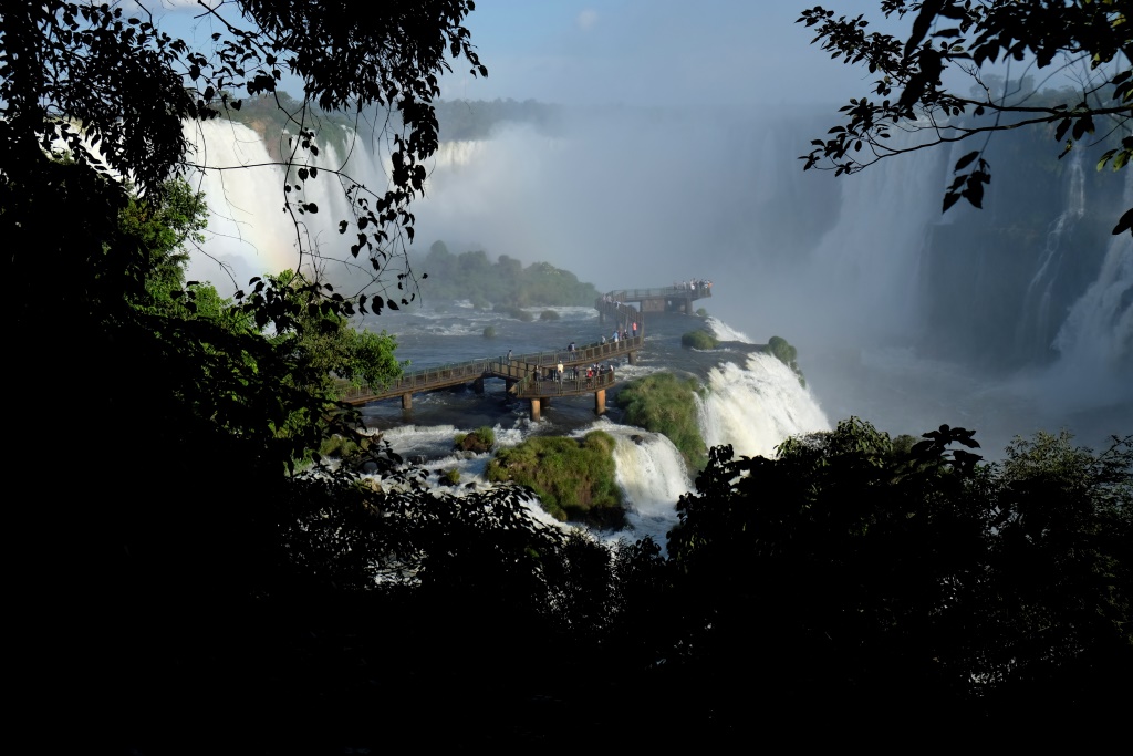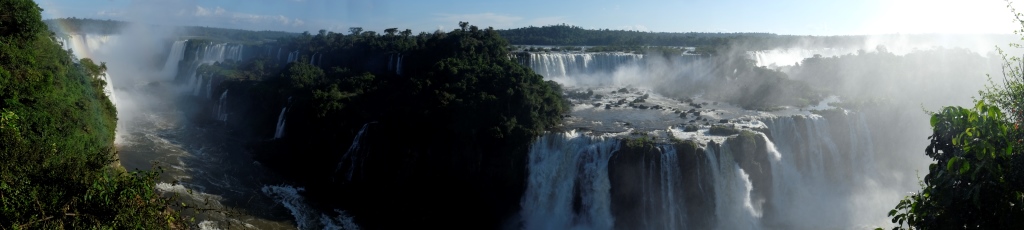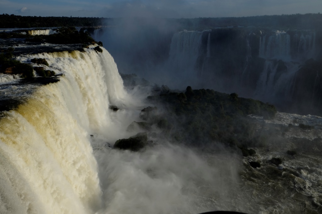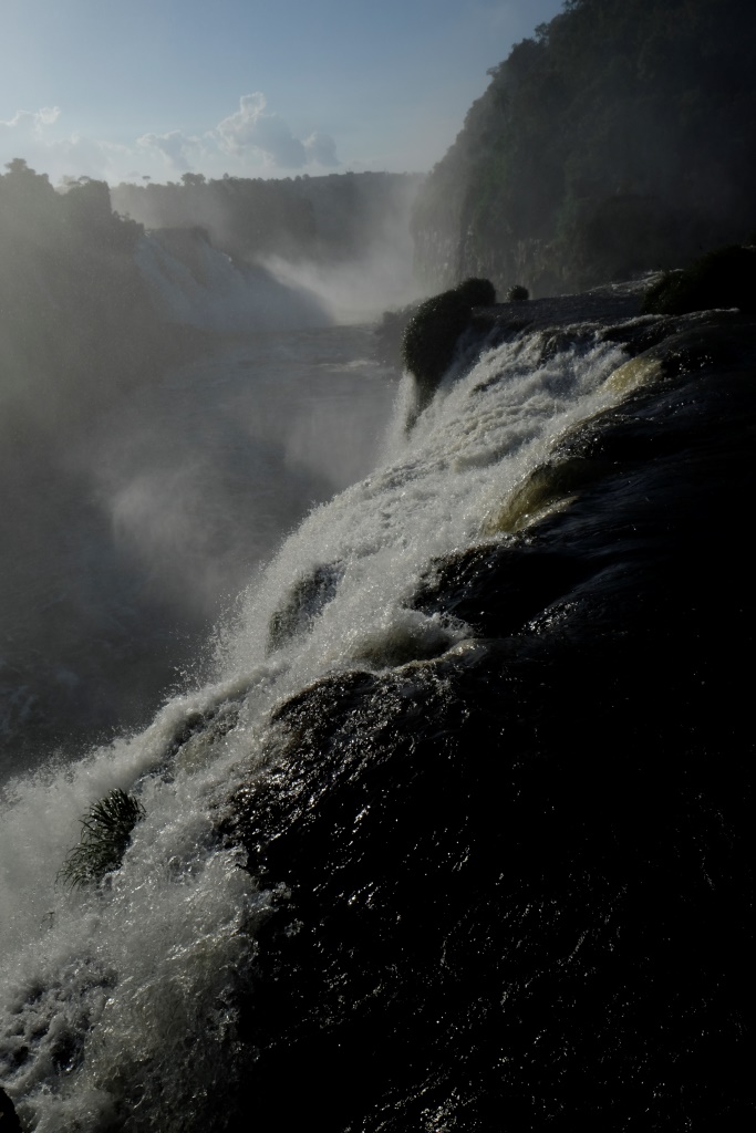 Pirms četriem esam galā, sarunājam tikšanās vietu un es sēžos nacionālā parka transfēra autobusā, kas nogādā tūristus pie pastaigu takām un ūdenskritumiem. Šeit ir viena galvenā taka, kas ved gar upi un no kuras var redzēt ūdens tērces. Ko mēs darām šādās situācijās? Salīdzinām, protams! Argentīnas puse piedāvā lielāku daudzveidību, garākus pārgājiena maršrutus un attiecīgi skatu punktus, bet šejienes, Brazīlijas puse, ļauj piekļūt ūdenskritumiem daudz tuvāk. Viss ir koncentrētāk un iespaidīgāk. Lūk, jums ieskatam trīs īsi video.