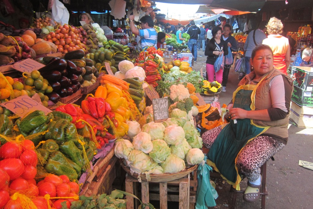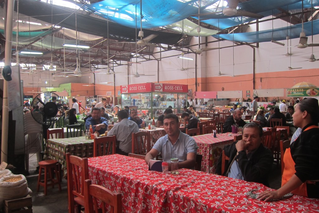 Krāšņuma un raibuma nogurdinātas, soļojam uz nākamo tirgu – Mercado 1. Tas ir gatavo ēdienu tirgus, vietējie šeit nāk ieturēties. Šobrīd ir pusdienas laiks un vairums galdiņu ir aizņemti. Mēs ejam gar tiem un ziņkārīgi lūkojamies ēdāju šķīvjos, meklējot ko tādu, kas izskatīsies tīkami mūsu vēderiem. Beigās vienojamies par nelielu ūķīti tirgus malā – mani uzrunā zivju zupa, bet Marjolenu tortilja. Tā nu mēs smuki paēdam par aptuveni 3 USD abas. Es saku Marjoleinai, ka viņa izskatās traki amizanti šajā vietā. Marjolena ir viena no tām sievietēm, kas pat maisā izskatās eleganti. Un viņa nav maisā, bet gan melnā plānas vilnas kleitā, smalkās brillēs un .. kedām kājās. Tās vienīgās te iederas.