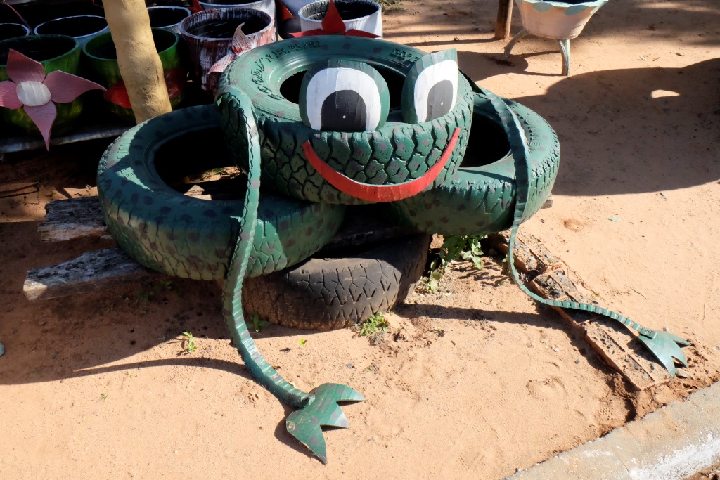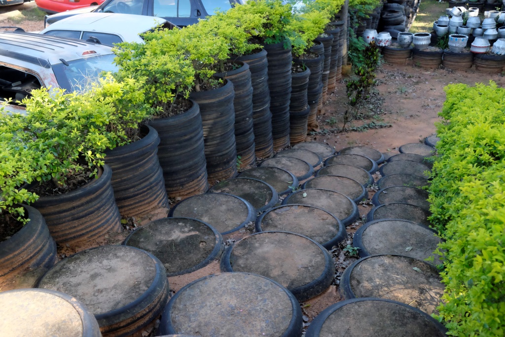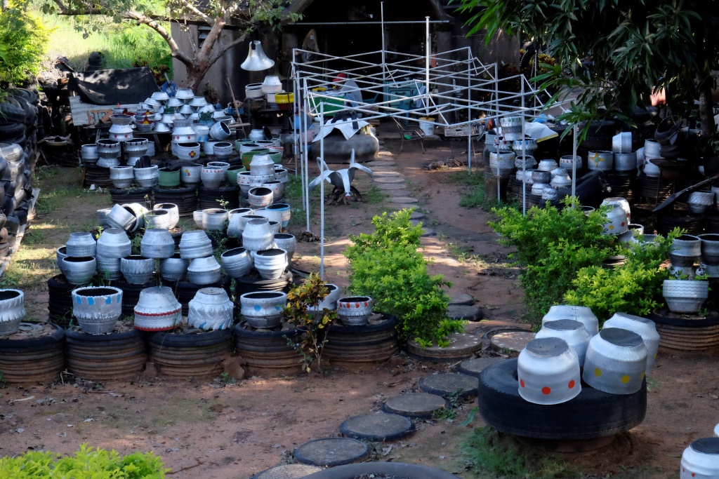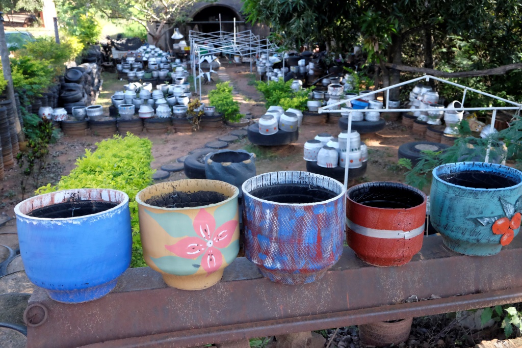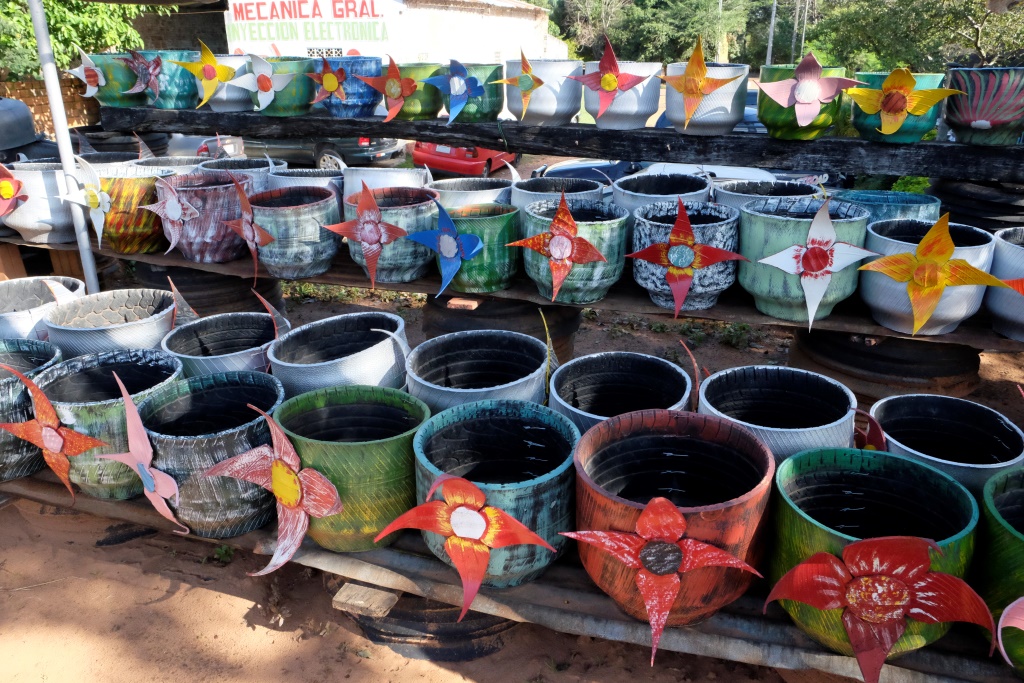 Vakar, klīstot pa Paragvajas ārēm, ceļmalā ieraudzīju māla podus. Pārāk gaumīgi gan tie nav, pa gabalu novērtēju „mākslu”, bet noteiktām vietām un situācijām derētu. Nez ko tas Pūķis Riepulis tur dara? Jāiet un jāizpēta tuvāk. Kad pieeju tuvāk, saprotu, ka viss, kas šeit tapis, ir tapis no vecām riepām, tai skaitā arī „māla podi”.