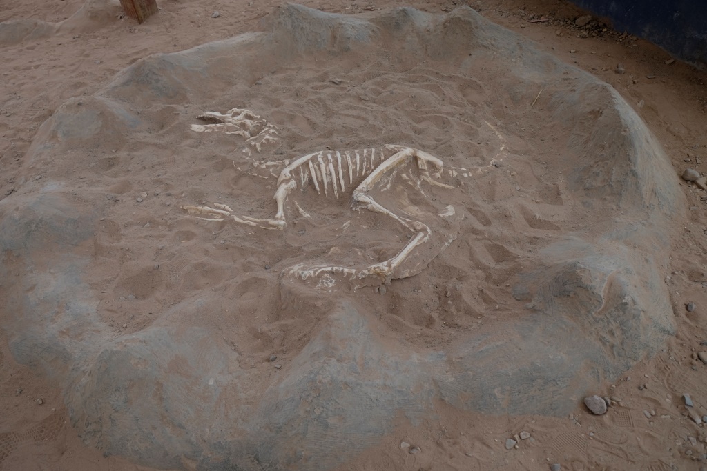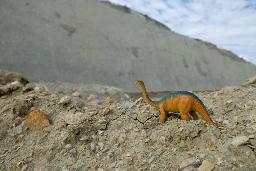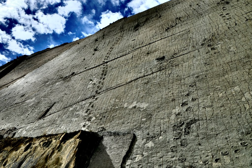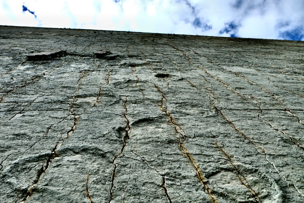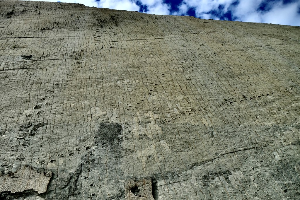 Sākas ekskursija un gida pavadībā nokāpjam lejā no kalna, esam stāvas sienas priekšā, kas savulaik bijusi horizontāla un pa to pēdojuši dinozauri. Gids apgalvo, ka šī ir pasaulē lielākā dinozauru pēdu kolekcija, pašlaik šie saskaitījuši vairāk nekā 10 000 pēdu nospiedumus. Viņš demonstrē mums mazas dinozauru figūriņas, stāstot, kuras pēdas pieder kuras zortes dinozauram. Pēdu nospiedumus atradusi blakus esošā cementa rūpnīca, tagad šī teritorija ir iekonservēta, apkaimē tiekot atrastas arvien jaunas pēdas.