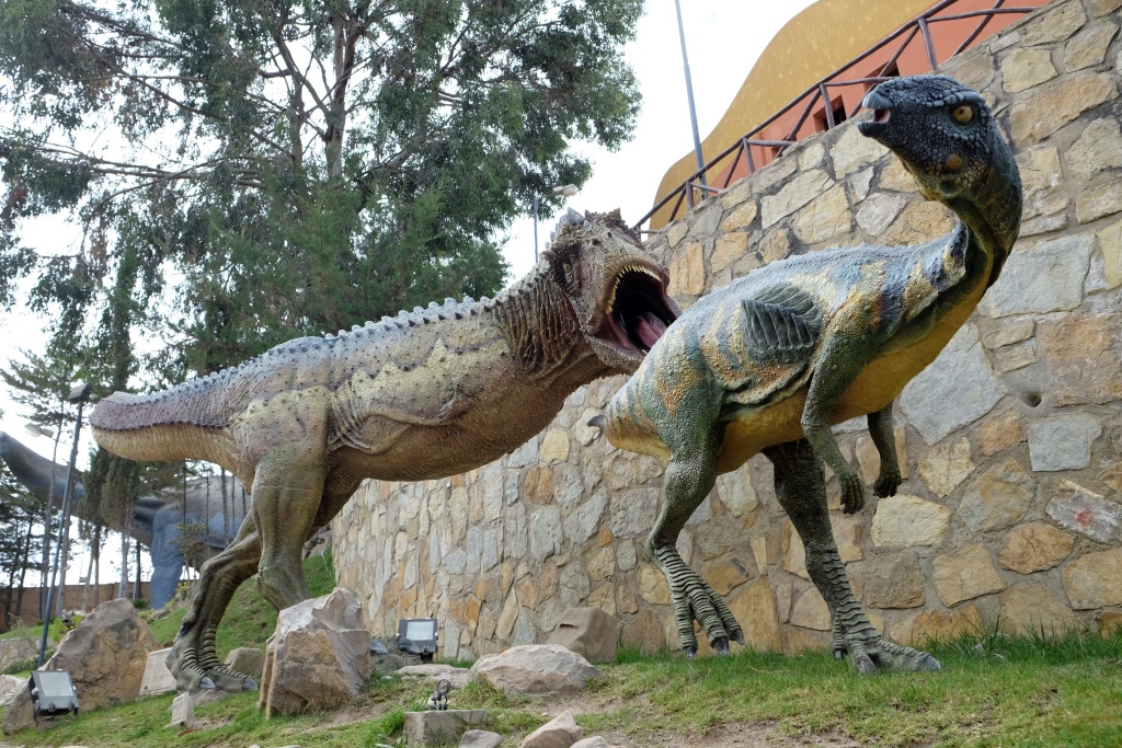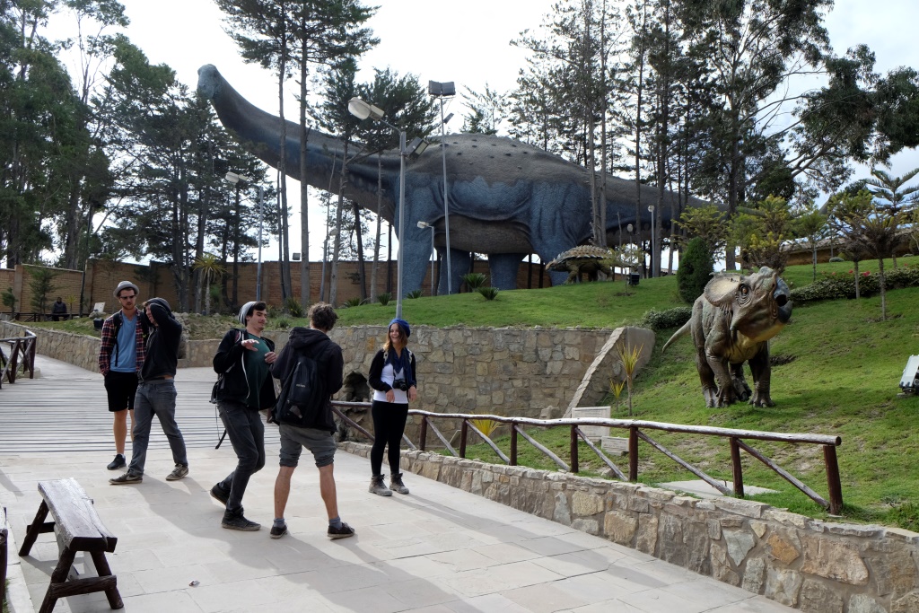 Šoferis mūs izlaiž pie milzīgas cementa rūpnīcas un apgalvo, ka esam klāt, vēl tikai jāpaiet neliels gabaliņš jāpaiet kājām. Par ieeju samaksājam 30 boliviano, vēl 5 jāpiemaksā par iespēju fotografēt, nopērkam uz visiem vienu. Dinozauru pasaules iepazīšanu sākam ar BBC dokumentālās filmas noskatīšanos, tad gide mūs sauc tālāk – pēc dažām minūtēm sākšoties ekskursija. Aizejam līdz vietai, kur izsniedz ķiveres, jo ekskursijas gaitā no stāvas sienas mēdzot krist lejā akmeņi, un… ko es tur redzu. Stāv mani trīs divdesmitgadīgie brieži kā dzīvi – Olafs, Eliots un Finlijs. Dažu dienu laikā šī ir ceturtā reize, kad mēs (ne)jauši satiekamies. Puiši ir tikuši vaļā no meitenēm un pievienojuši savai kompānijai vēl vienu holandiešu jaunieti. Iepazīstinu jaunos draugus ar „vecajiem”, šie ātri atrod kopīgu valodu.