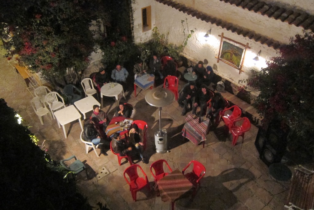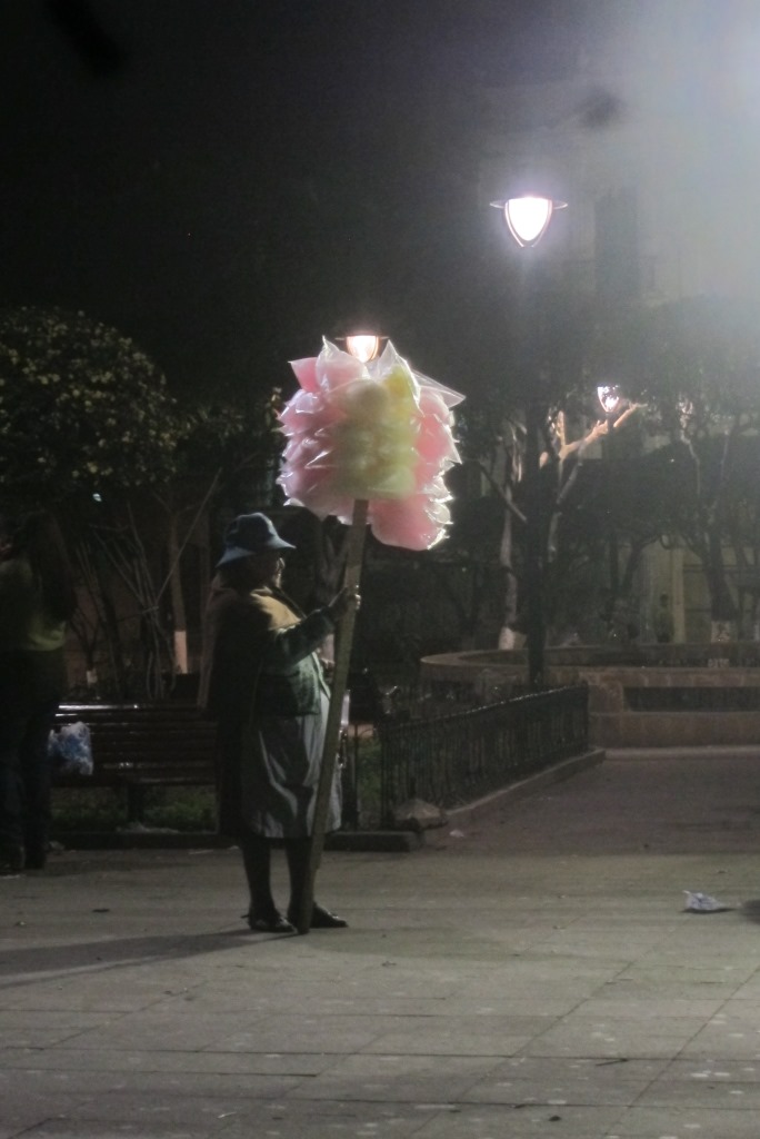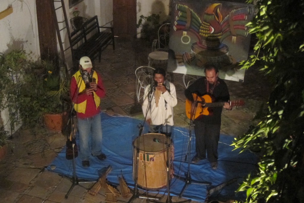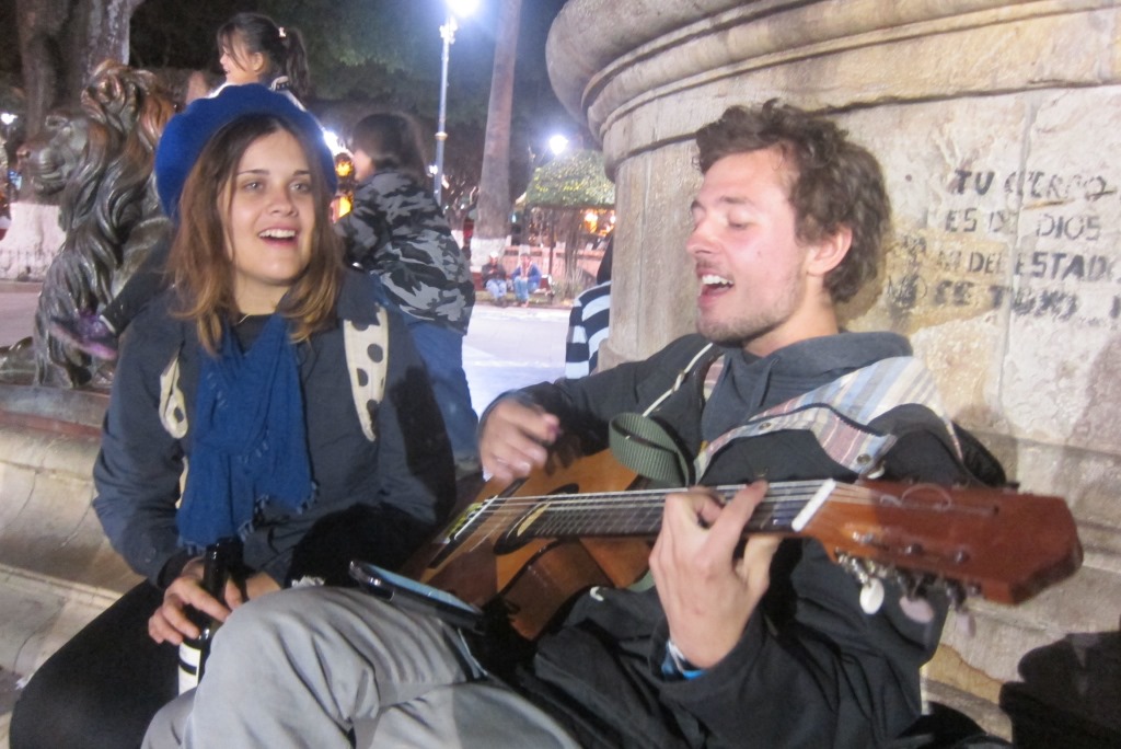 Vakara noslēgumā aizejam uz centrālo laukumu, esam izdīkušas, lai Gerions paspēlē ģitāru. Neviļus mums pievienojas pāris puiši no hosteļa, bet laukumā vēl daži vietējie puiši un suņi. Melns skaistulis (suns) neatkāpjas ne soli no Taisas un seko mums līdzi uz koncertu mīlīgā pagalmiņā, uz kuru mūs uzaicina vietējie. Taisa ir dejotāja un es ar vieglu skaudību skatos, kā par spīti vīna un alus ietekmei, smukā meitene griež dančus ne pa jokam. Es arī nodarbojos ar to, ko protu vislabāk – socializējos un pļāpāju ar blakus galdiņa puišiem no Portugāles. Viņi man rāda bildes no šī rīta pasākuma laukumā – izradās, ka šodien šeit bija ieradies prezidents Evo Moraless. Rafaēls arī šo prezidentu satika savā Bolīvijas apmeklējuma laikā – Moralesam bijis interesanti aprunāties ar ārzemniekiem un Rafaēls kopā ar ceļabiedriem ticis uzaicināts uz svinīgu ceremoniju un futbola spēli VIP viesu statusā.